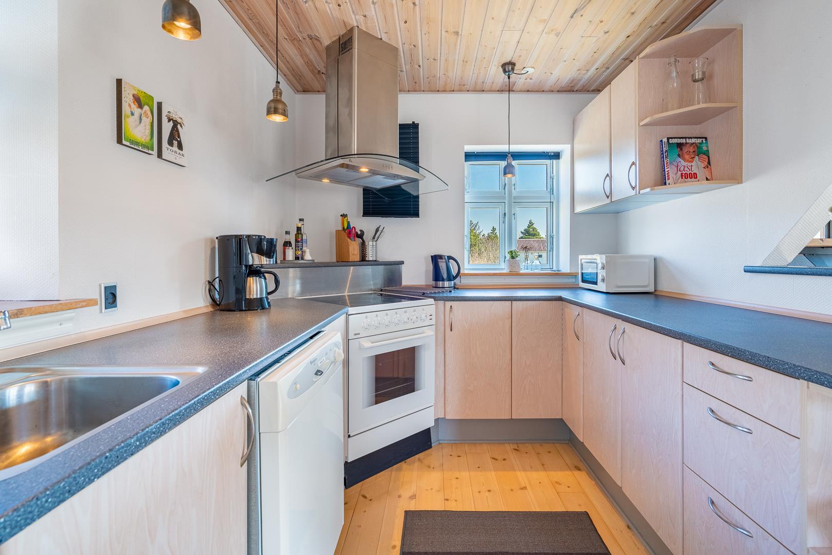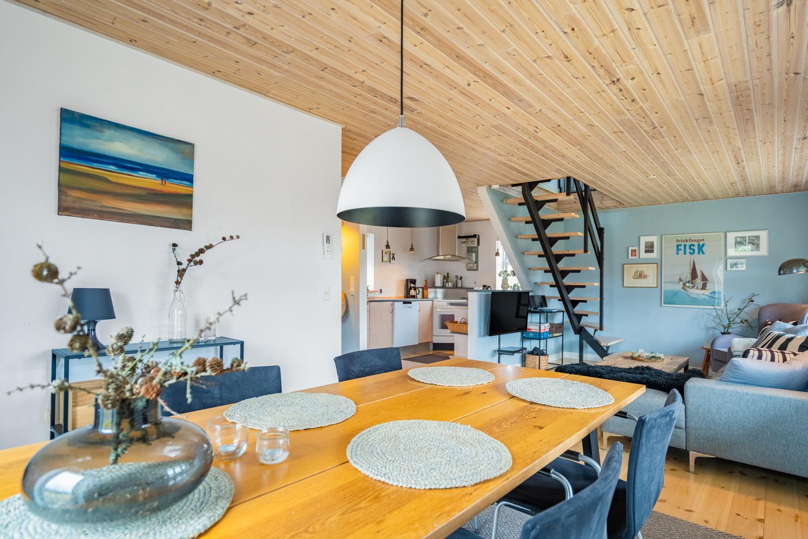 Der offene Wohn- und Essbereich ist das Herzstück des Ferienhauses – hier wird gegessen, gelacht und entspannt. Große Fenster bringen viel Licht ins Innere und schaffen eine freundliche, einladende Atmosphäre. Die moderne Küche ist voll ausgestattet – mit Spülmaschine, Herd, Kühlschrank und allem, was ihr zum Kochen braucht. So wird Selbstversorgung im Urlaub ganz einfach.
