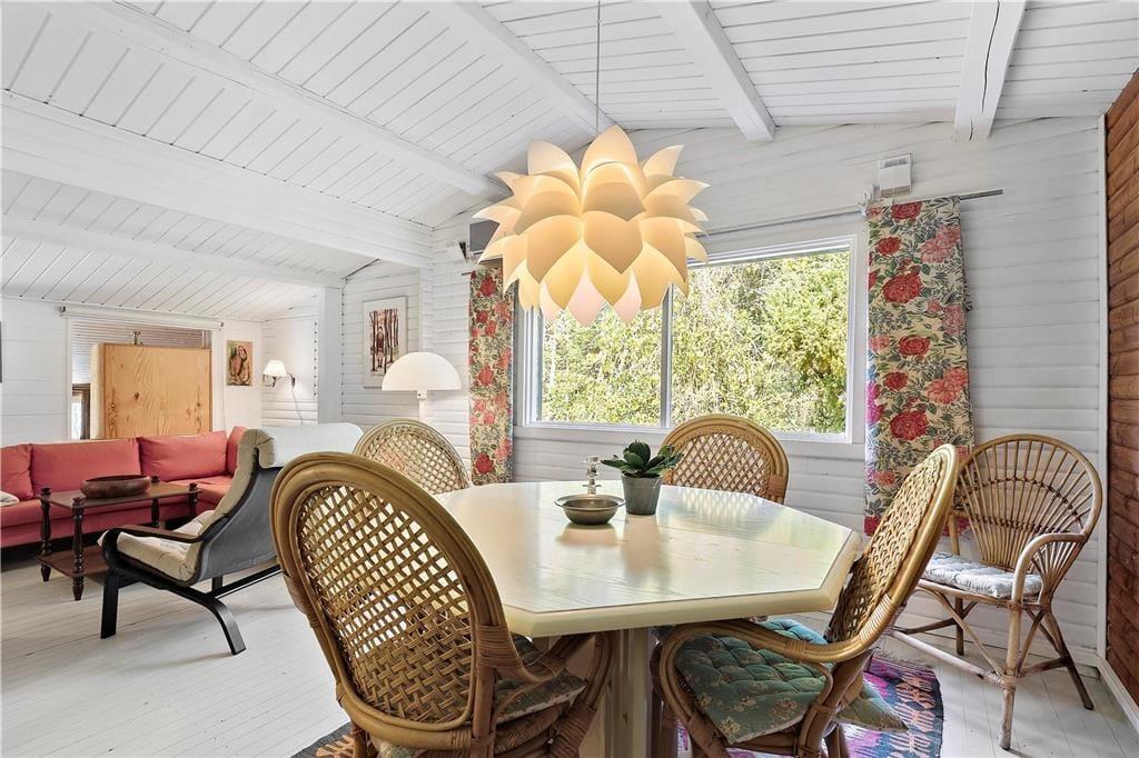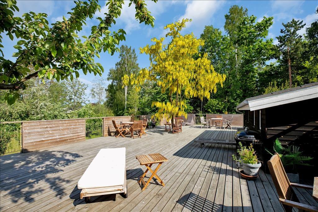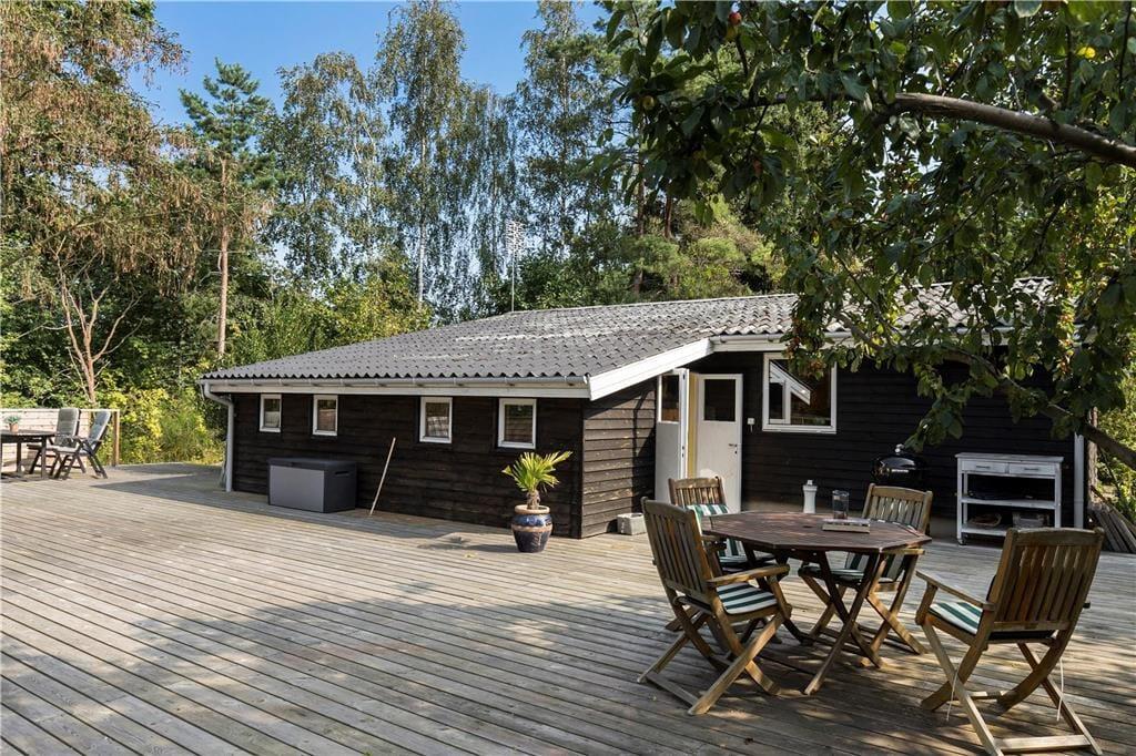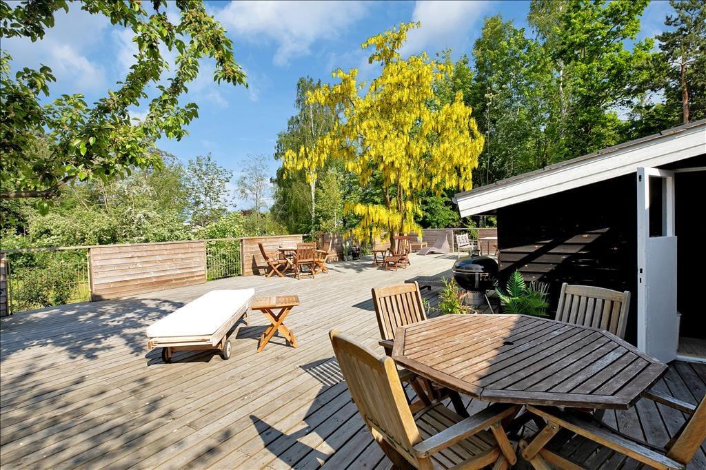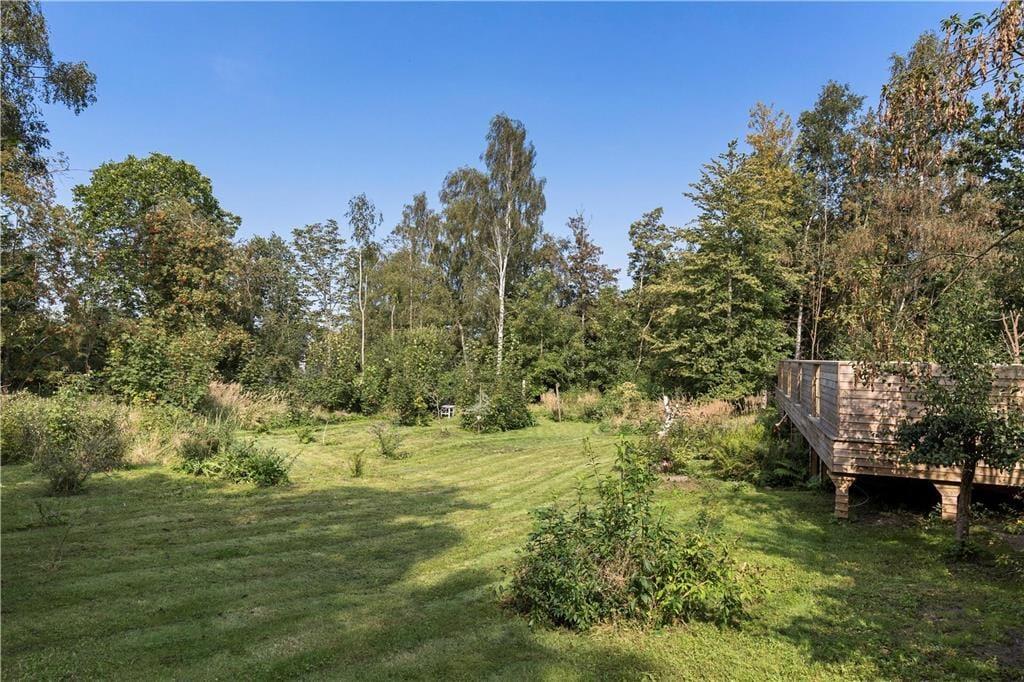 Draußen erwartet euch eine große, wunderschöne Holzterrasse, die auf Stelzen errichtet wurde und einen großartigen Blick auf das weitläufige Naturgrundstück mit verstreuter Bepflanzung bietet. Das Leben auf der Terrasse mit Eis oder mit Erdbeeren und Sahne ist genau das, was den dänischen Sommer ausmacht – echte Gemütlichkeit in bester Gesellschaft. Hier könnt ihr Ball spielen, Tennis oder Badminton spielen oder einen Drachen steigen lassen. Die Kinder werden es lieben, Verstecken zu spielen oder Höhlen im Gebüsch zu bauen.