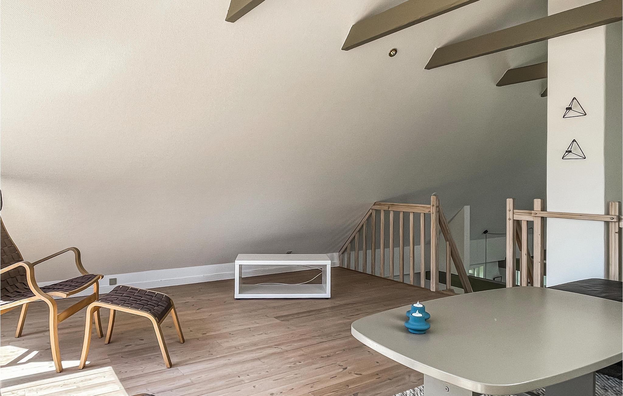 Das zweistöckige Ferienhaus ist dank offenen Raumkonzept bis zu den sichtbaren Holzbalken in der Decke, was eine geräumige und gemütliche Atmosphäre hervorruft. Im Erdgeschoss finden Sie die offene, gut ausgestattete Küche mit Essbereich, zwei große Schlafzimmer und ein Badezimmer mit Fußbodenheizung. Von der Küche führt eine relativ steile Treppe hinauf zum Wohnzimmer, wo Sie in bequemen Möbeln fernsehen können und von wo Sie auf eine schöne Terrasse mit Loungemöbeln und weitem Blick in die schöne, ländliche Umgebung bis zur Rundkirche von Olsker gelangen. Im Hauswirtschaftsraum des Hauses finden Sie eine Waschmaschine.