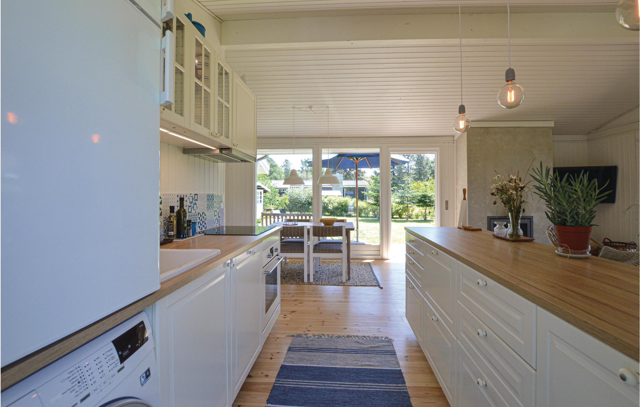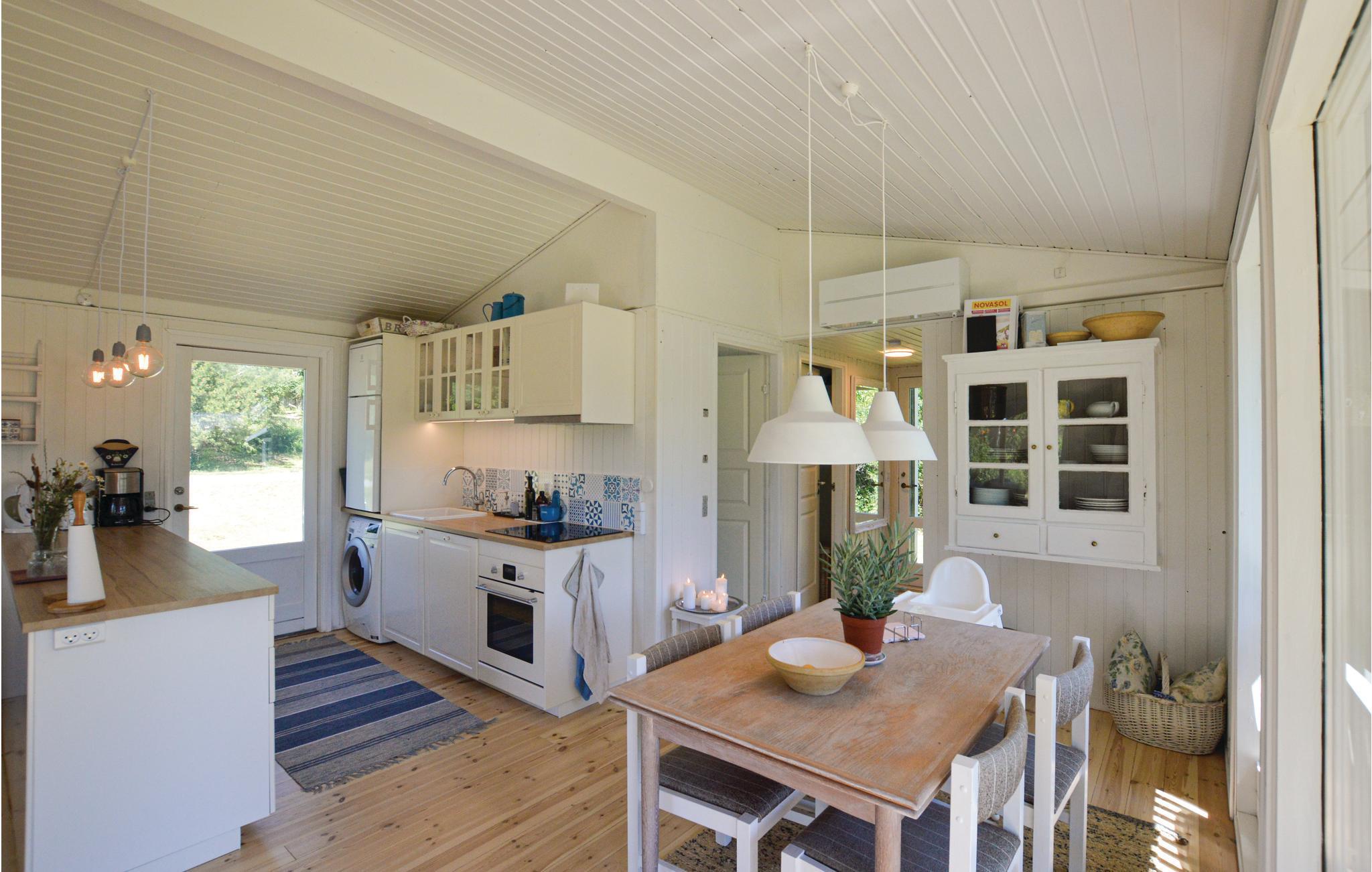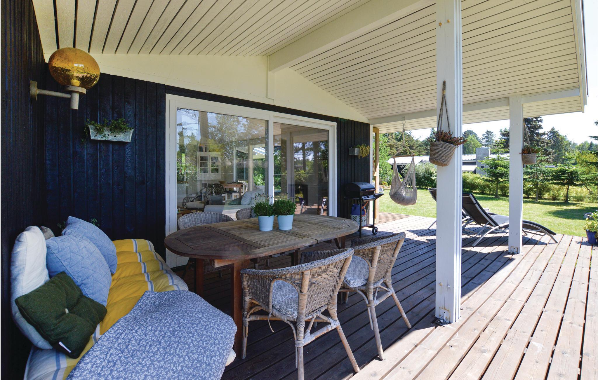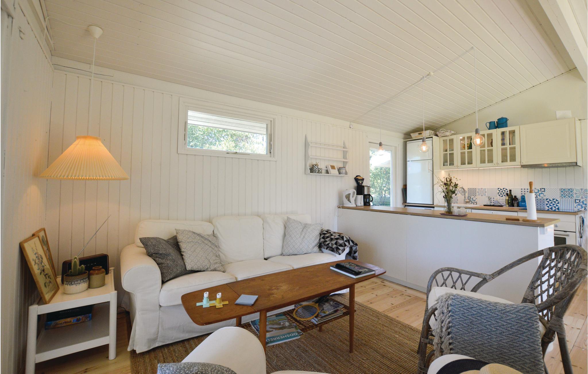 Ein schönes Ferienhaus mit großer Terrassenfläche, die teilweise überdacht ist. Es gibt eine Küche, die in offener Verbindung zum Wohnraum mit Kaminofen liegt, ein Badezimmer, zwei Schlafzimmer und die Möglichkeit für extra Schlafraum im nicht isolierten Nebengebäude.