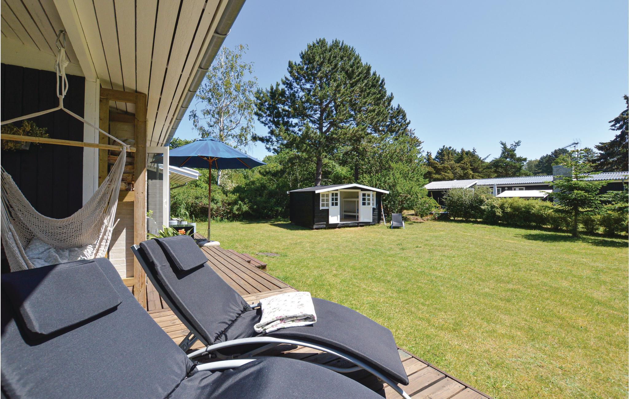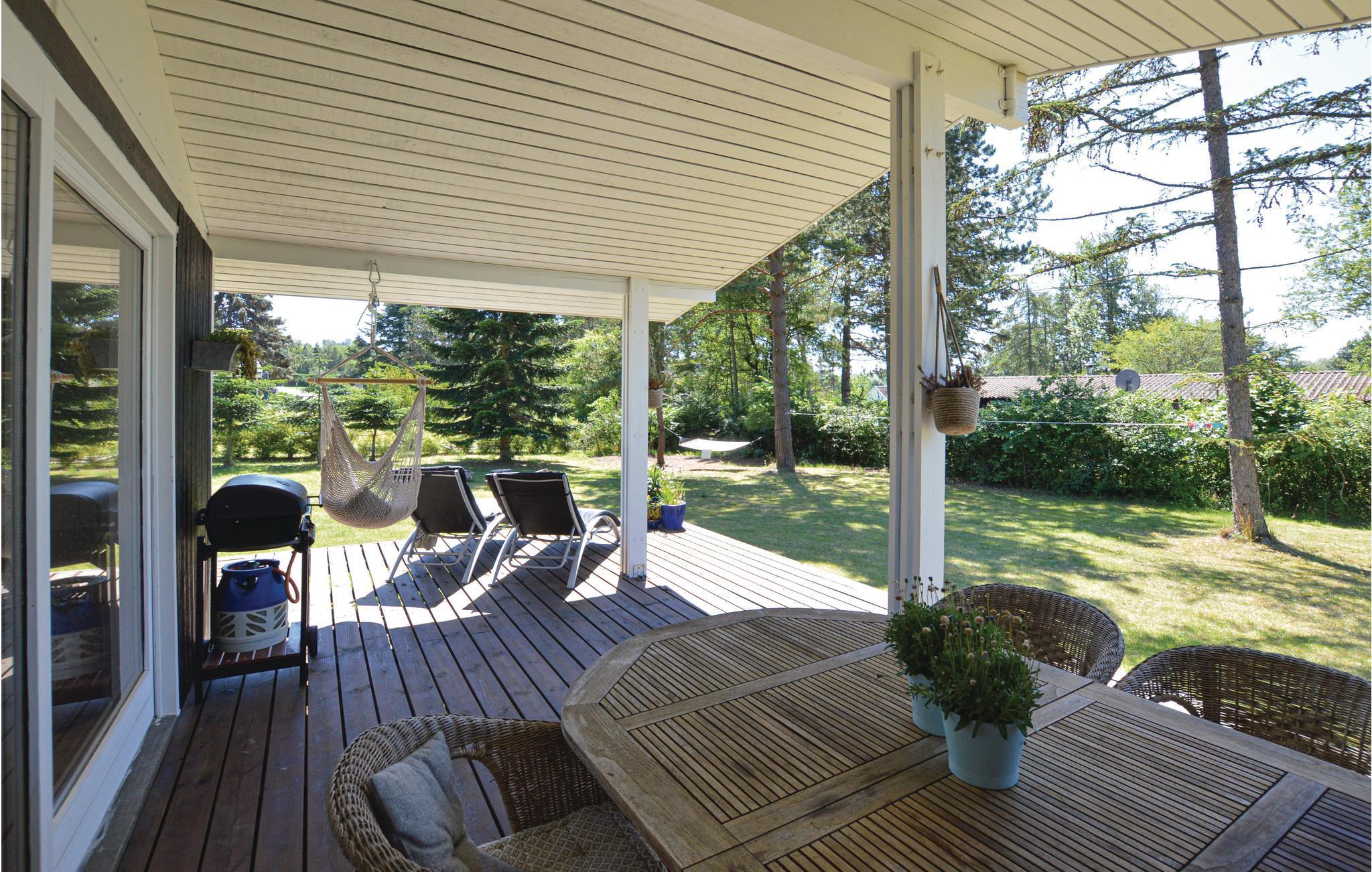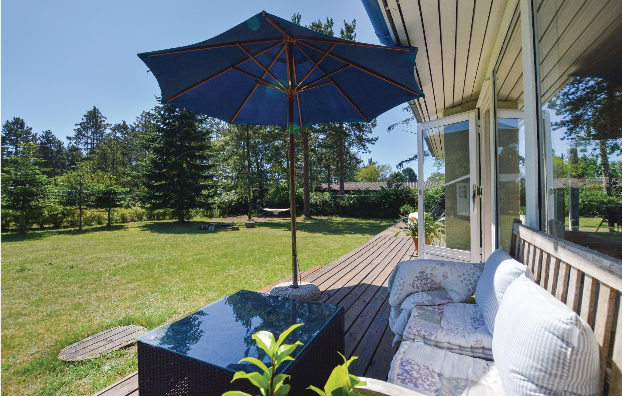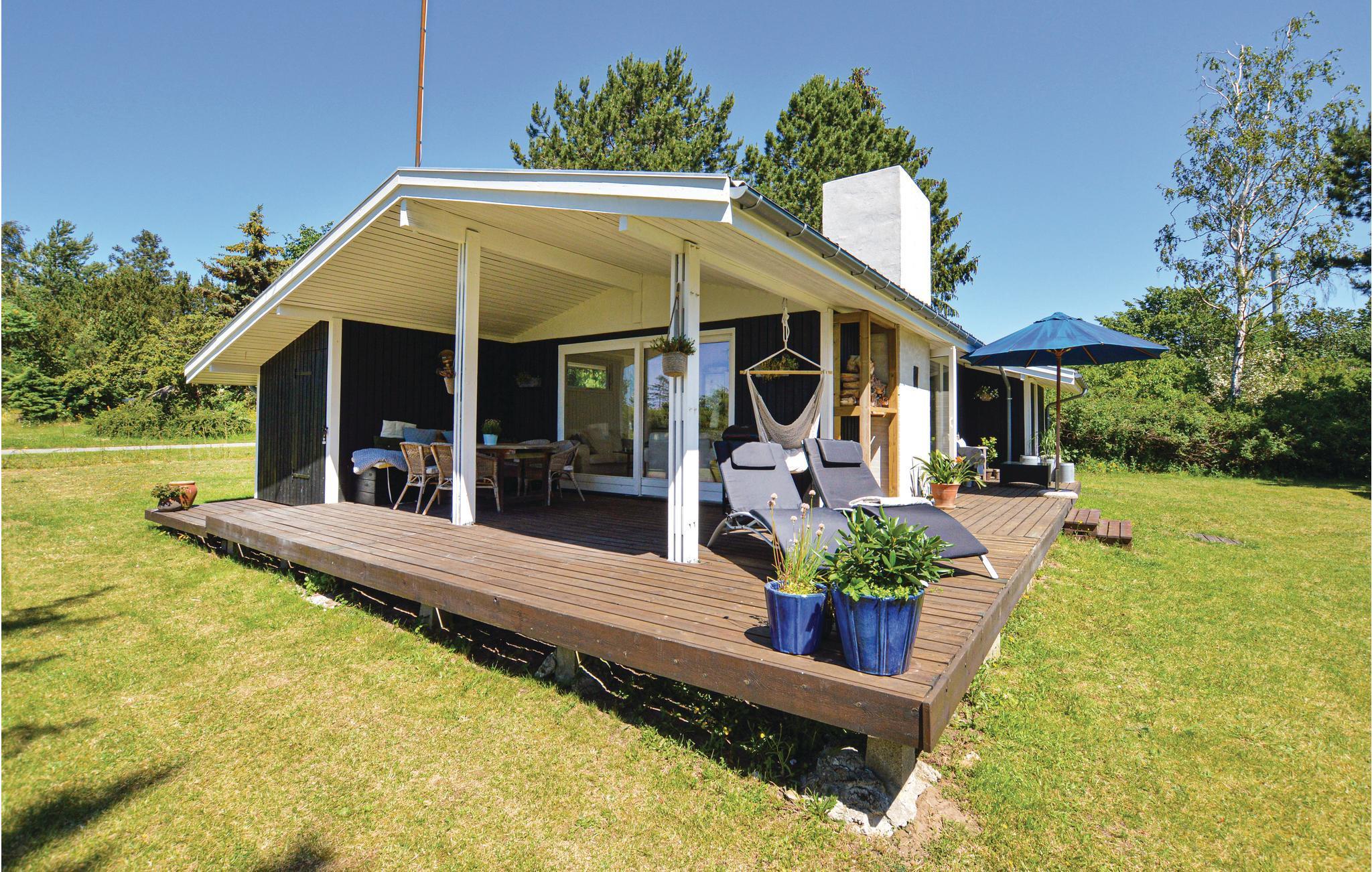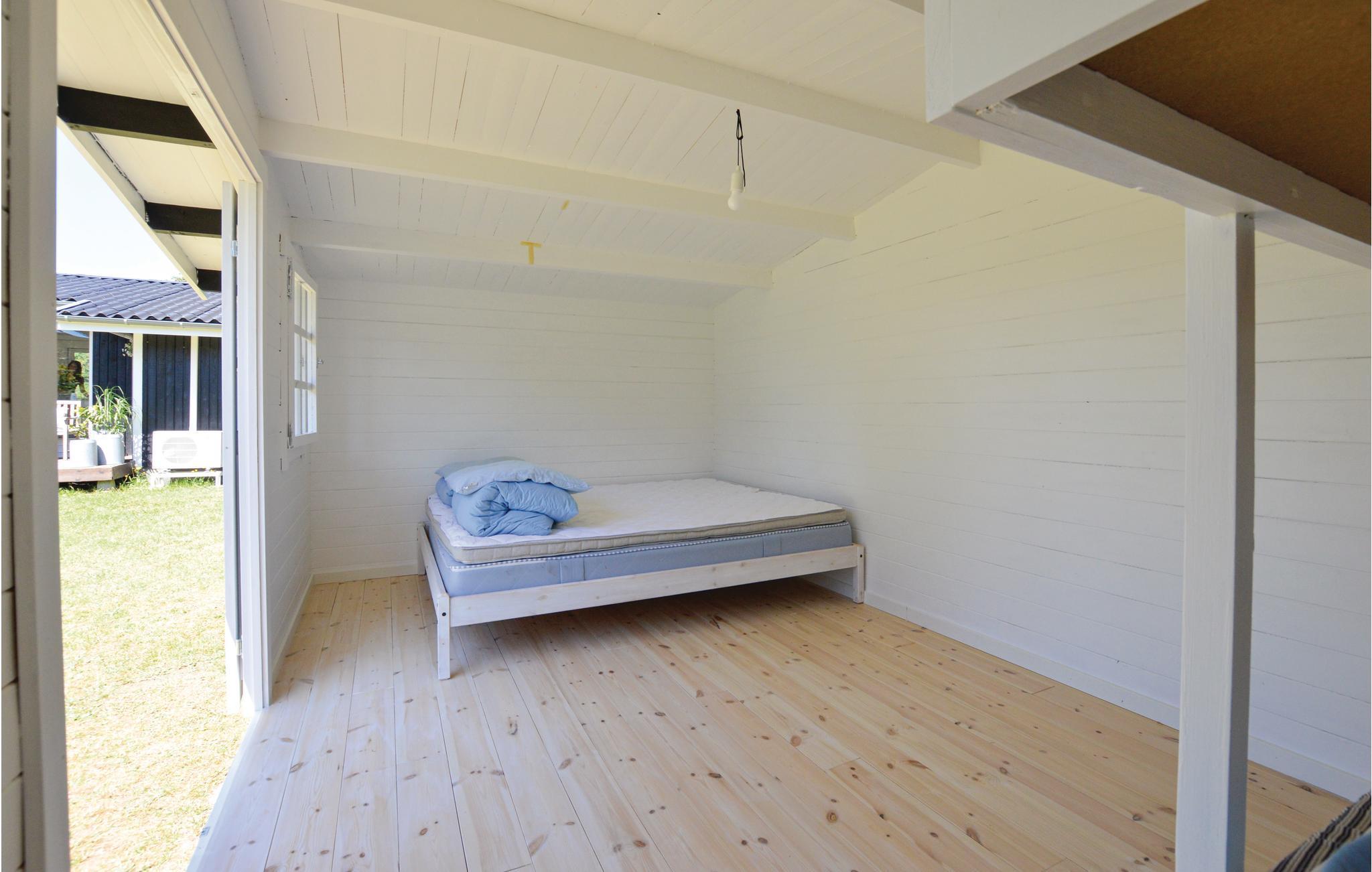 Ein schönes Ferienhaus mit großer Terrassenfläche, die teilweise überdacht ist. Es gibt eine Küche, die in offener Verbindung zum Wohnraum mit Kaminofen liegt, ein Badezimmer, zwei Schlafzimmer und die Möglichkeit für extra Schlafraum im nicht isolierten Nebengebäude.