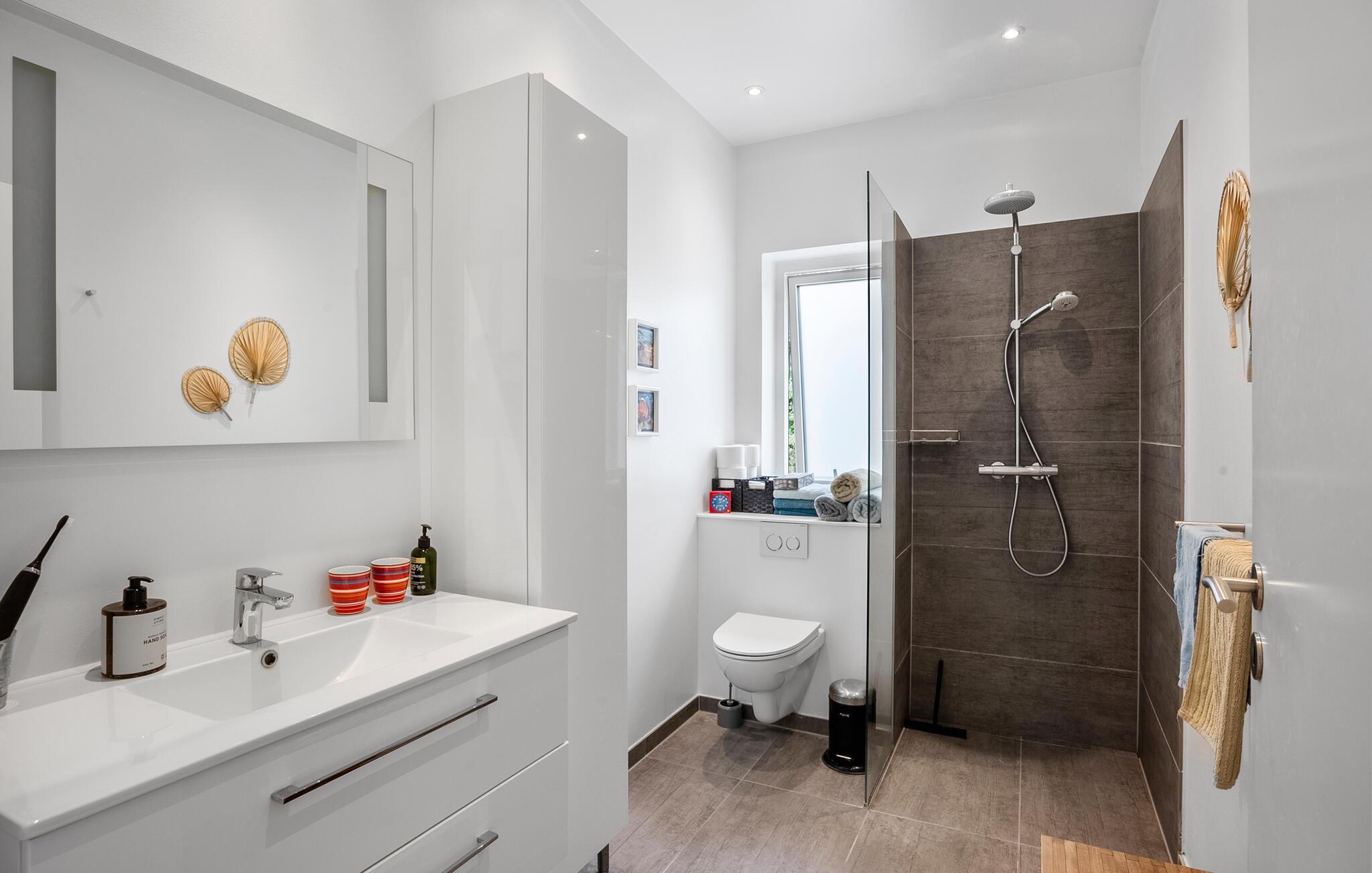 In diesem stilvollen Haus schaffen bodentiefe Fenster, elegante Möbel und freundliche Farbtupfer eine gemütliche Atmosphäre, in der Sie schnell vom Alltag abschalten und neue Energie tanken können. Entspannen Sie sich auf dem bequemen Sofa bei einem Filmabend, zaubern Sie gemeinsam in der modernen Küche eine leckere Mahlzeit und lassen Sie den Abend in fröhlicher Runde bei Brett- oder Kartenspielen ausklingen.