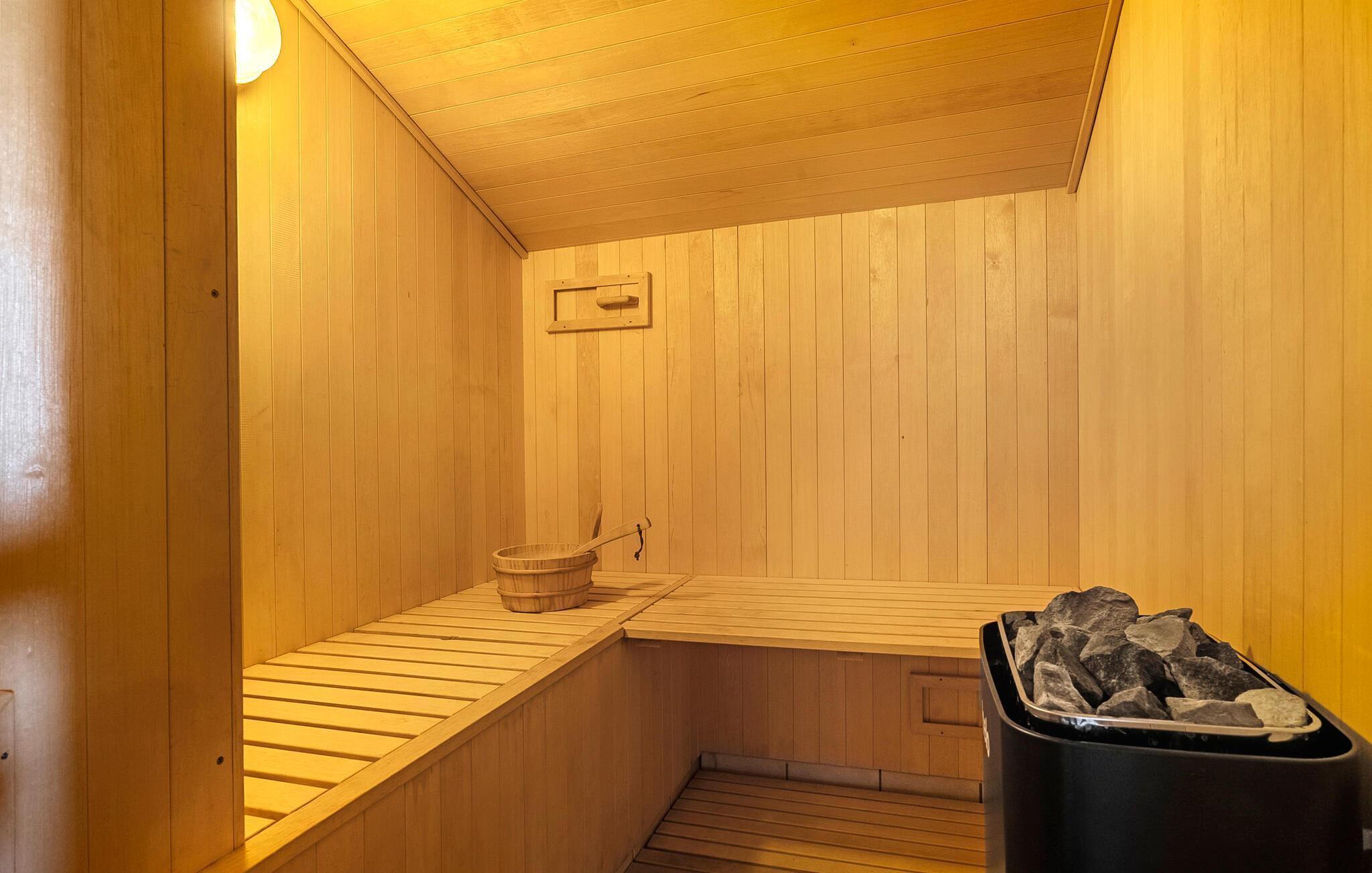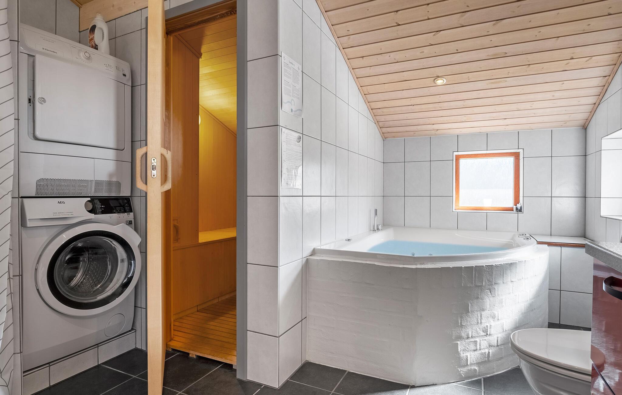 Freuen Sie sich auf den freundlichen Wohnbereich mit hohen Holzdecken, großen Fenstern und einer gemütlichen Atmosphäre. Machen Sie es sich auf dem Sofa bequem oder genießen Sie entspannte Stunden vor dem Kaminofen. Spielen Sie Karten, sehen Sie einen Film oder lassen Sie sich vom Blick ins Grüne inspirieren. Bereiten Sie Ihre Mahlzeiten in der modernen Küche zu und versammeln Sie sich am langen Esstisch zu Frühstück, Abendessen oder geselligen Runden. Wellnessliebhaber kommen im Whirlpool und in der Sauna voll auf ihre Kosten.
