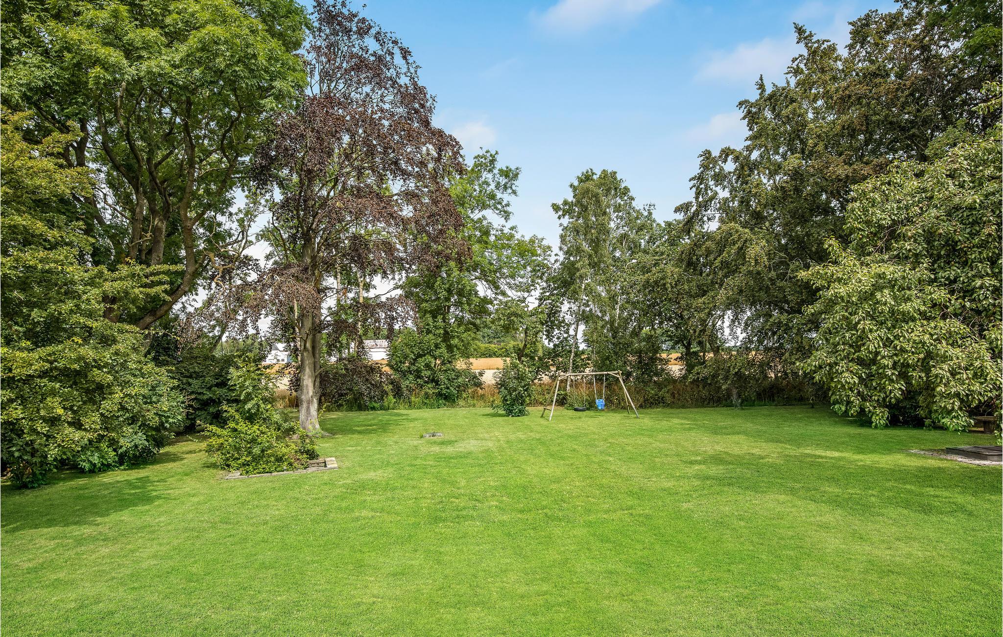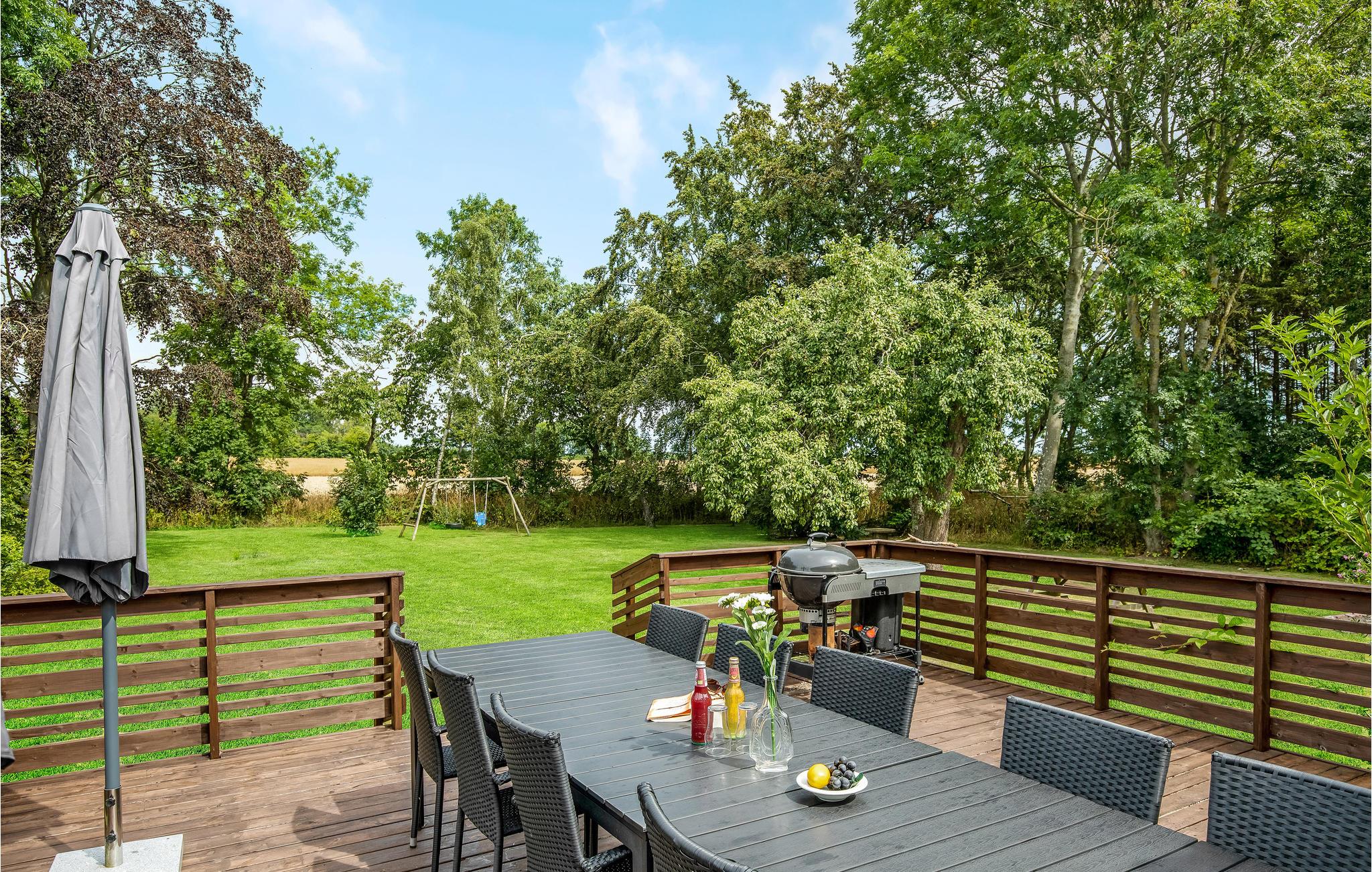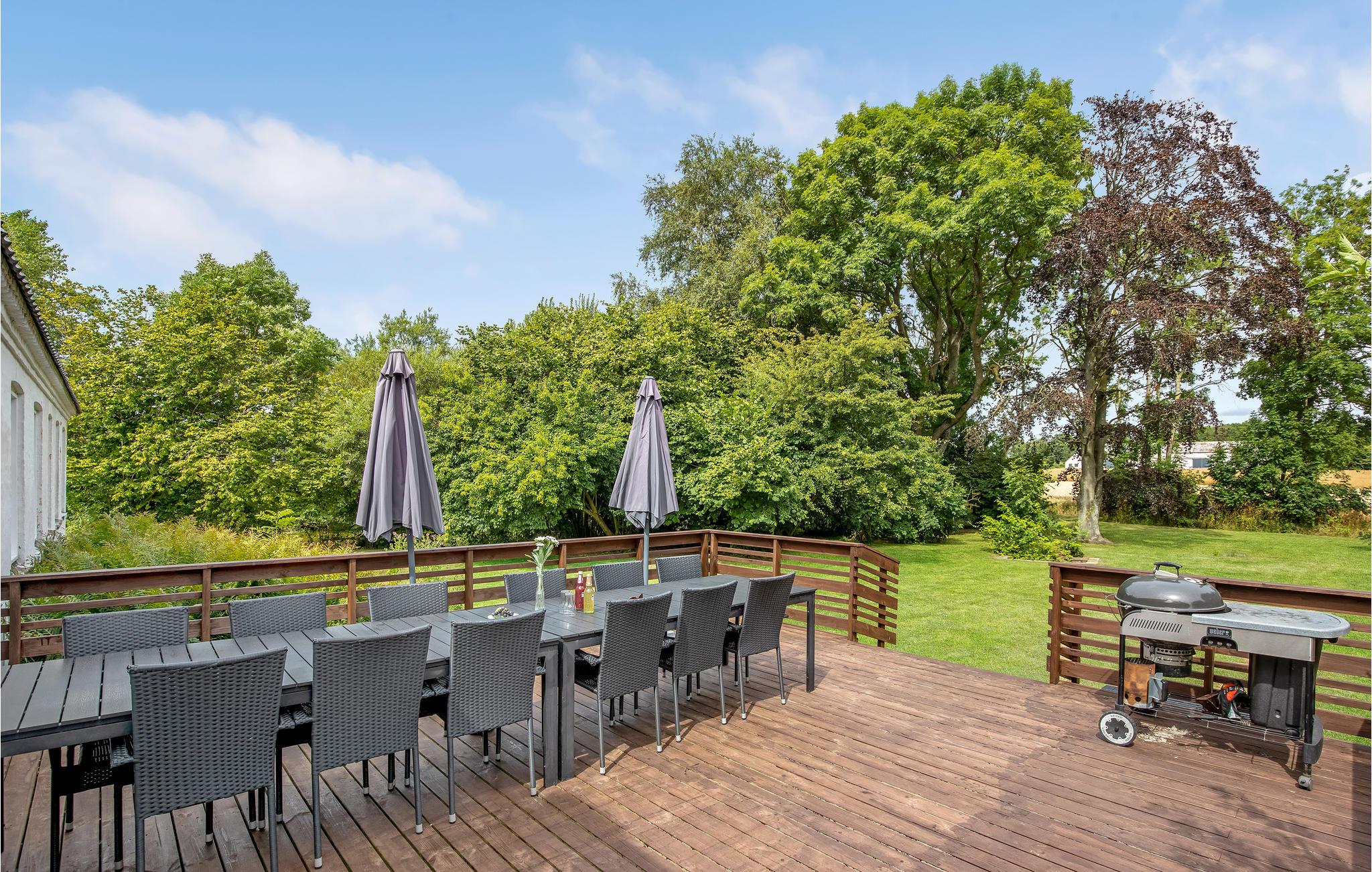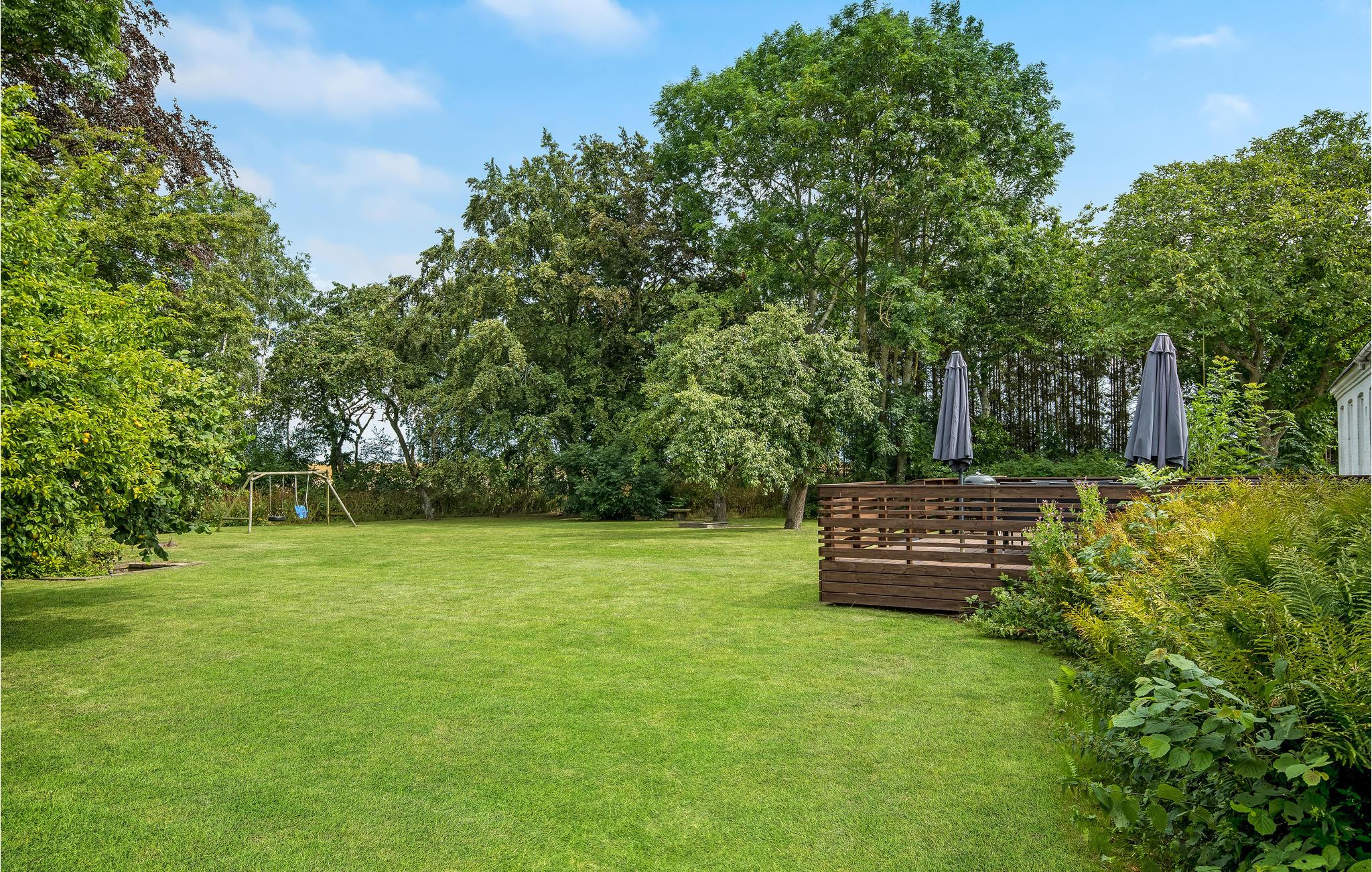 Vor dem Wohnzimmer liegen eine Holzterrasse und ein Garten, der einem Park gleicht. Im Garten gibt es sogar Platz für Ballspiele. Es ist auch ein kleiner See zu finden. Genießen Sie die Ferien hier und eine gemütliche Tour zum nur 2,5 km entfernt liegenden weißen Sandstrand Dueoddes.