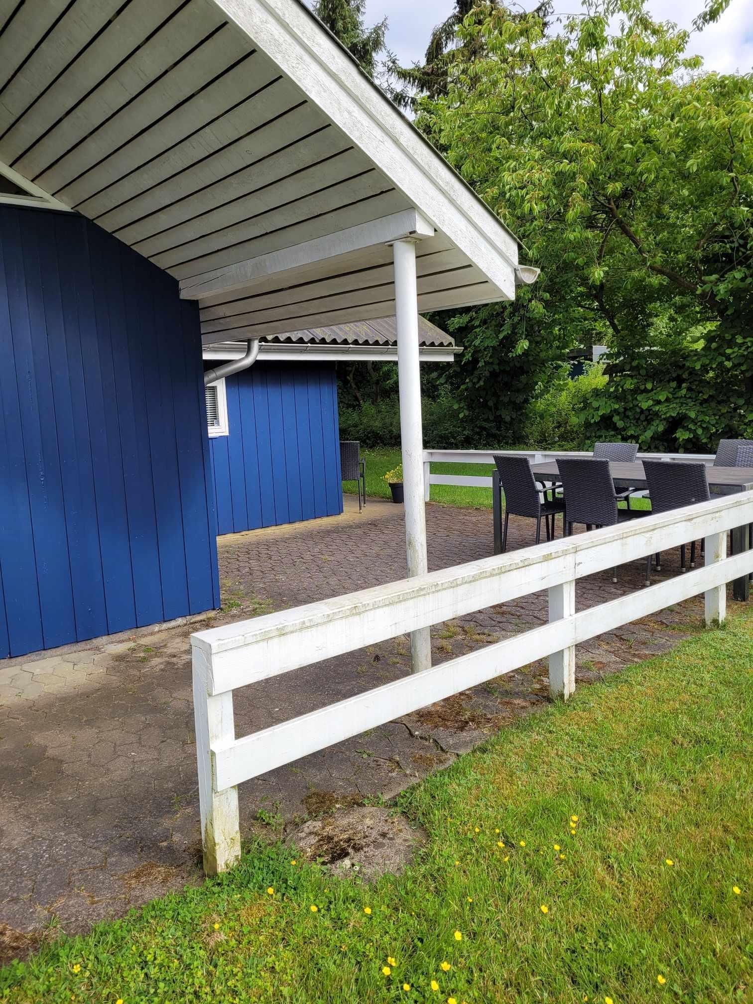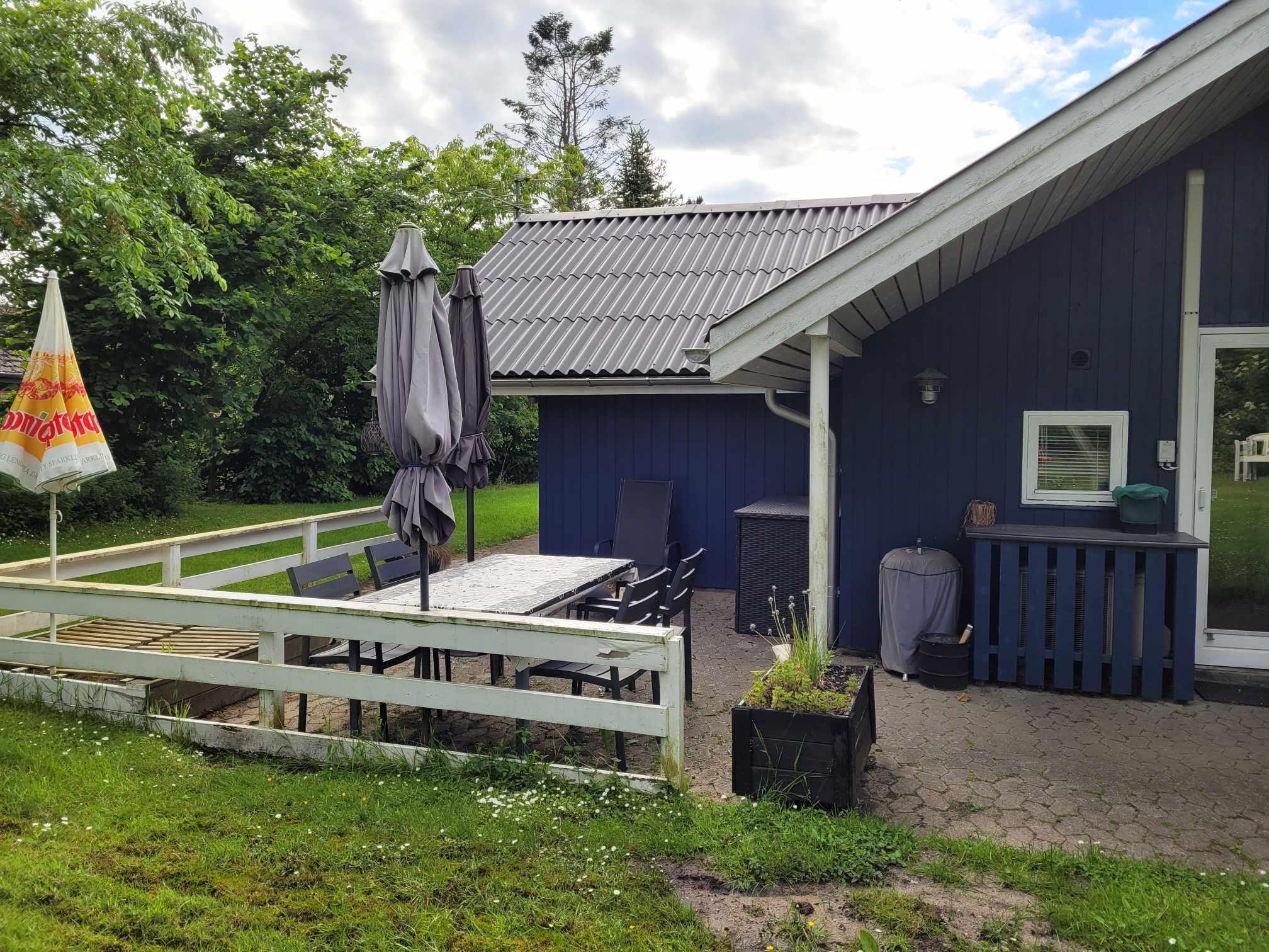 Gemütliches Ferienhaus mit Terrasse und großer Rasenfläche mit Schaukel.