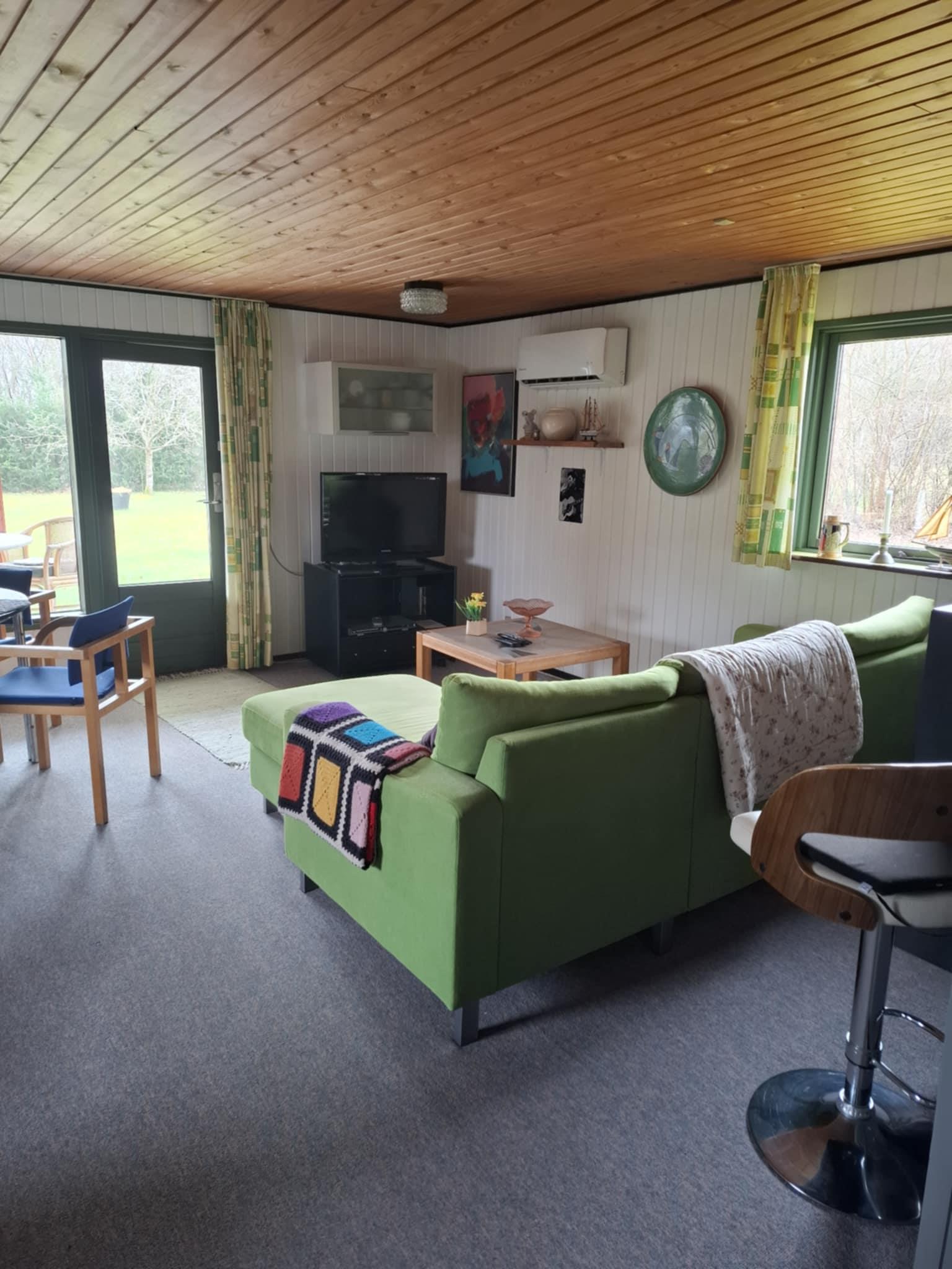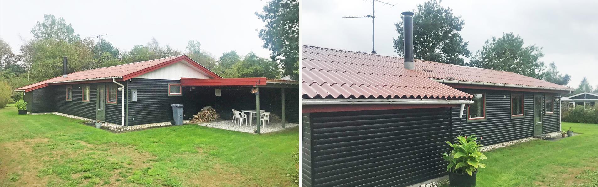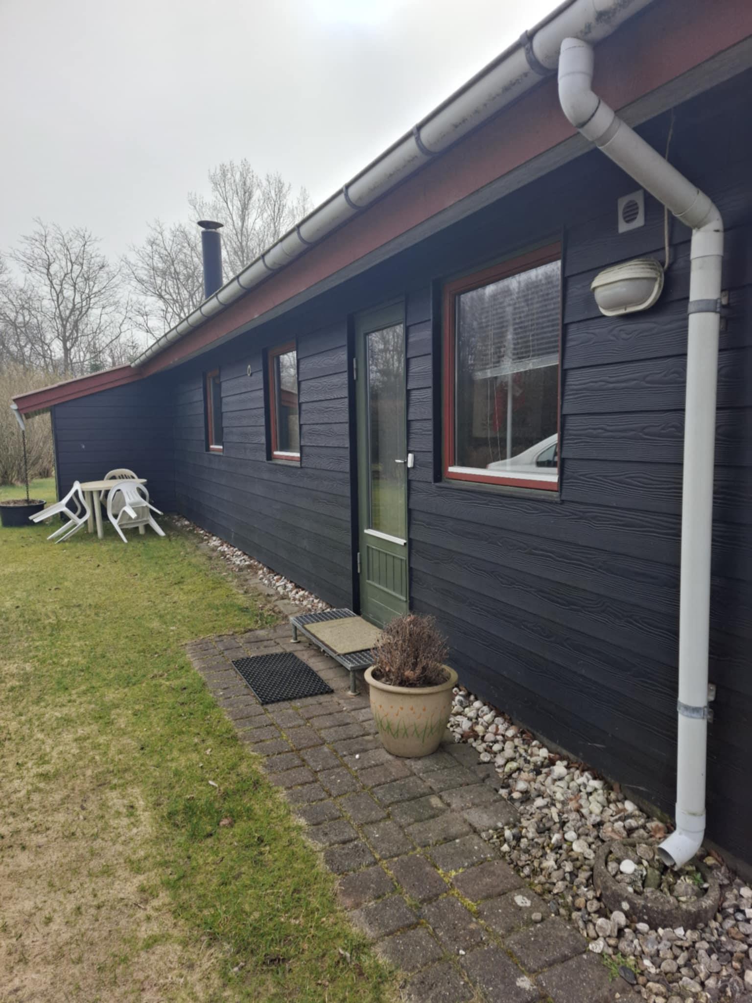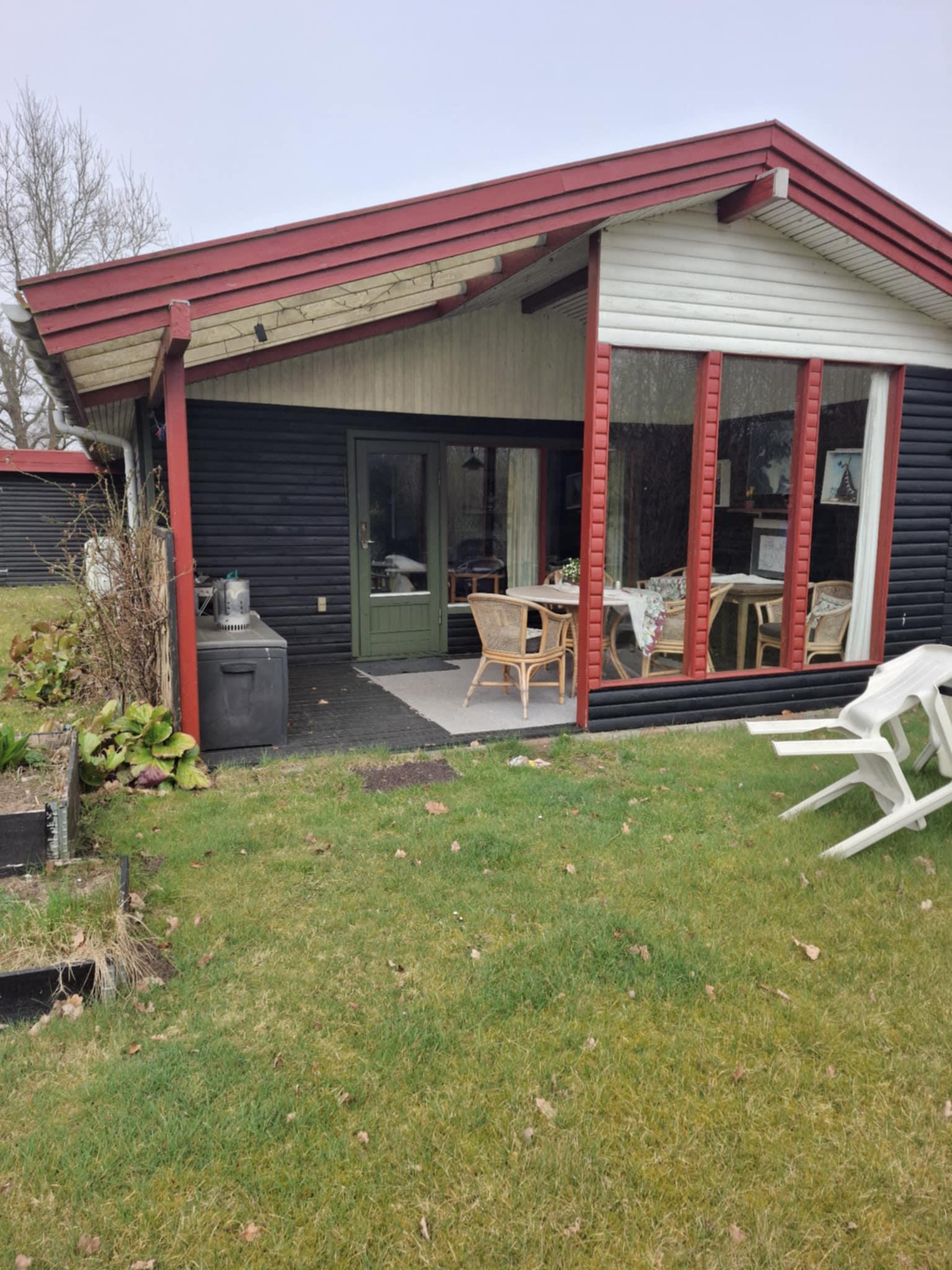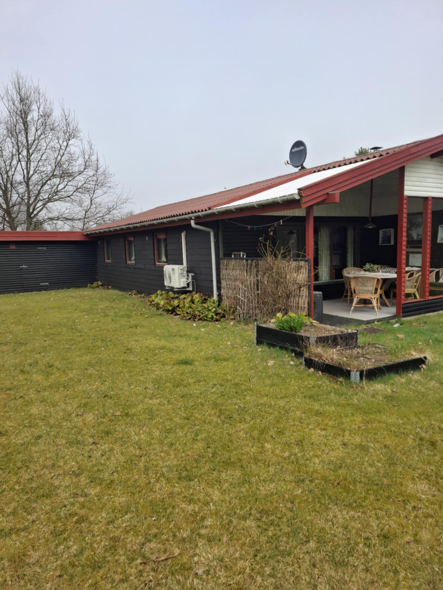 Gemütliches Ferienhaus mit überdachter Terrasse und großer Rasenfläche.