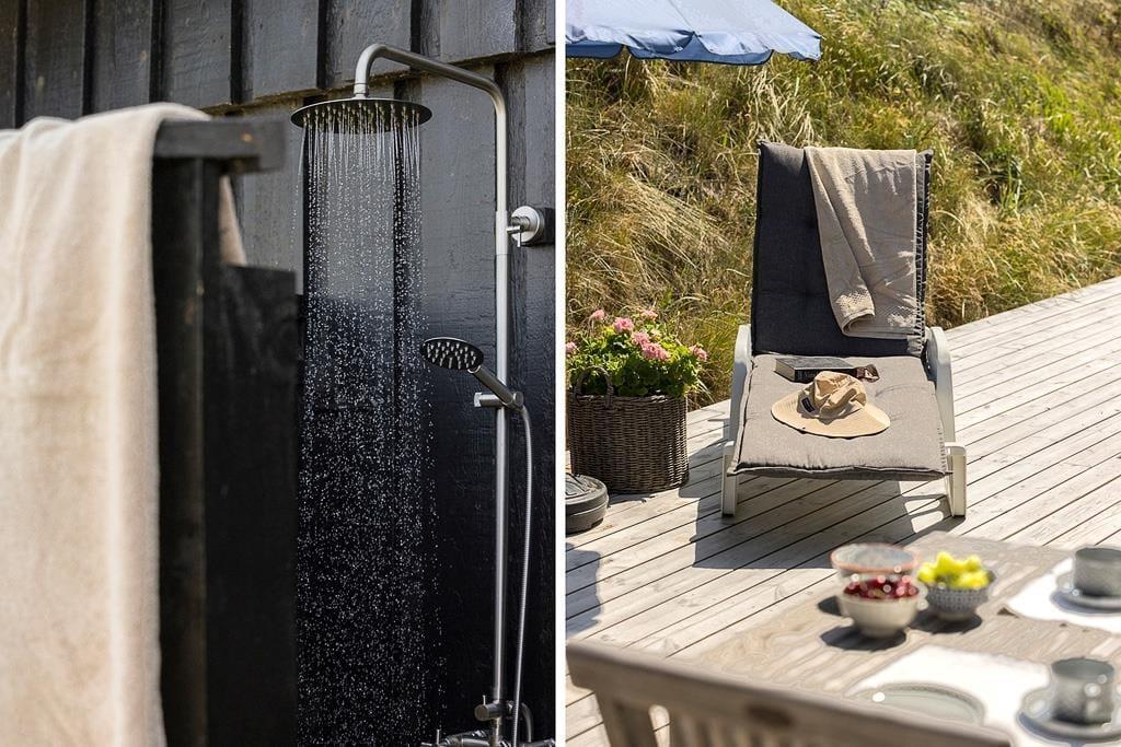 Als zusätzlichen Luxus könnt ihr eine erfrischende Außendusche mit warmem Wasser unter freiem Himmel genießen.
