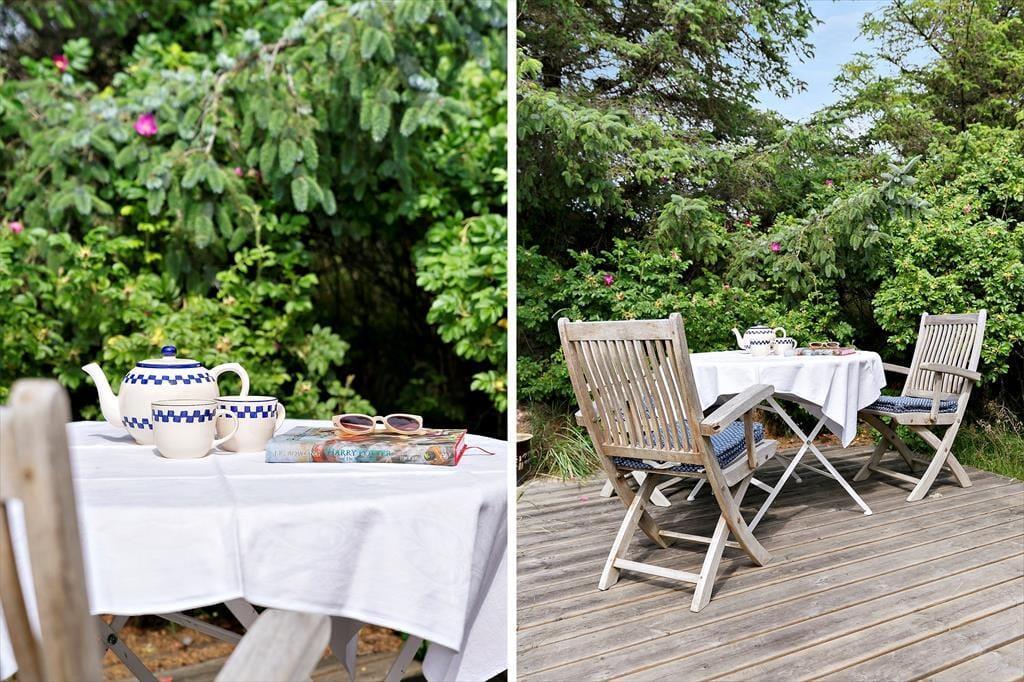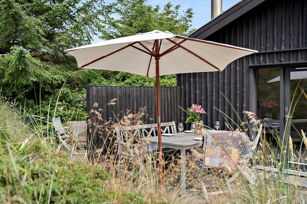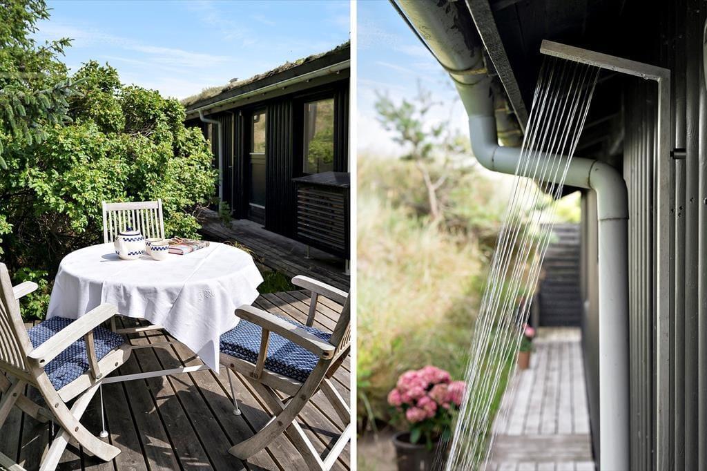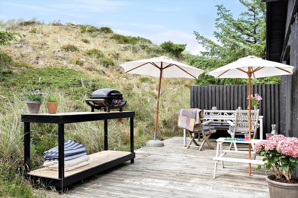 Die Nähe zur Natur wird auf dem großen Dünengrundstück selbstverständlich noch spürbarer. Eine offene Holzterrasse umgibt das gesamte Haus, wodurch Sie unabhängig vom Stand der Sonne stets einen passenden Aufenthaltsplatz finden. Kühlen Schatten spendet auf Wunsch der hauseigene Sonnenschirm. Nach einem Bad im Meer spült Ihnen die Außendusche den Sand und das Salz von der Haut. Ihre erholsamen Urlaubstage in schönem, gänzlich ungestörten Rahmen lassen Sie am besten mit einem guten Essen vom Grill ausklingen.