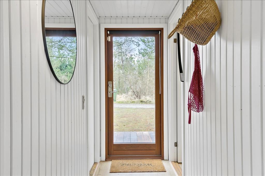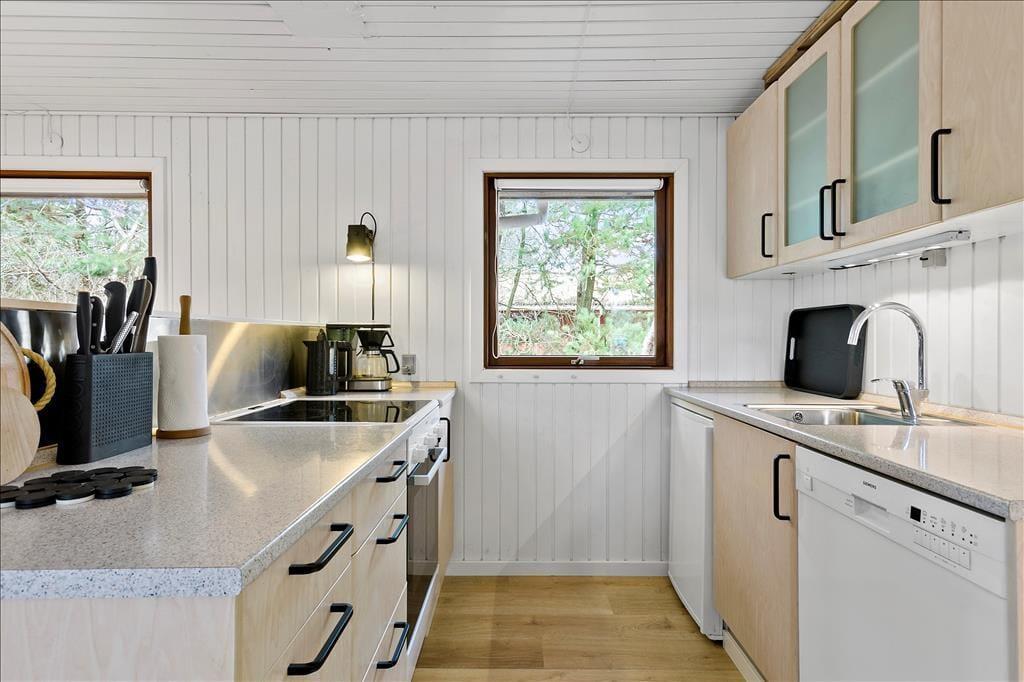 Im Inneren des Hauses ist es angenehm sich aufzuhalten Dank der hellen Einrichtung und den bewährten Bauplan. Im Wohnzimmer trägt ein Kaminofen zu der gemütlichen Atmosphäre bei, und so ist es auch hilfreich für die Ferienstimmung, dass Sie auf das schöne Naturgrundstück hinausschauen können, ungeachtet dessen ob Sie sich es im Sofa gemütlich machen, am Esstisch sitzen oder in der offenen Küche das Essen zubereiten. Im Übrigen steht im Wohnzimmer eine Couch, perfekt für einen Mittagsschlaf oder das Lesen der Zeitung. Der Nachtschlaf kann in einem der zwei Schlafzimmer stattfinden, welche insgesamt Platz für vier Personen bieten. Ein Badezimmer mit Dusche und ein Haushaltsraum mit Waschmaschine sind ebenfalls ein Plus des Hauses.