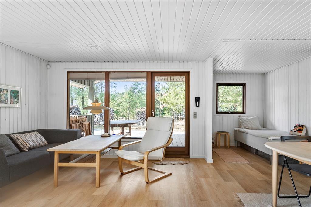 Eine große Glastür im Wohnzimmer gibt Ihnen direkten Ausgang zu einer grossen teilweise überdachten Holzterrasse, welche sich auf drei Seiten des Hauses ausbreitet. Deshalb ist es leicht den ganzen Tag über einen sonnenreichen Platz zu finden – und sogar mit Aussicht auf die hübschen Kiefern, welche auf dem Naturgrundstück stehen. Ist es sommerlich warm, gönnen Sie sich im Schatten eine Pause in der Hängematte, außerdem gibt es die Möglichkeit sich unter der Außen Dusche zu erfrischen.