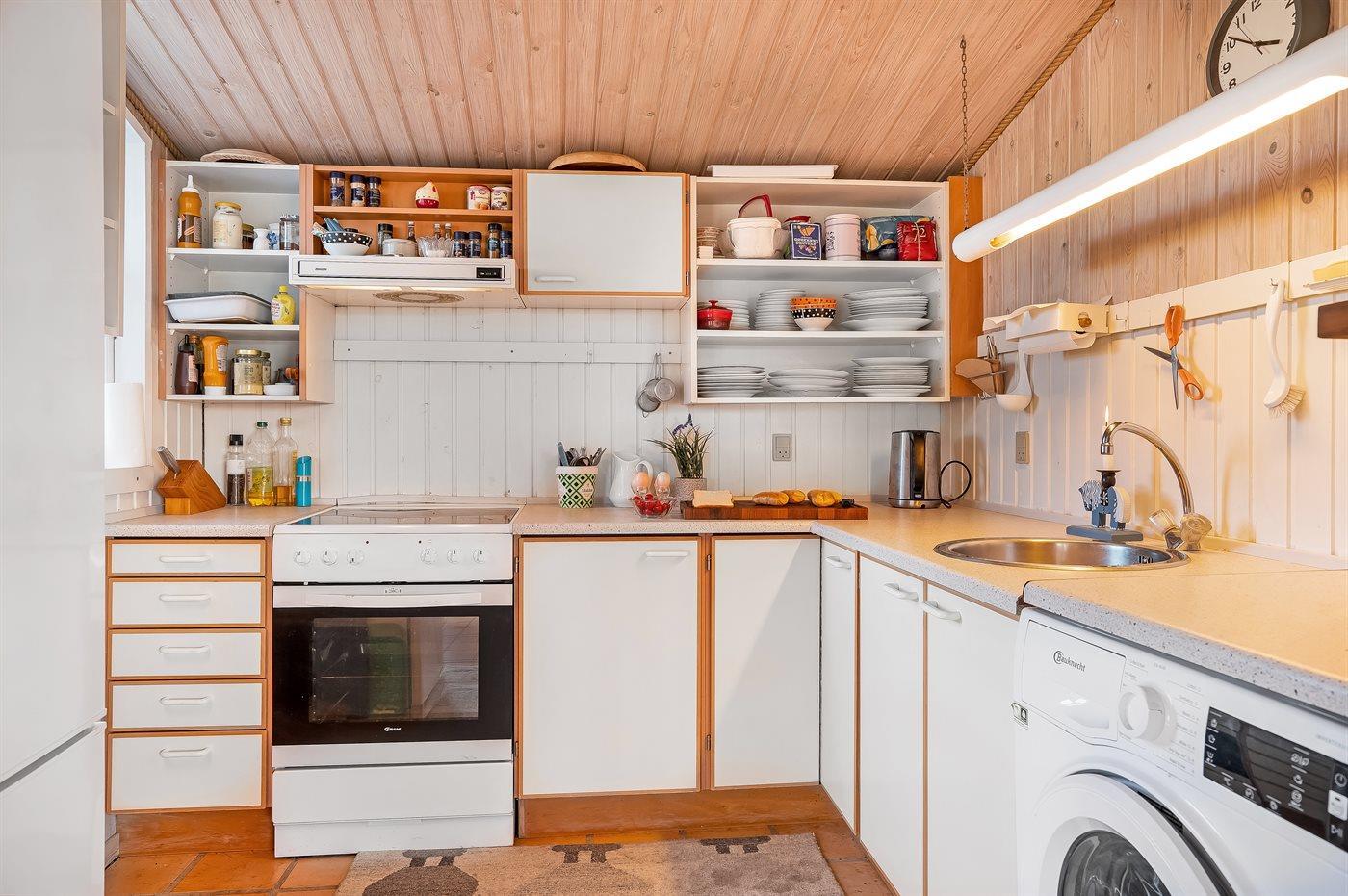 Die Küche ist mit Kühlschrank ausgestattet. Außerdem gibt es 4 Keramik-Kochfelder, Umluftofen.