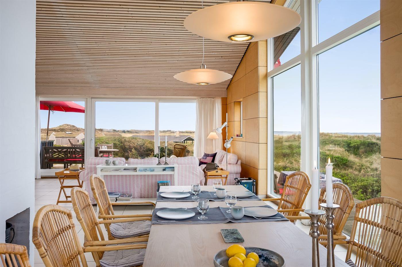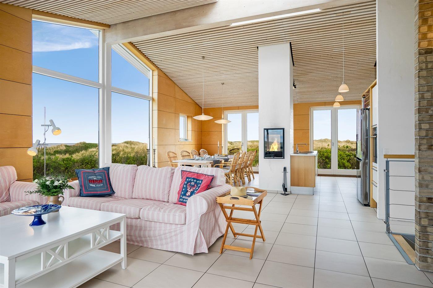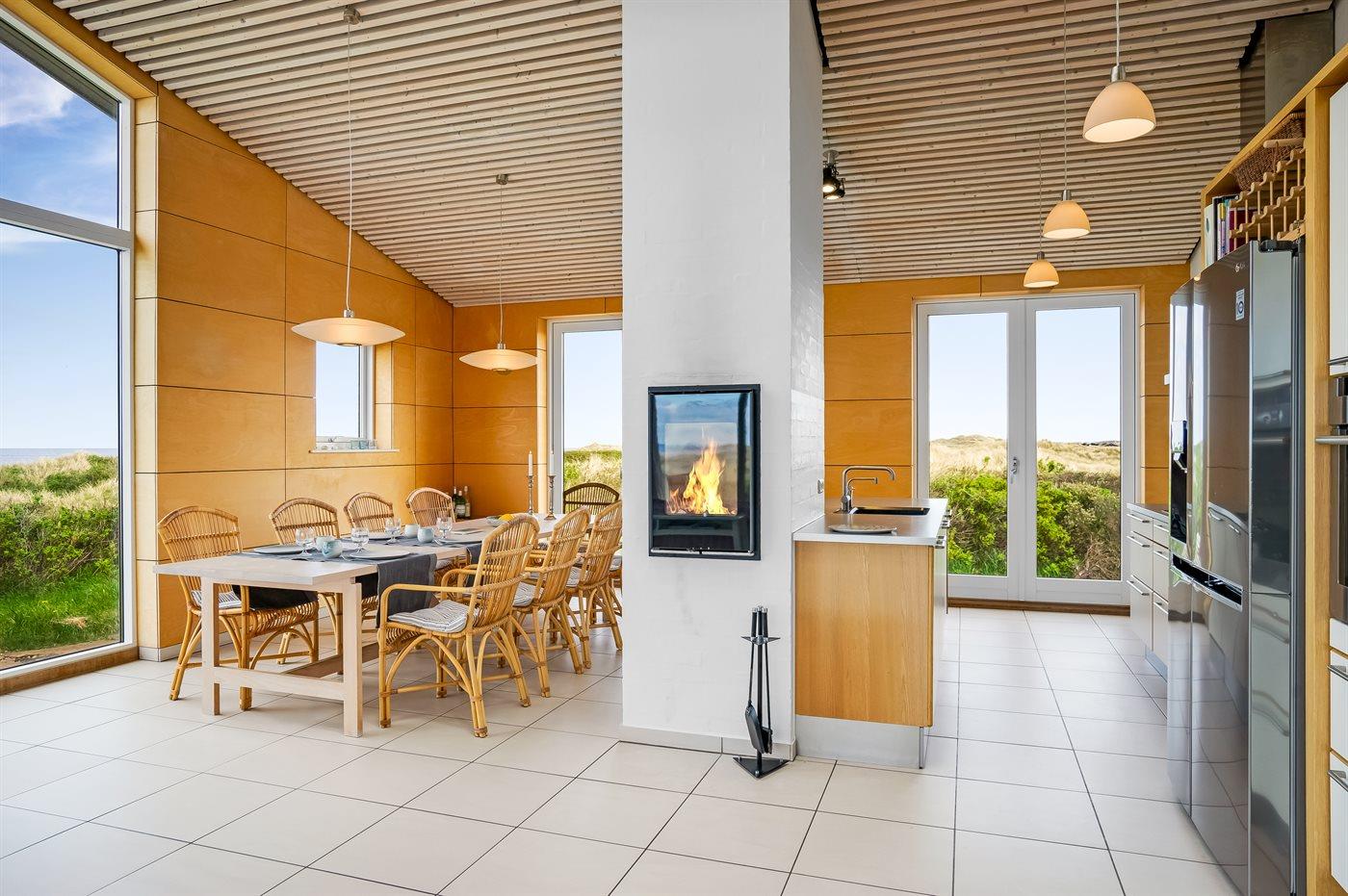 Dieses herrliche Ferienhaus in 2 Etagen gebaut liegt auf einem sehr großen Dünengrundstück nur 50 m vom Strand entfernt und mit einer einmaligen Panoramaaussicht auf Rubjerg Knude Richtung Norden und Bulbjerg Richtung Süden. Das Haus ist 2009 völlig renoviert und erscheint wie neu. Zum Haus gehört eine großes Terrassenareal mit Gartenmöbeln von hier können Sie die herrliche Aussicht in vollen Zügen genießen. Innen gibt es beheizbare Klinkerböden. 2 schöne Badezimmer, beide mit Duschnische. Im Obergeschoss finden Sie die herrliche Küche, die u. a. mit Geschirrspüler, amerikanischen Kühlschrank mit Eiswürfelmaschine und Tiefkühlgerät sowie Umluftofen und Herd mit Ceran-Feld ausgestattet ist. Das geschmackvoll eingerichtete Wohnzimmer mit Kaminofen, Stereoanlage mit CD-Spieler, DVD-Spieler und TV sowie 1 Schlafzimmer mit Doppelbett. Im Erdgeschoss gibt es ein Wohnzimmer/Aktivitätsraum mit Kaminofen und mehrere Spiele sowie 3 Schlafzimmer, alle mit Doppelbett. An weiterer Ausstattung können Waschmaschine, Wäschetrockner, extra Kühlschrank und Tiefkühlgerät, Kinderbett und Kinderhochstuhl erwähnt werden. Es steht kabellose Internetverbindung zur Verfügung. Das Haus ist gut isoliert und es ist eine Wärmezurückgewinnungs-Anlage installiert. Ein herrliches Ferienhaus mit einer phantastischen und ganz einmaligen Lage für einen schönen und entspannenden Urlaub zu jeder Jahreszeit geeignet. Das Haus liegt ca. 8 km von einem 18-Loch Golfplatz entfernt.