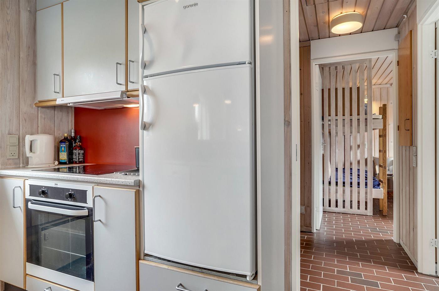 Die Küche ist mit Kühlschrank ausgestattet. Außerdem gibt es 4 Keramik-Kochfelder, Umluftofen sowie Geschirrspüler.