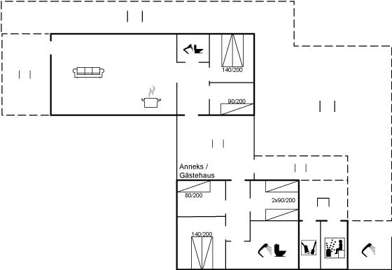 Zum Haus gehört ein großes Gästehaus, wo sich 5 der Schlafplätze befinden. Das Gästehaus ist mit 3 Schlafzimmern und Badezimmer mit Toilette eingerichtet.