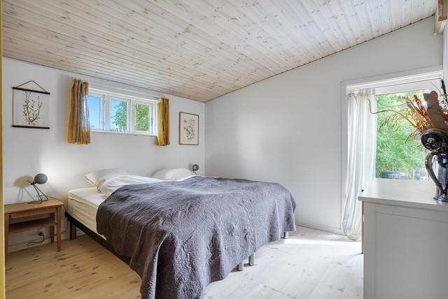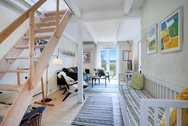 Hier betritt man einen schönen Eingangsbereich/Waschküche mit Waschbecken, Waschmaschine und Trockner, und dann beginnt der Urlaub. Das Wohnzimmer ist gemütlich eingerichtet mit einem Streaming-TV, guten Möbeln und einem Kaminofen, von hier aus führt eine Treppe ins Obergeschoss. Vom Wohnzimmer aus gelangt man in das Esszimmer, beide Räume haben einen Ausgang zur Terrasse durch eine doppelte Terrassentür. In der gemütlichen Landküche können Sie gemeinsam die Mahlzeiten des Tages zubereiten, und hier gibt es auch eine kleine, gemütliche Essecke, in der man den Morgenkaffee genießen kann. Neues Badezimmer mit Duschkabine, Toilette und Waschbecken sowie Fußbodenheizung. Im Erdgeschoss gibt es ein Schlafzimmer mit Doppelbett und direktem Zugang zur Terrasse. Im Obergeschoss befindet sich ein großes Zimmer mit einem Einzelbett und einem Doppelbett sowie einem Sofa. Vom Obergeschoss gibt es auch Zugang zu einem schönen Balkon mit einer herrlichen Aussicht, auf dem man ein Glas Wein genießen kann.