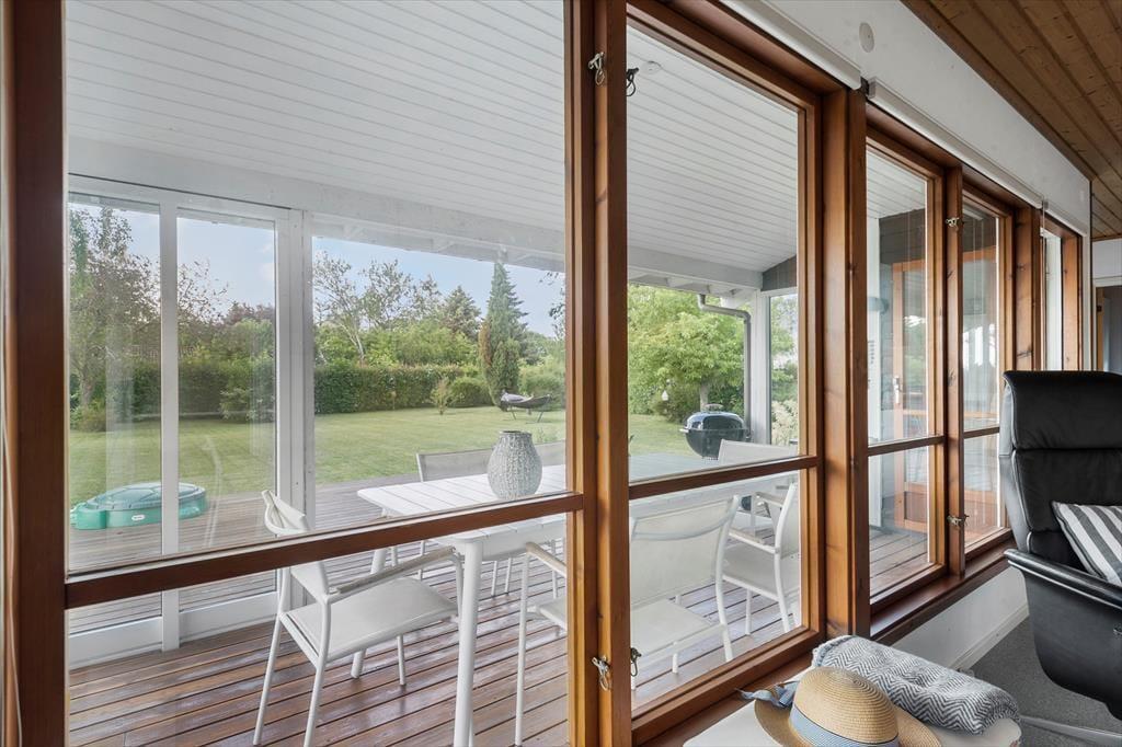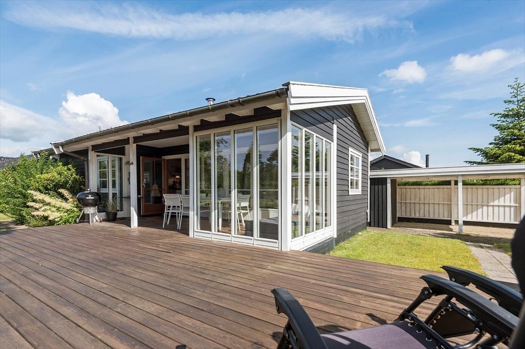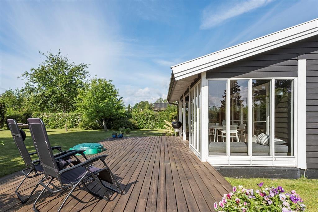 Wenn die Abende kühl werden, kannst du dich in den geschützten Teil der Holzterrasse zurückziehen. Es gibt nichts Schöneres, als die Ruhe und den Frieden mit einem Glas Wein oder einer guten Tasse Tee oder Kaffee zu genießen. Hier findest du Platz für Gemütlichkeit, Entspannung und jede Menge Naturerlebnisse. Der Strand ist nur 200 Meter vom Haus entfernt und über ein Wegesystem zu erreichen.