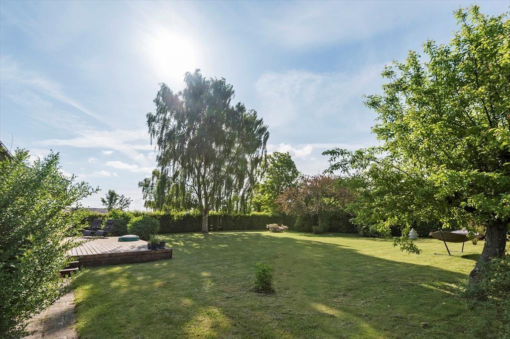 Vom Wohnzimmer aus kannst du auf die Holzterrasse gehen und hier oder in einer der anderen gemütlichen Ecken im Garten die Sonne genießen. Der Garten ist schön bepflanzt, durch eine Hecke begrenzt und abgelegen, mit einem Sandkasten für die Kleinen.