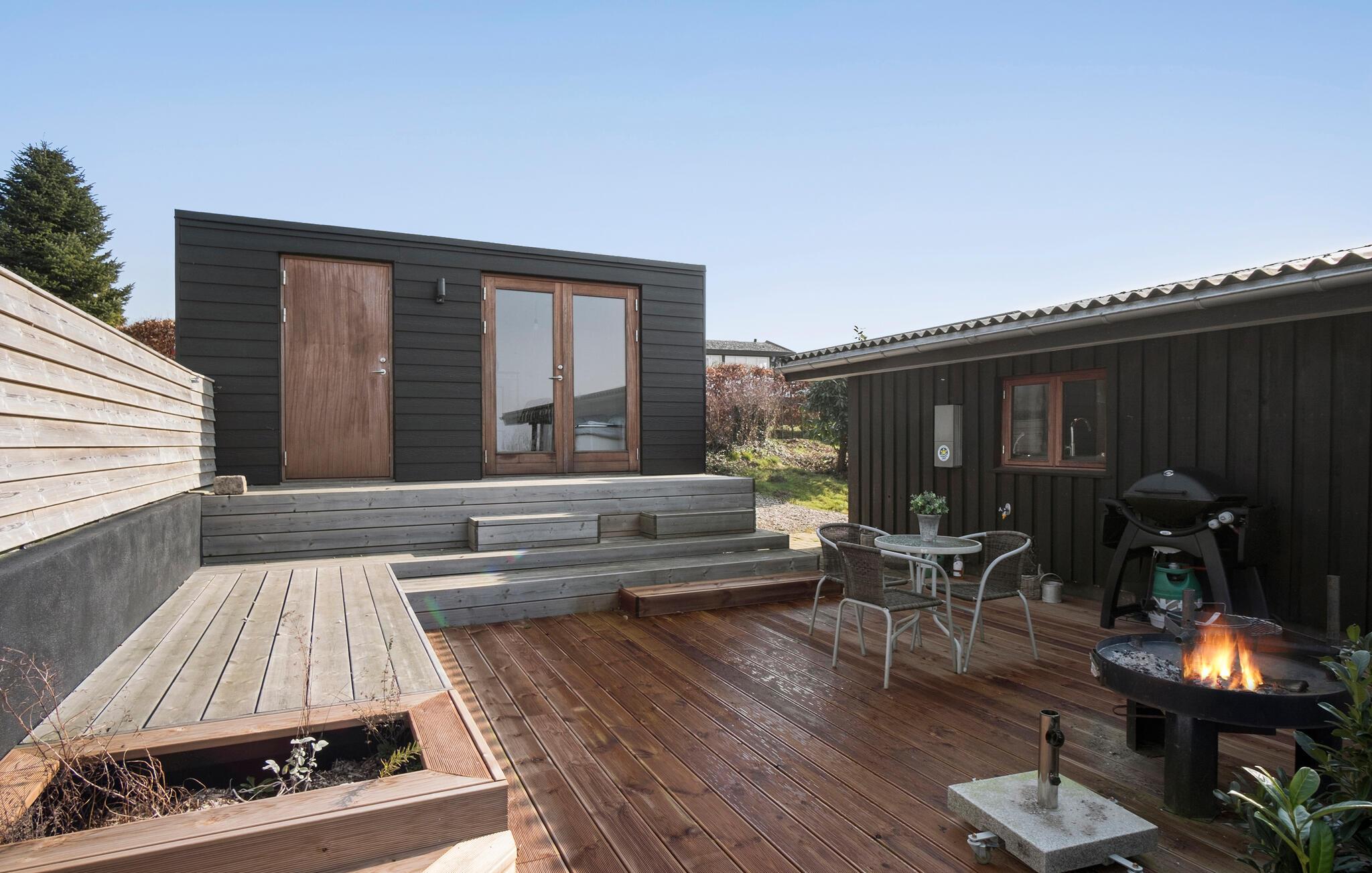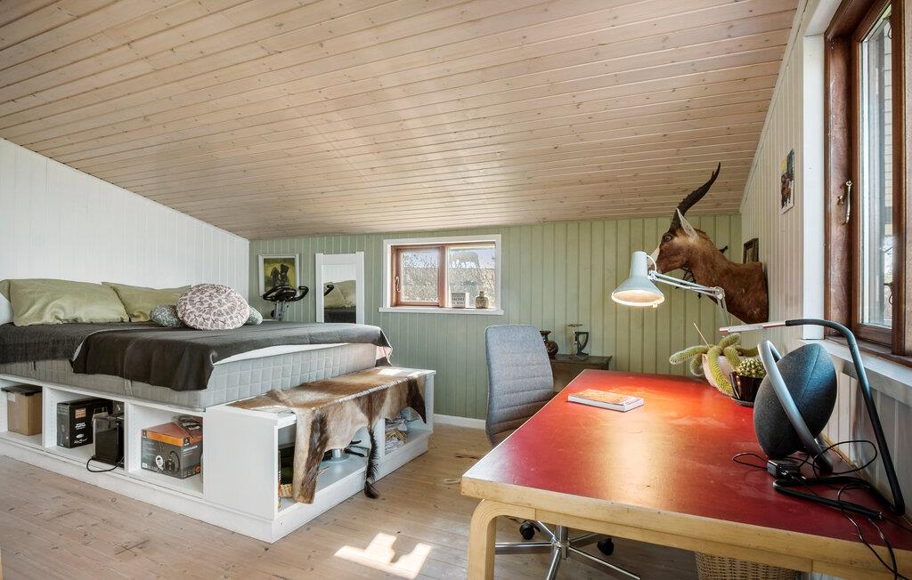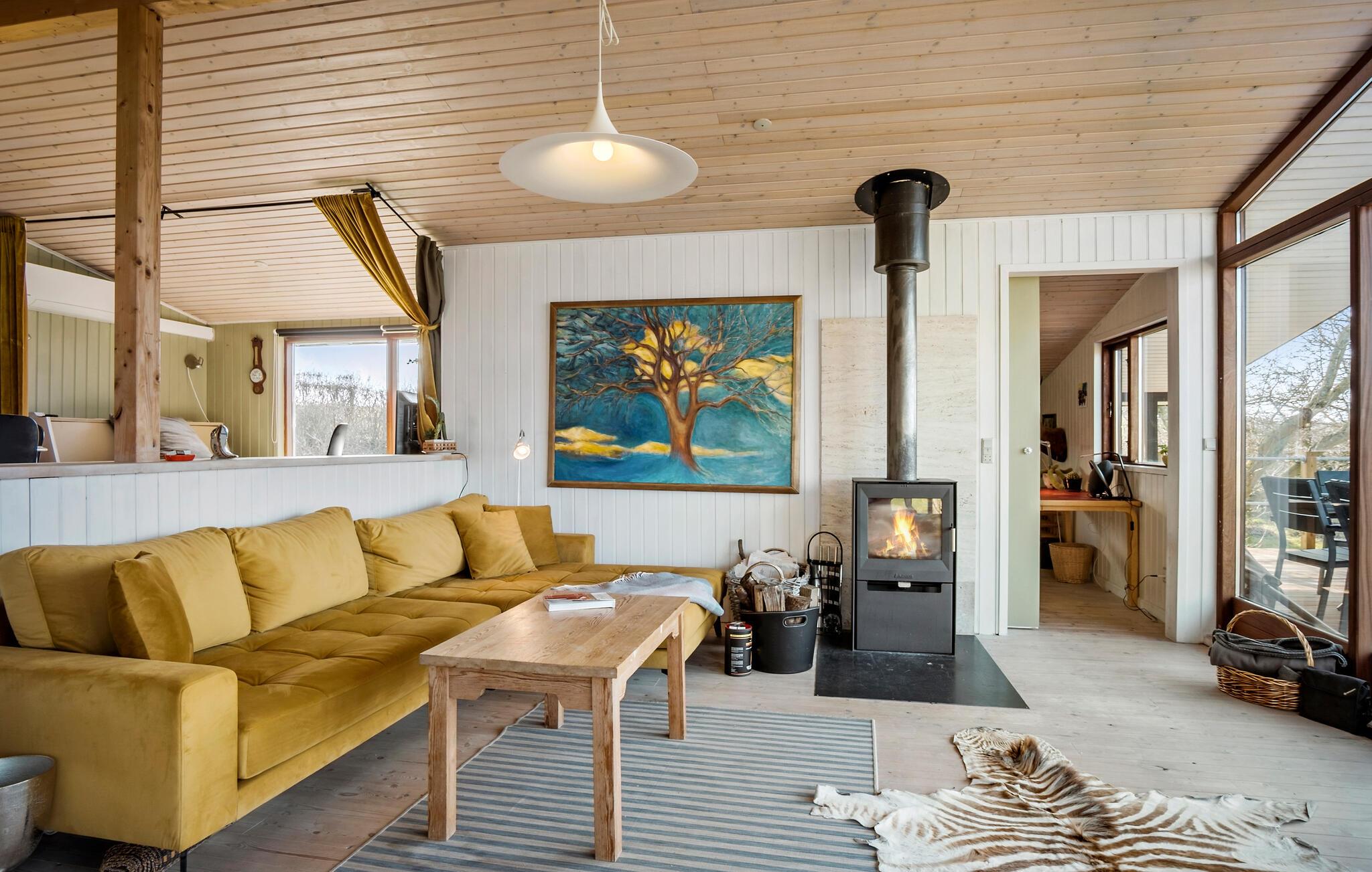 Willkommen im nordwestlichen Teil der Insel Fünen. Hier verbringen Sie einen ruhigen und erholsamen Urlaub, denn die bezaubernde Umgebung lädt zum Abschalten ein. Öffnen Sie die Türen zu diesem klassischen Ferienhaus mit vielen liebevollen Details. Genießen Sie im großen und hellen Wohnbereich die Aussicht durch die Panoramafenster oder machen es sich an kühleren Tagen am Kaminofen gemütlich. Lehnen Sie sich mit einem guten Buch in der gemütlichen Nische zurück, während das Essen in der Küche köchelt und Ihre Kinder am Esstisch ein Brett- oder Kartenspiel spielen.