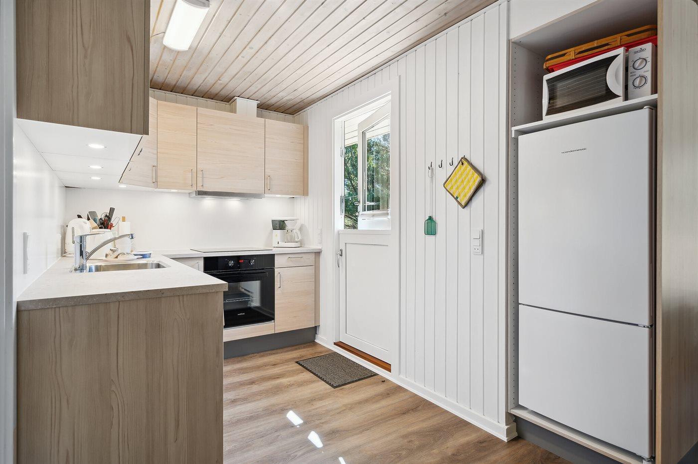 Die Küche (von 2023) grenzt an das Wohnzimmer an und ist unter anderem mit Spülmaschine, Mikrowelle, Ofen, Kühlschrank und Tiefkühlmöglichkeit ausgestattet.