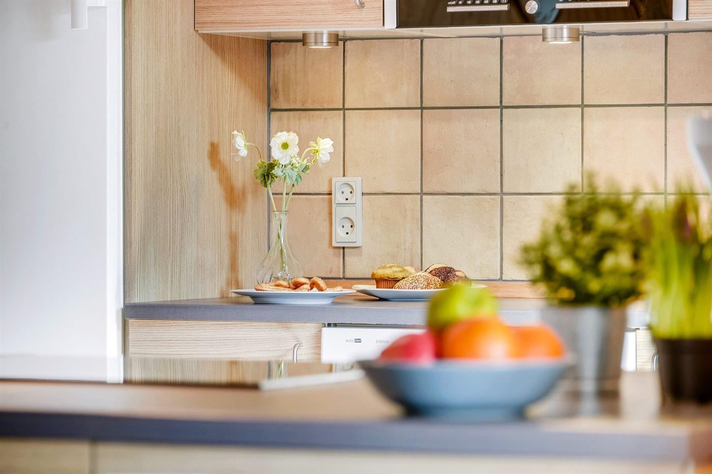 Die Küche ist mit Kühlschrank ausgestattet. Außerdem gibt es 4 elektrische Kochplatten, Umluftofen sowie Geschirrspüler.