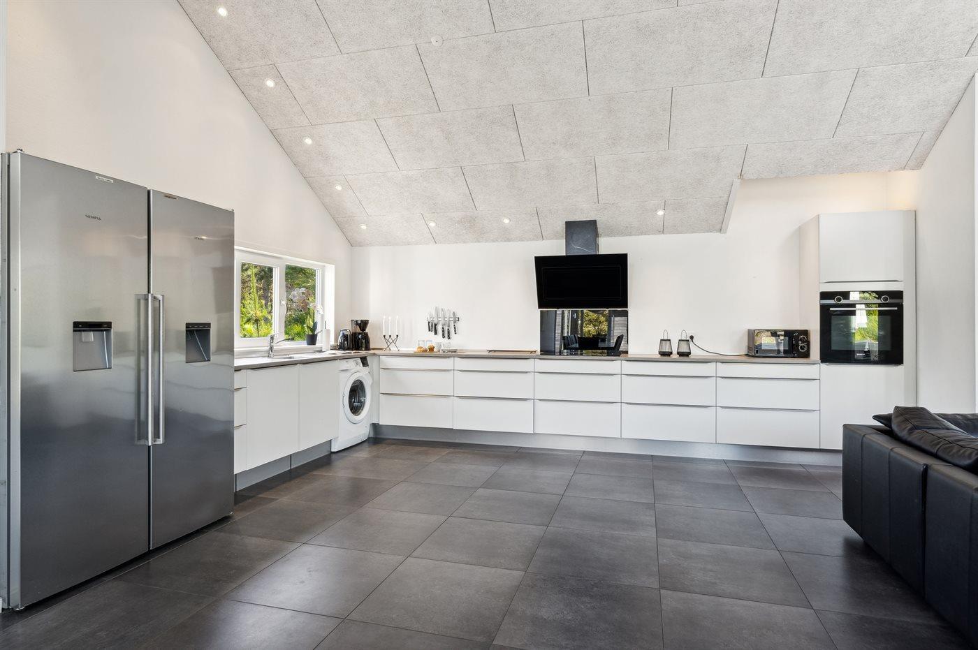 Die Küche ist mit amerikanischem Kühlschrank ausgestattet. Außerdem gibt es 4 Keramik-Kochfelder, Umluftofen, Mikrowelle sowie Geschirrspüler.