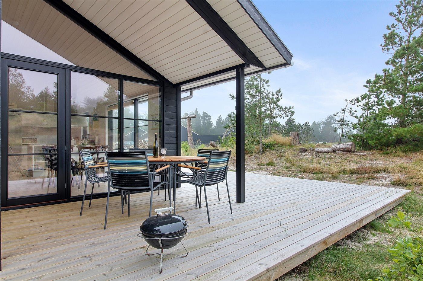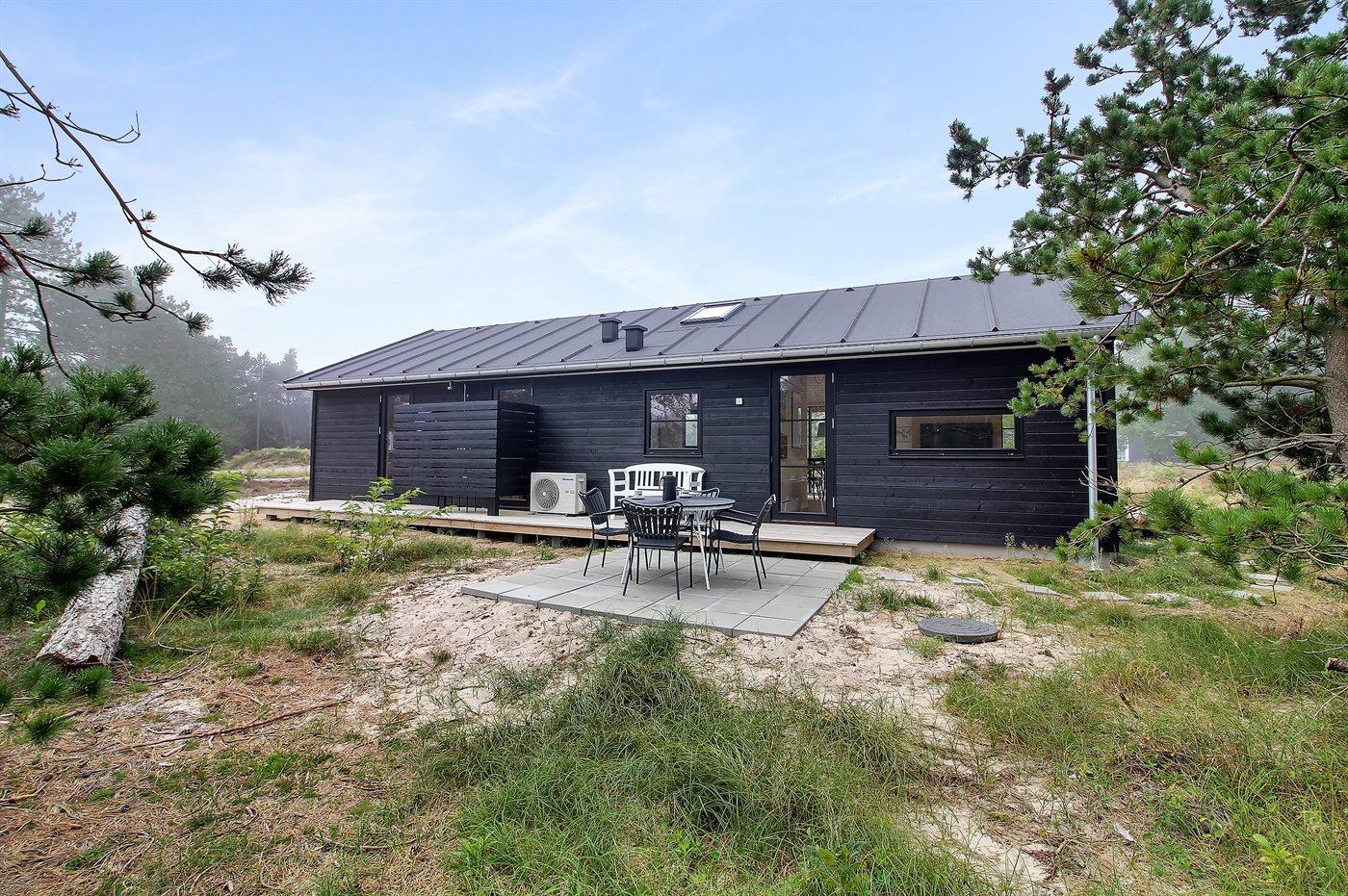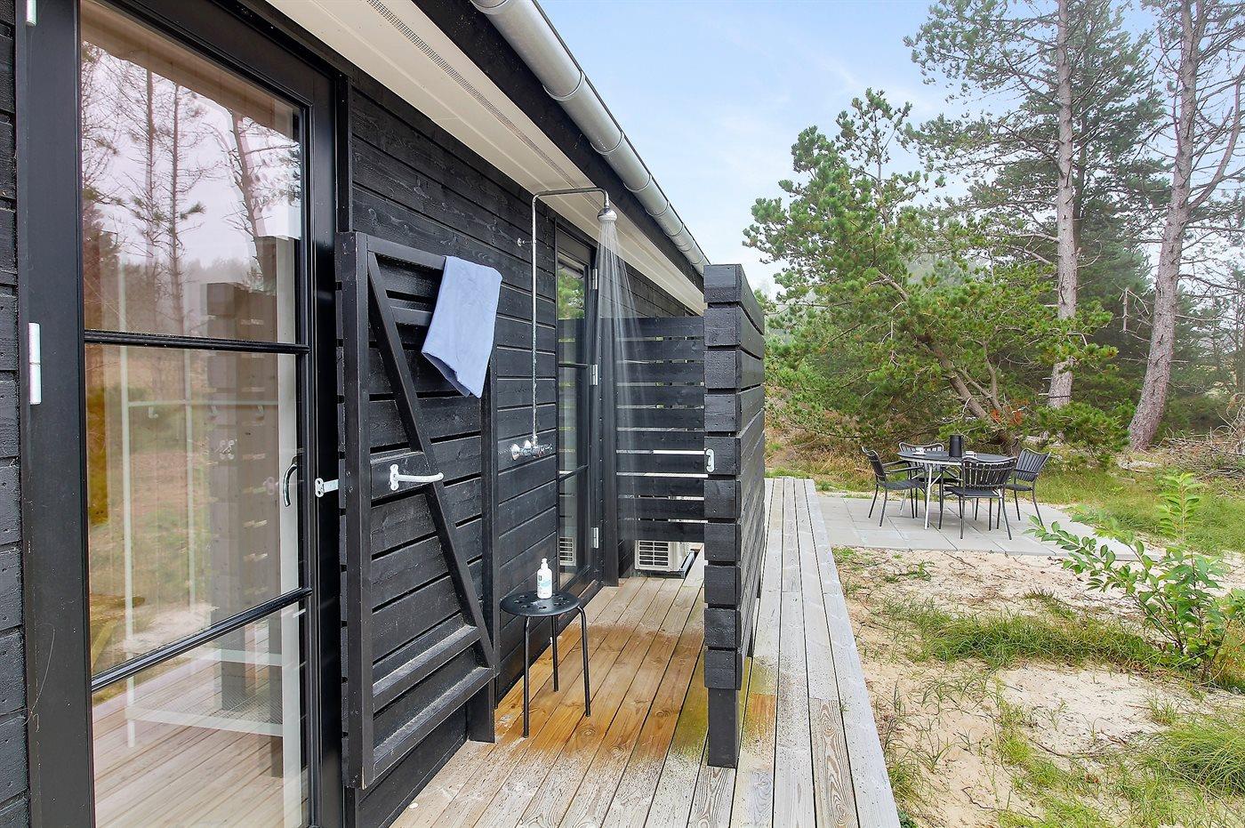 Modernes Ferienhaus auf Rømø mit Terrasse, Außendusche und Nähe zum Wattenmeer, ideal für Familien und Naturliebhaber.