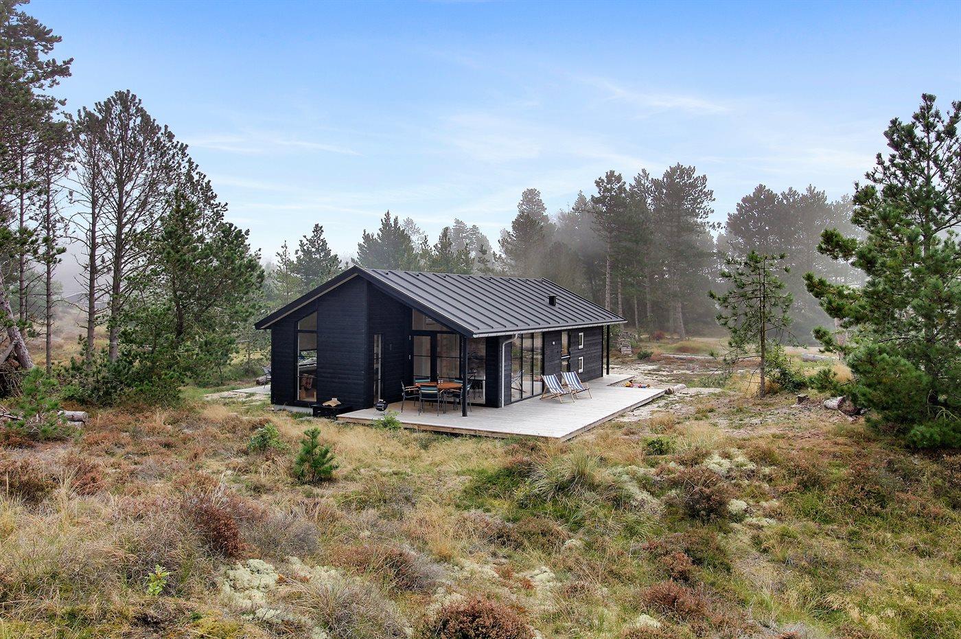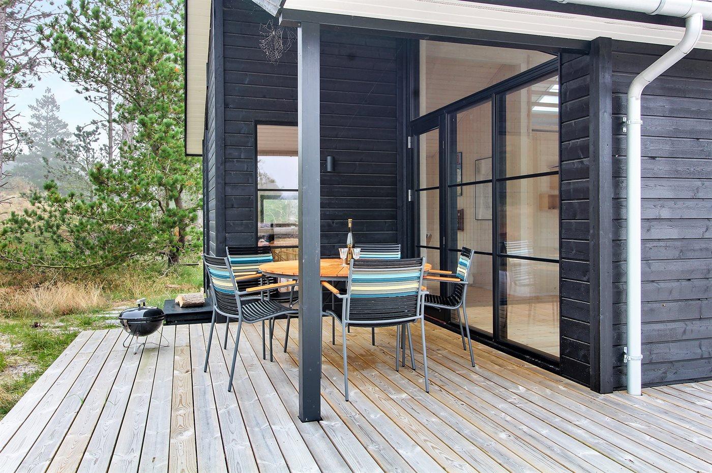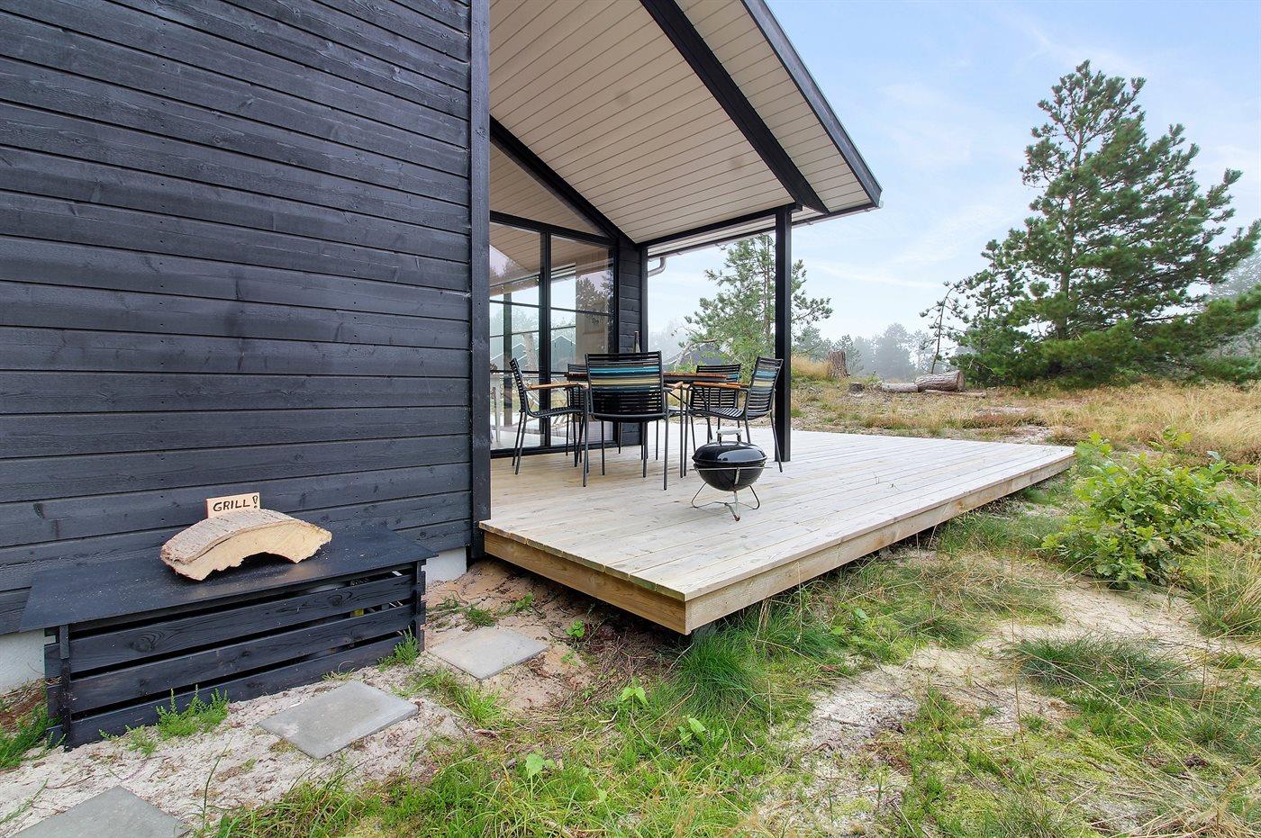 Modernes Ferienhaus auf Rømø mit Terrasse, Außendusche und Nähe zum Wattenmeer, ideal für Familien und Naturliebhaber.