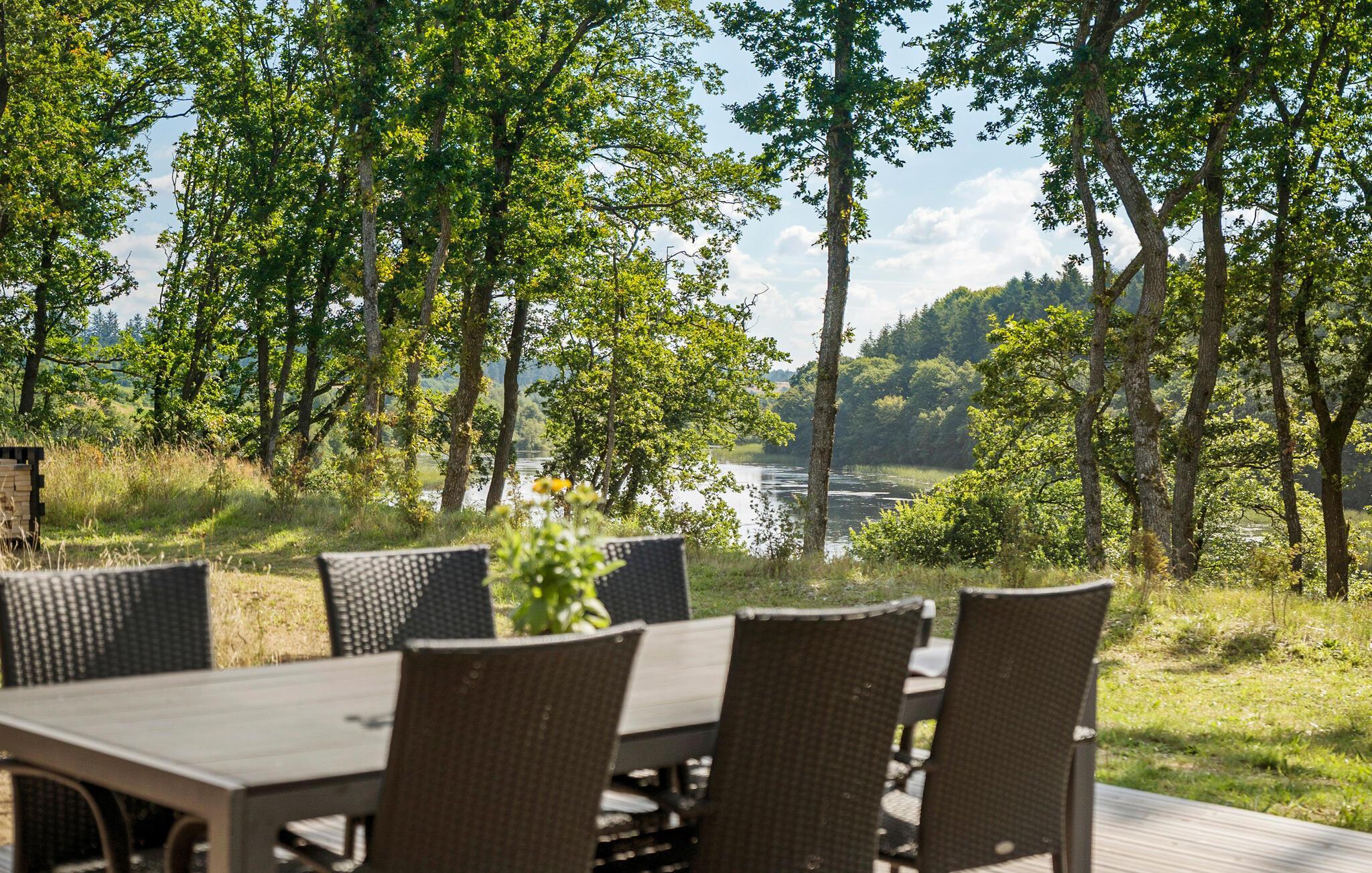 Genießen Sie Ihre Mahlzeit am großen Esstisch mit Blick ins Grüne oder bei schönem Wetter draußen auf der weitläufigen Holzterrasse. Der Terrassenbereich ist ideal, um in der Sonne zu entspannen oder ein gemeinsames Abendessen mit der Familie zu genießen, während Sie den Blick auf den See schweifen lassen.
