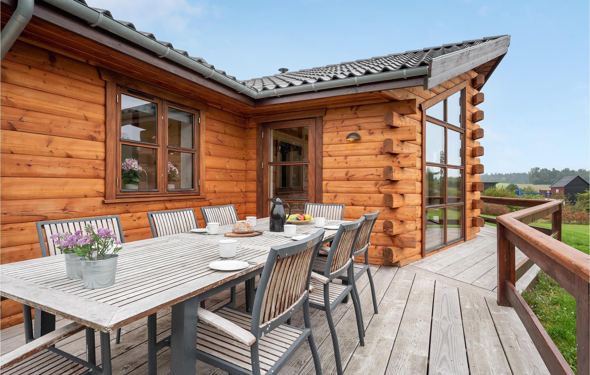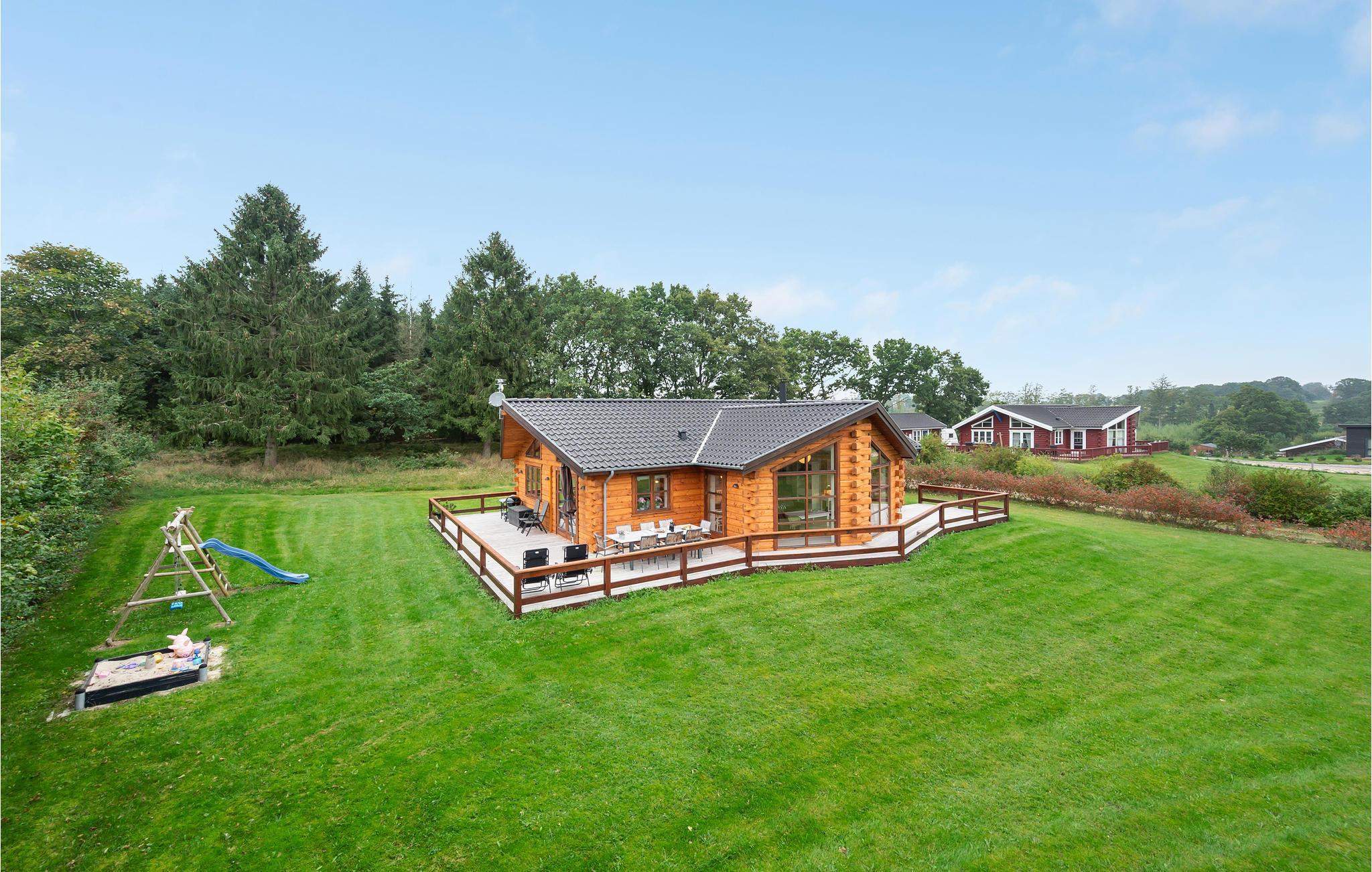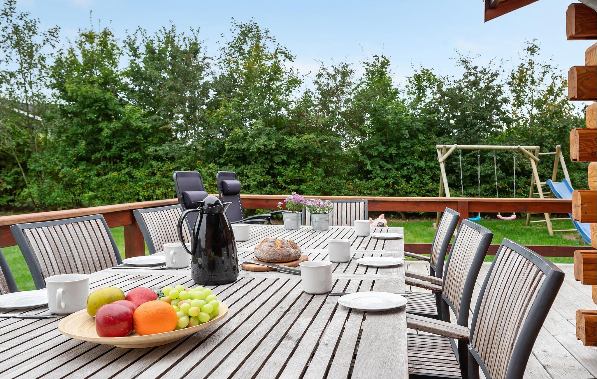 Modernes Ferienhaus in idyllischer Natur mit Terrasse, Kaminofen und Nähe zu Angelsee und Attraktionen.