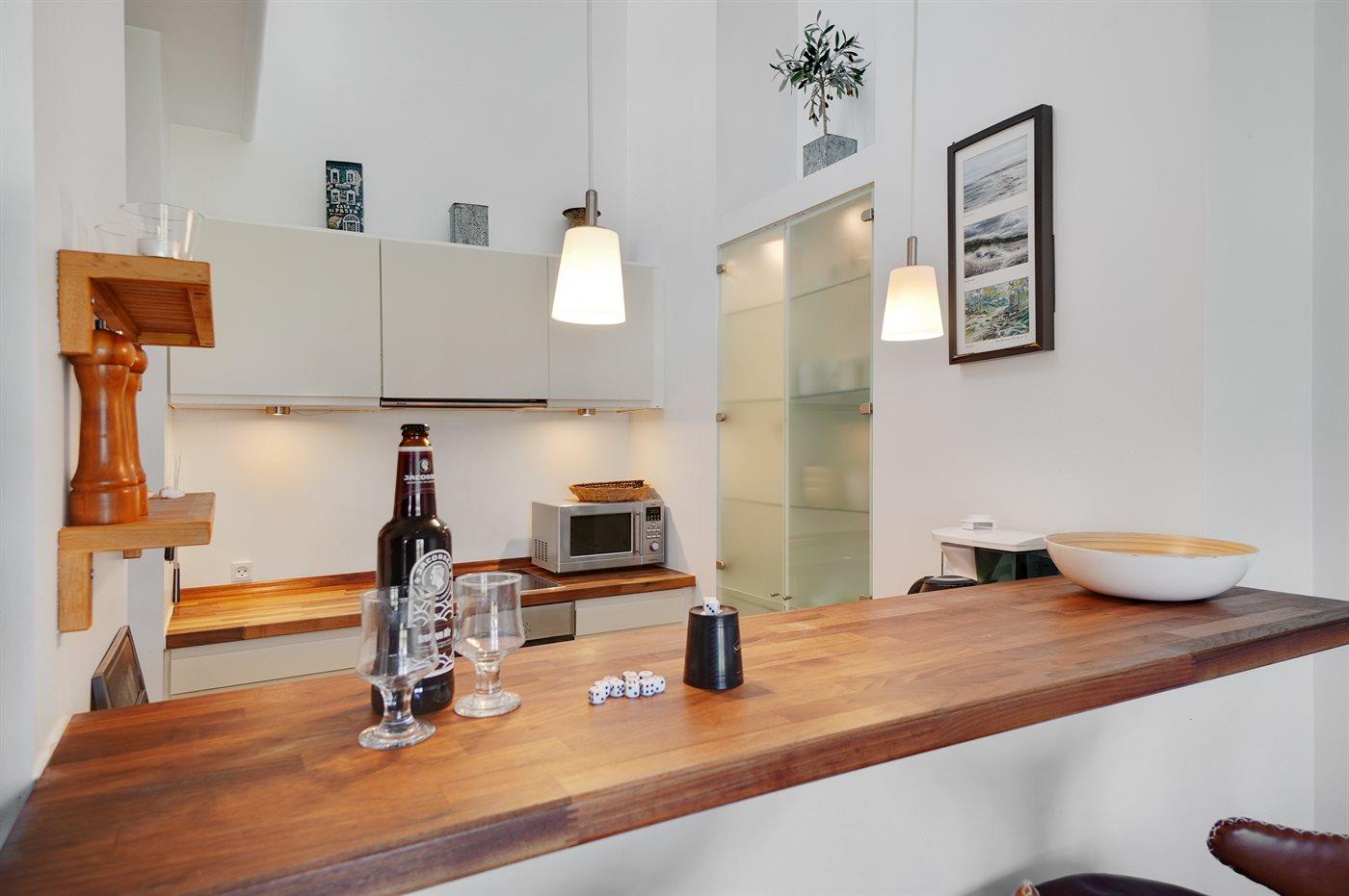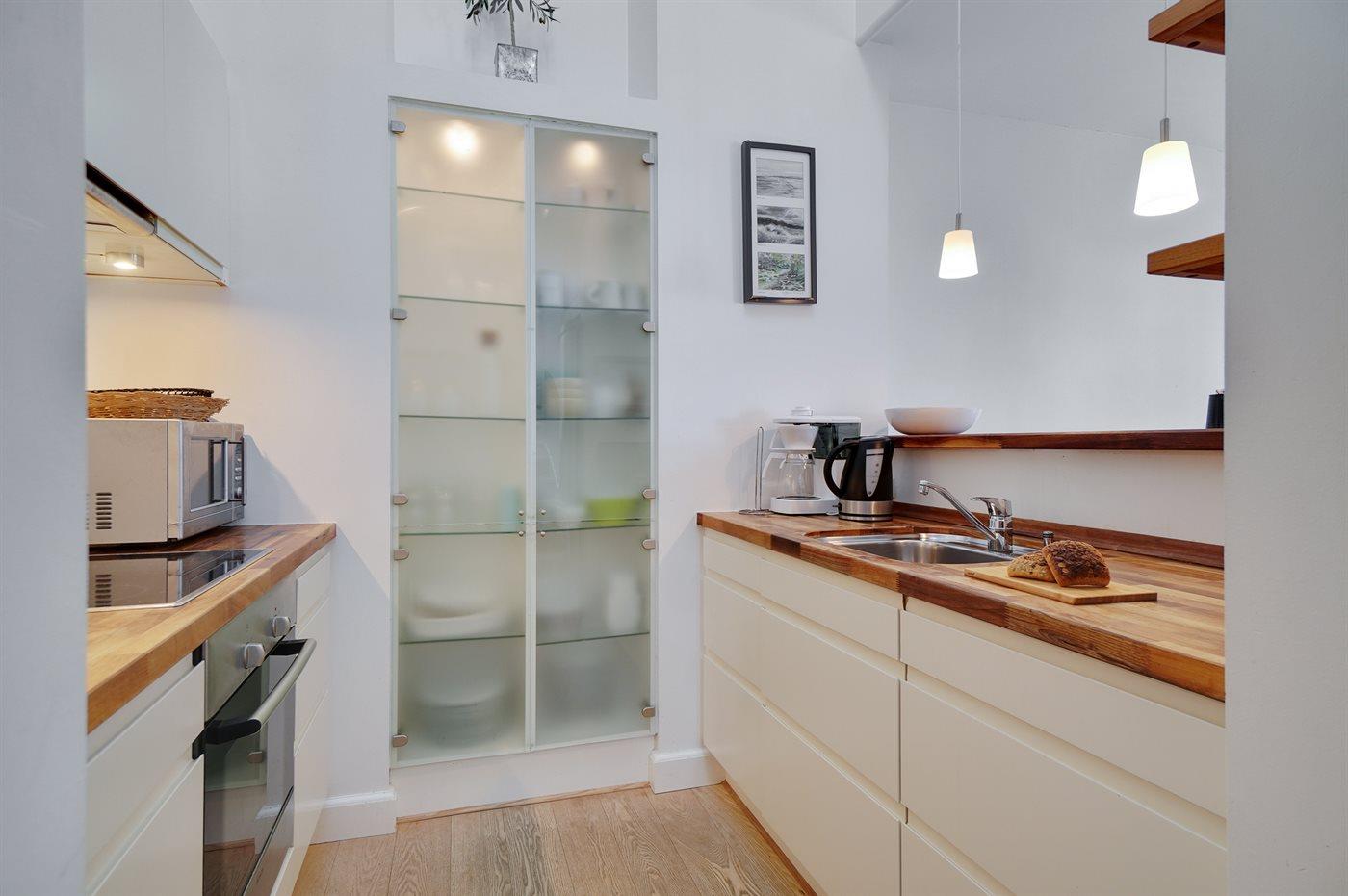 Die Küche ist mit Kühlschrank ausgestattet. Außerdem gibt es 4 Keramik-Kochfelder, Umluftofen, Mikrowelle sowie Geschirrspüler. Nespressomaschine und Milchaufschäumer.