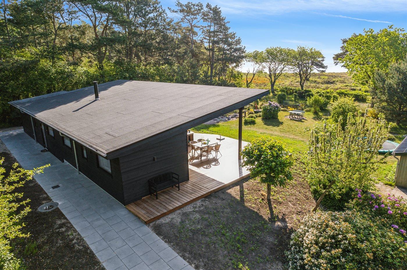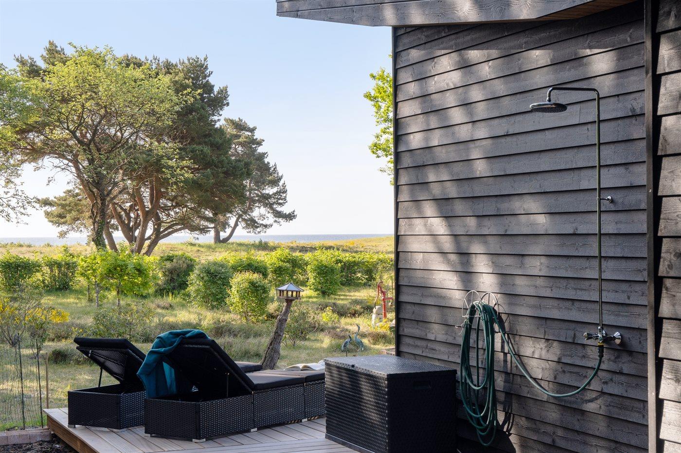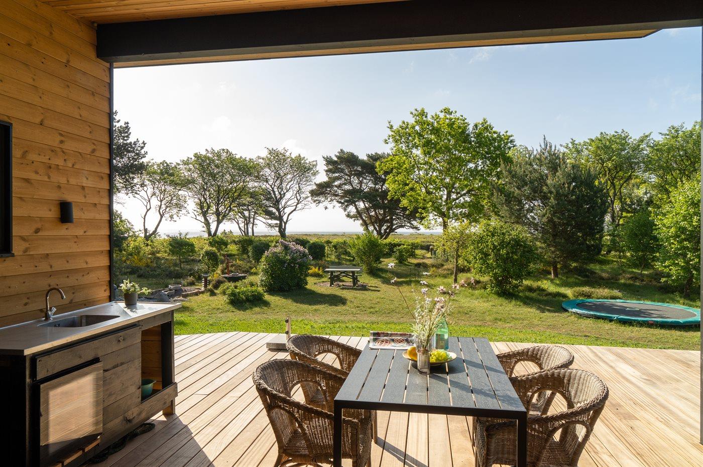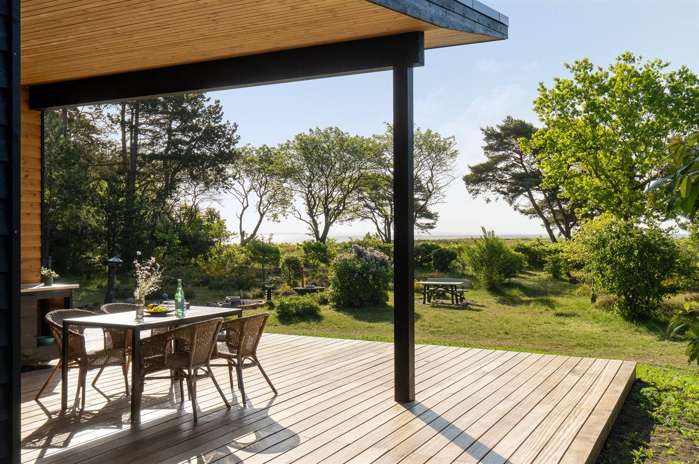Die frische Luft kann man in vollen Zügen auf der großen Holzterrasse genießen, die teilweise überdacht ist. An 3 Seiten des Hauses befinden sich Terrassen, sodass man hier ein gutes Angebot an Sonne, Windschatten und Schatten hat.