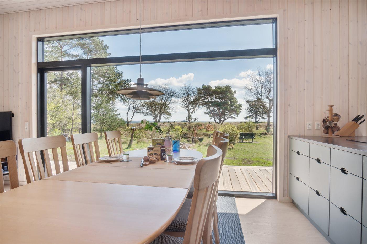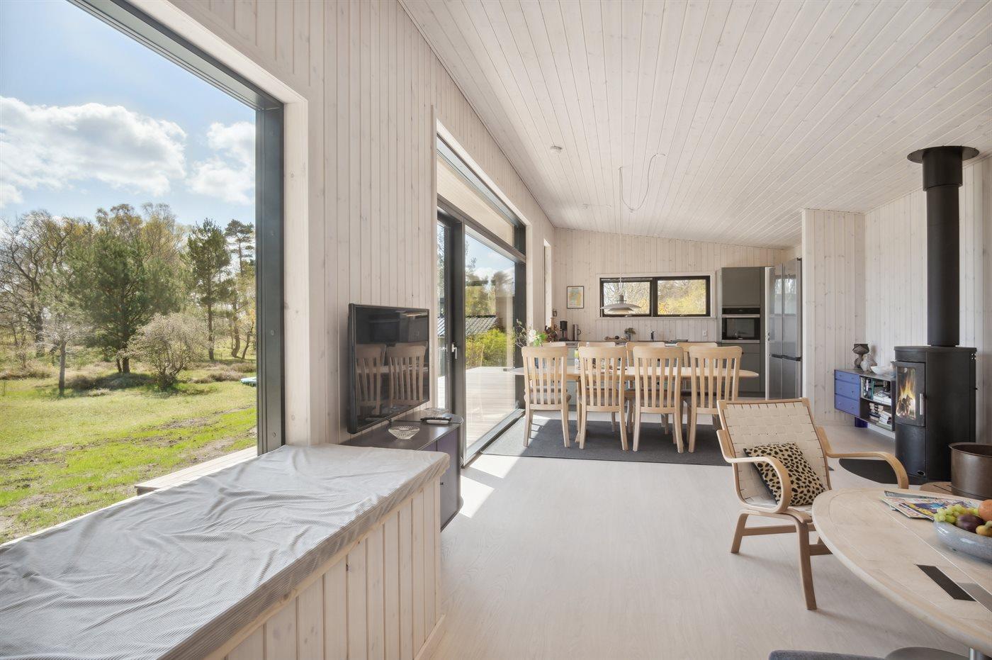 Das Haus wurde aus modernen und hellen Materialien erbaut und ist dank der großen Fensterfronten besonders hell. Wohnzimmer, Essbereich und Küche grenzen offen aneinander an und ungeachtet wo man sich befindet hat man einen schönen Ausblick.