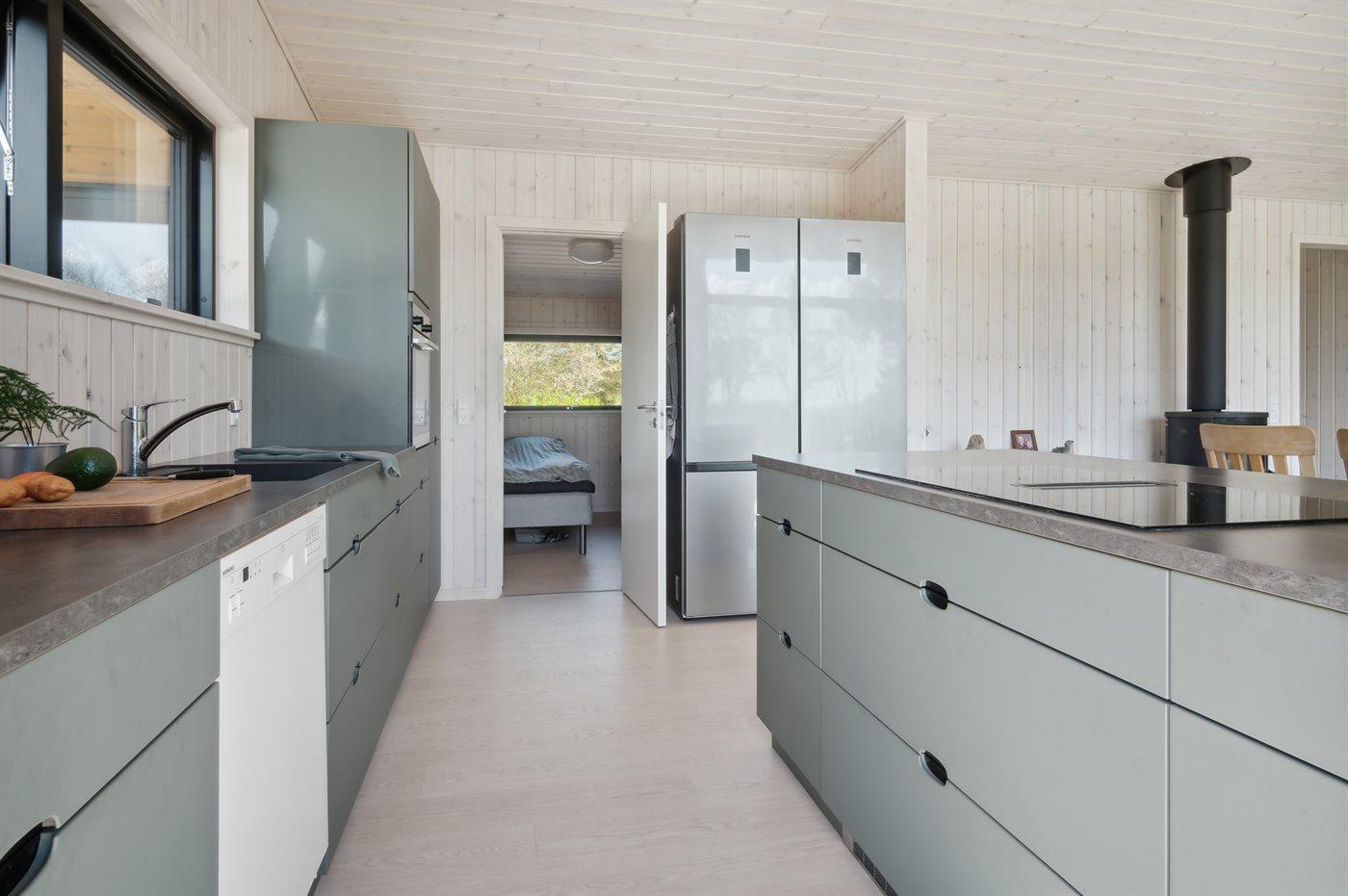 Die Küche ist mit Kühlschrank ausgestattet. Außerdem gibt es 4 Induktions-Kochzonen, Umluftofen, Mikrowelle sowie Geschirrspüler.