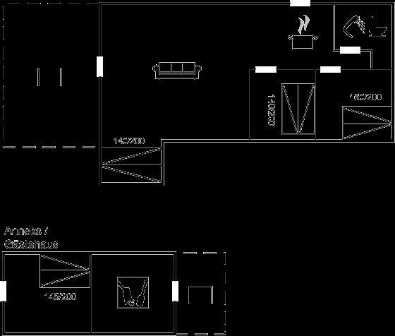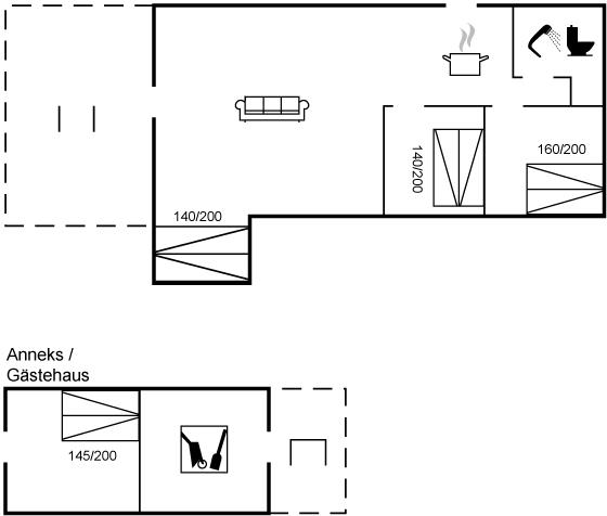 Im Haus gibt es zwei Schlafzimmer, beide mit Doppelbetten. Außerdem gibt es eine gemütliche Alkove, die zum Entspannen einlädt. Im separaten Gästehaus steht ein weiteres Doppelbett zur Verfügung. Das Badezimmer ist mit Duschniche ausgestattet.