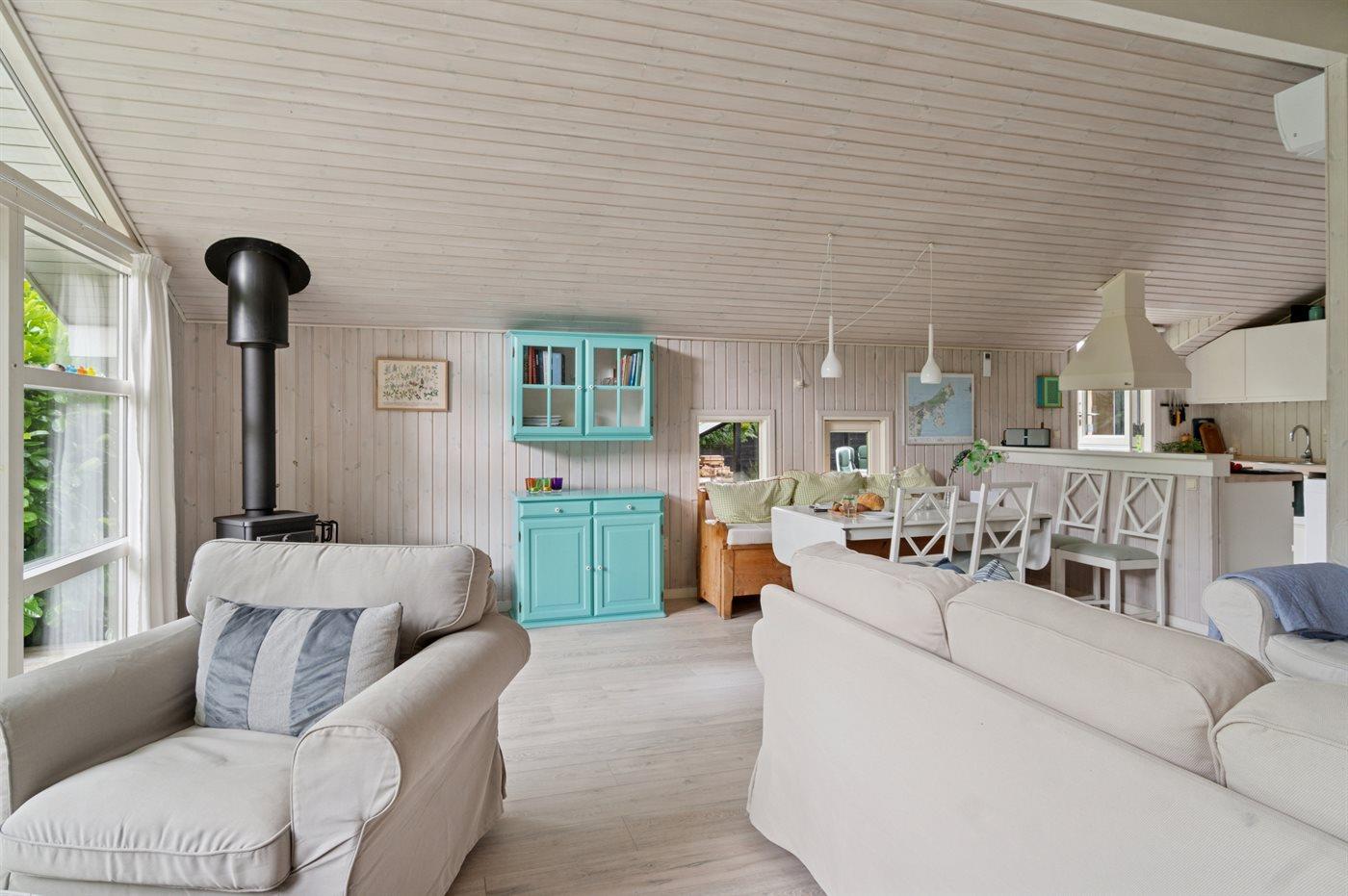 Wohnzimmer und Küche sind offen miteinander verbunden, und von hier aus hast du direkten Zugang zur schönen Holzterrasse.
