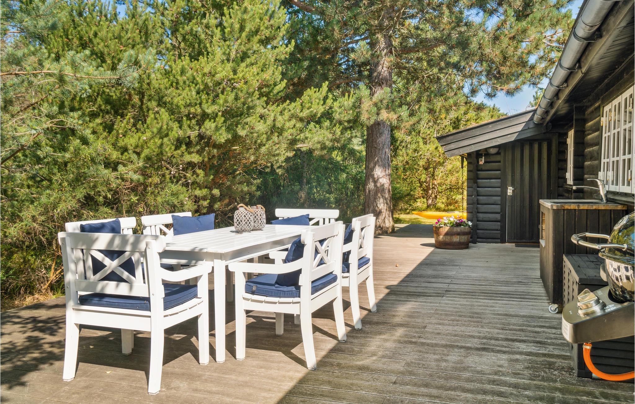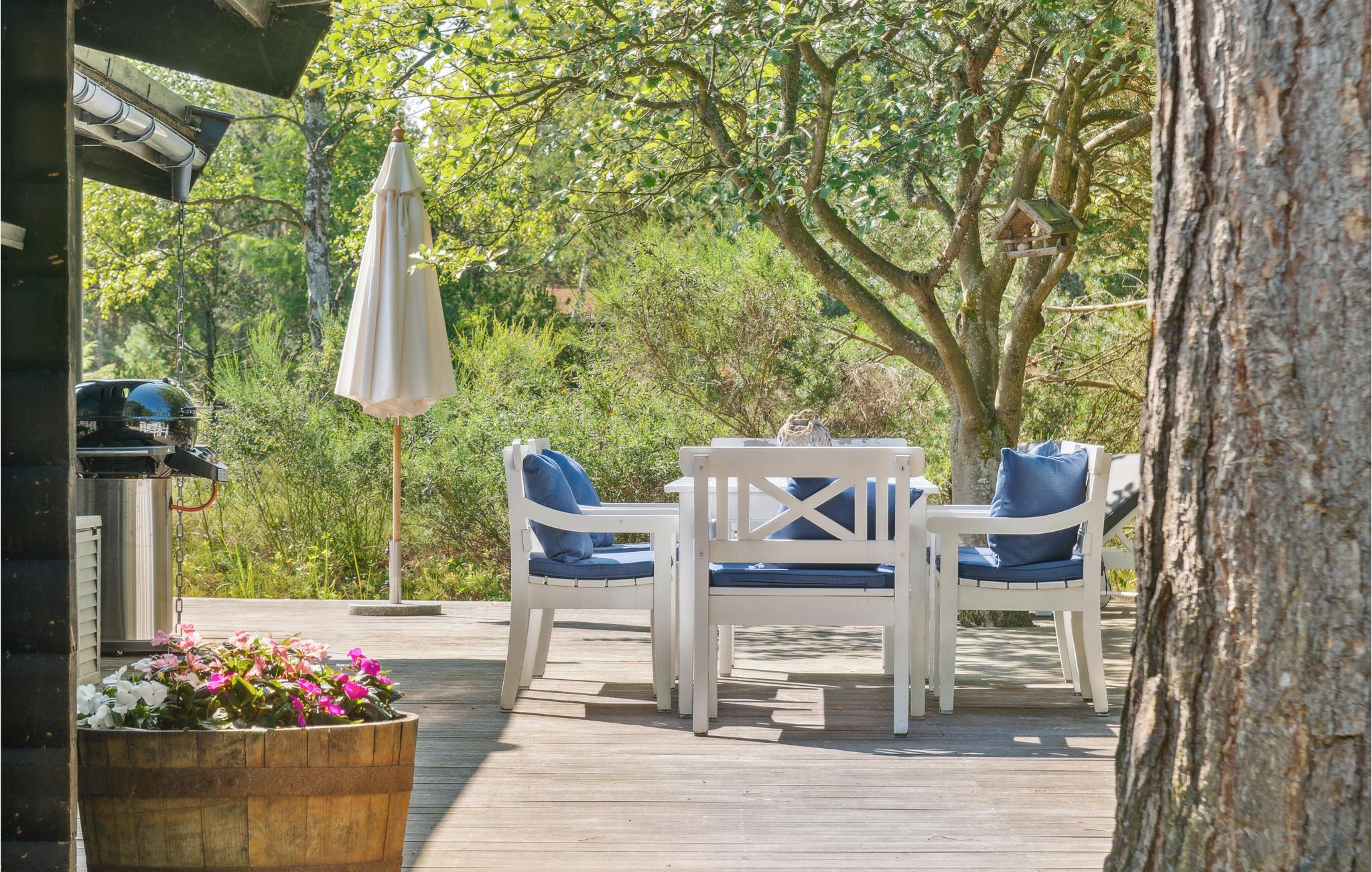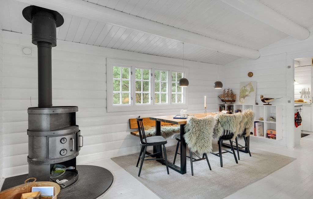 Wenn Sie Ruhe und Privatsphäre suchen, werden Sie in diesem gemütlichen Ferienhaus auf einem bewaldeten Naturgrundstück fündig! Im Inneren empfängt Sie Unterkunft in hellen Farben, die eine einladende Wohlfühlatmosphäre versprüht. Kuscheln Sie zusammen auf dem Sofa, feuern an kühlen Abenden den Kamin an oder spielen ein Brettspiel am Esstisch. Auf der großen Holzterrasse können Sie sich sonnen oder Ihre gegrillten Mahlzeiten genießen und Pläne für die anstehenden Urlaubstage machen.