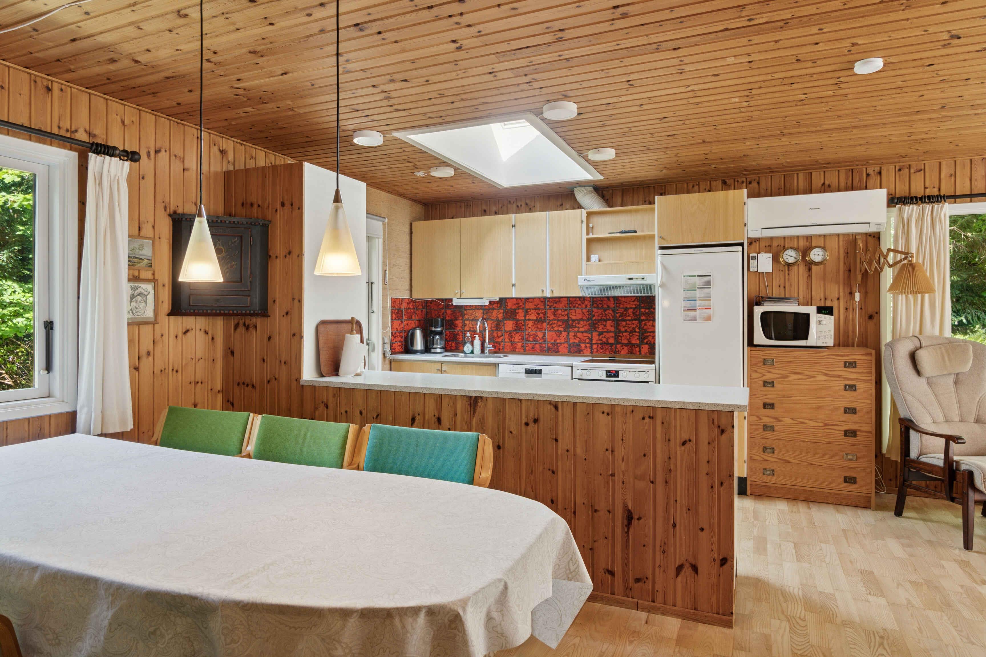 Dieses gemütliche und praktisch eingerichtete Ferienhaus bietet 106 m² Wohnfläche mit Platz für acht Personen, verteilt auf vier Schlafzimmer. Es ist ideal für Familien und Freunde, die ihren Urlaub gemeinsam in ruhiger Umgebung nahe der Natur und Küste verbringen möchten. Das Wohnzimmer bildet das Herzstück des Hauses mit Kaminofen und großen Fenstern. Von hier aus gelangt man direkt auf die nach Süden ausgerichtete Terrasse, die sich ideal für Mahlzeiten und Entspannung im Freien eignet. Eine Wärmepumpe sorgt das ganze Jahr über für ein angenehmes Raumklima, und das Haus ist mit Internet ausgestattet, sodass auch Arbeiten oder Streaming möglich ist. Das Haus liegt auf einem ungestörten Naturgrundstück mit Rasenfläche, die sich gut für Spiele und Ballspiele eignet. Rundherum gibt es Wald, in dem häufig Rehe zu sehen sind. Dybesø ist ein idyllisches Naturgebiet mit reichem Vogelbestand, umgeben von Plantagen und Gestrüpp. Ein etwa 1,9 km langer Rundweg führt um den See, und zwischen dem Kattegat und dem nördlichsten Punkt des Dybesø liegen nur ca. 70 Meter, womit er der See in Dänemark ist, der dem Meer am nächsten liegt. Die Stadt Rørvig und der gemütliche Hafen sind stets einen Besuch wert und bieten zahlreiche Aktivitäten für Kinder und Erwachsene. Der Freizeitpark Sommerland Sjælland ist nur etwa 15 Autominuten entfernt, während Nykøbing Sj. mit Fußgängerzone, kleinen Geschäften, Theater und Hafen in ca. 10 Minuten erreichbar ist. Odsherred ist zudem bekannt für seine vielen kleinen Galerien und Werkstätten. Hier verbindet sich der Komfort eines modernen Ferienhauses mit einer Region, in der Natur, Küstenleben und lokales Flair Hand in Hand gehen.