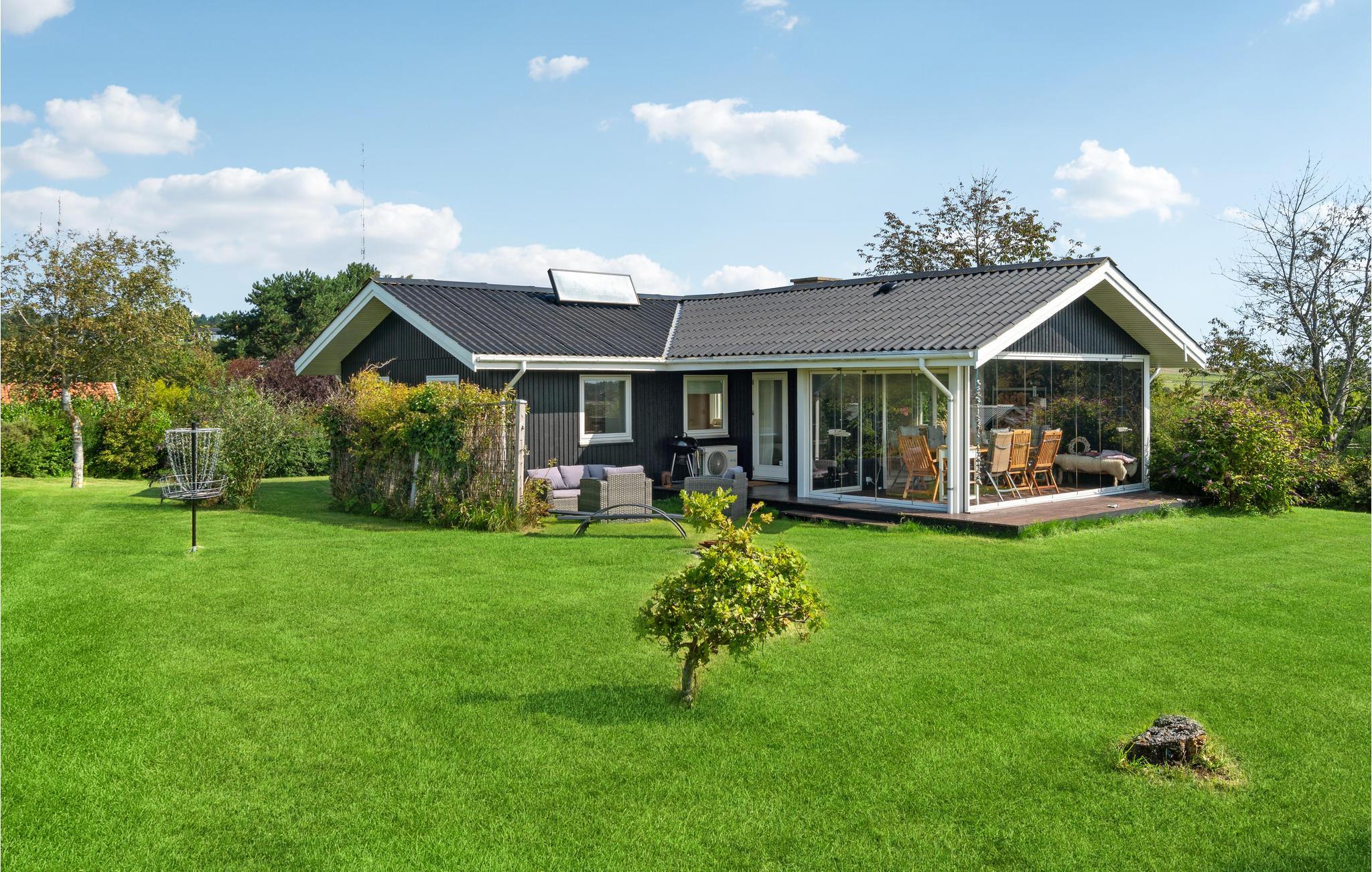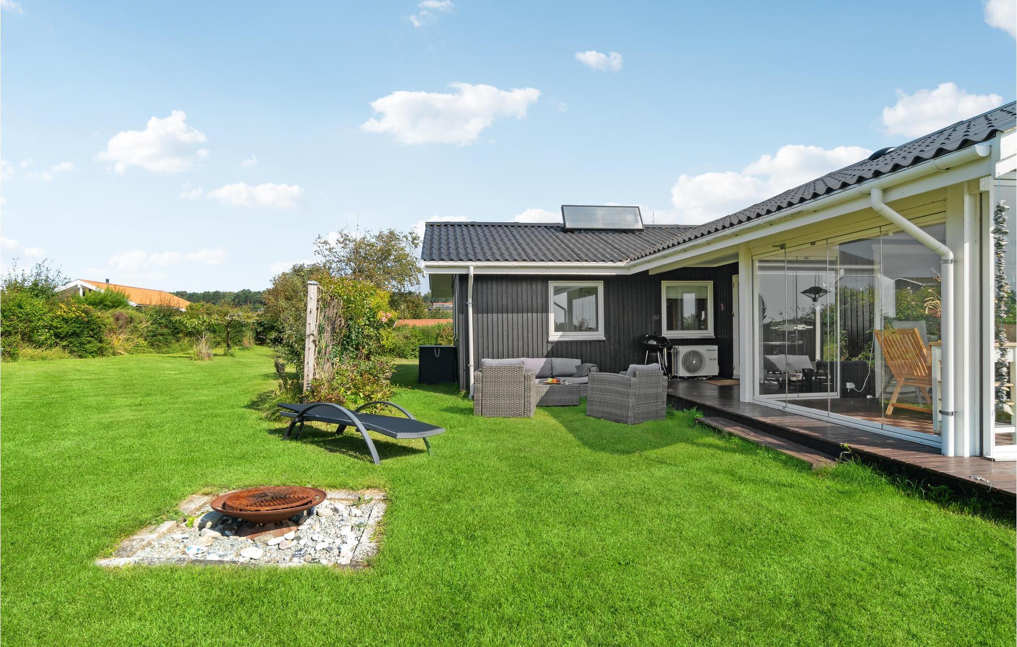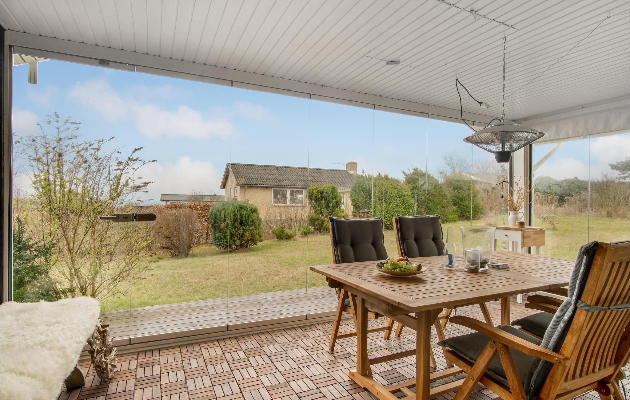 Charmantes Ferienhaus am Røsnæs Strand mit Kamin, Wintergarten und privatem Garten für entspannte Urlaubstage.