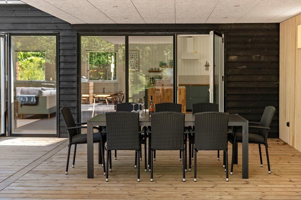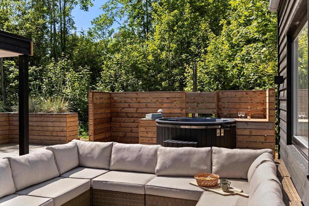 Die große Holzterrasse bietet beste Voraussetzungen für ausgedehnte Sonnenbäder und lange, entspannte Stunden mit einem guten Buch. Auf der großen, nach Westen ausgerichteten Terrasse laden Gartenmöbel zu gemeinsamen Frühstücken, Mittagessen und Grillabenden ein. Pure Erholung und Entspannung mit einem Hauch von Wellnessflair verspricht die schöne Schwedische Badetonne. Wenn es tatsächlich einmal regnen sollte, gelangst du trockenen Fußes vom Hausinneren auf den überdachten Terrassenbereich, der sich übrigens auch nach Einbruch der Dunkelheit sehr schön als gemütlicher Rückzugsort anbietet.