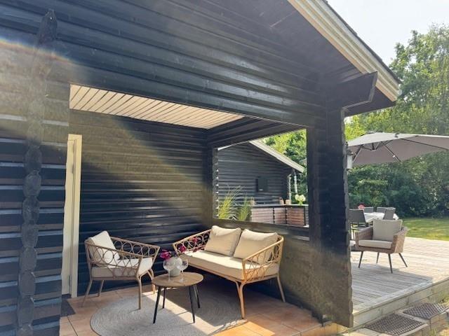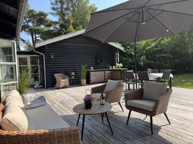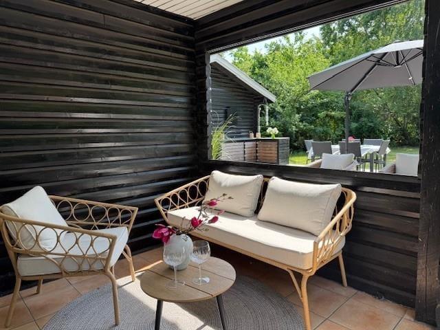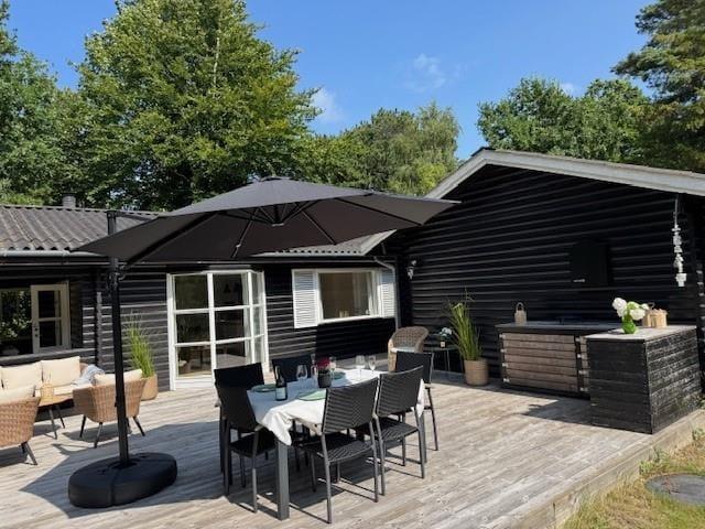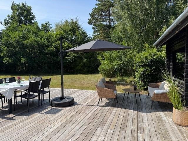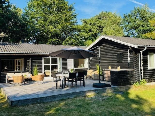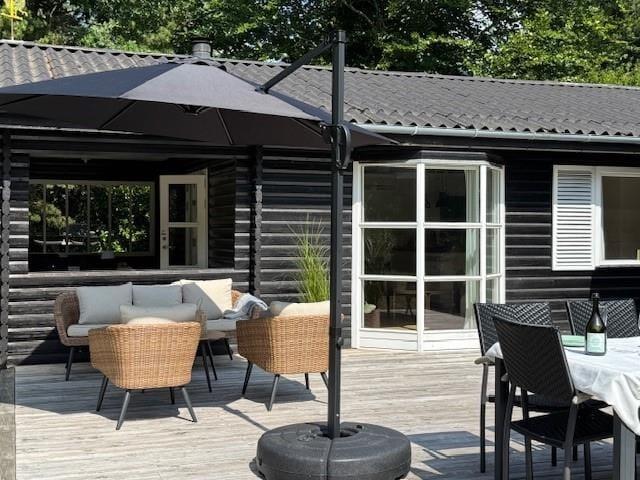 Das Haus ausstrahlt Ruhe und Entspannung mit mehreren gemütlichen Ecken und kleinen Lounge-Gebieten, innen sowie draußen. Die Einrichtung ist geschmackvoll und durchgeführt, mit ruhigen Farben, Gebrauch von Holz und mit Fokus auf Komfort, Entspannung und Qualität. Das Haus erbietet eine große Außenterrasse von 60M2 mit großem Essbereich, Außenlounge mit weichen Sofa und Sesseln, einer Sektion für das Sonnenbaden mit Sonnenbetten, großem verrückbarem Sonnenschirm und Außenbar mit Darts. Es gibt auch eine überdachte Terrasse mit tollem Essbereich sowie noch einem Lounge-Gebiet mit weichen Sofa und Sesseln. Als zusätzliche Verwöhnung erbietet das Haus einen neuen Morsø offenen Kamin, der gemütliche Stunden beim Feuer schaffen sowie auch als Heizung fungieren kann, und als Pizza-Ofen (mit Brennholz das Sie im Zuschlag kaufen müssen).