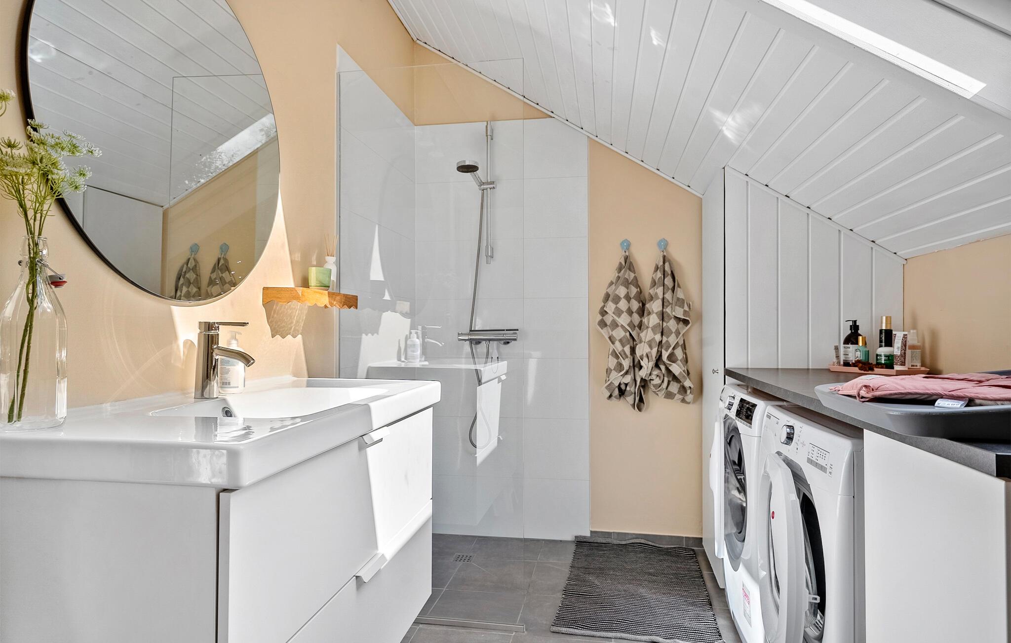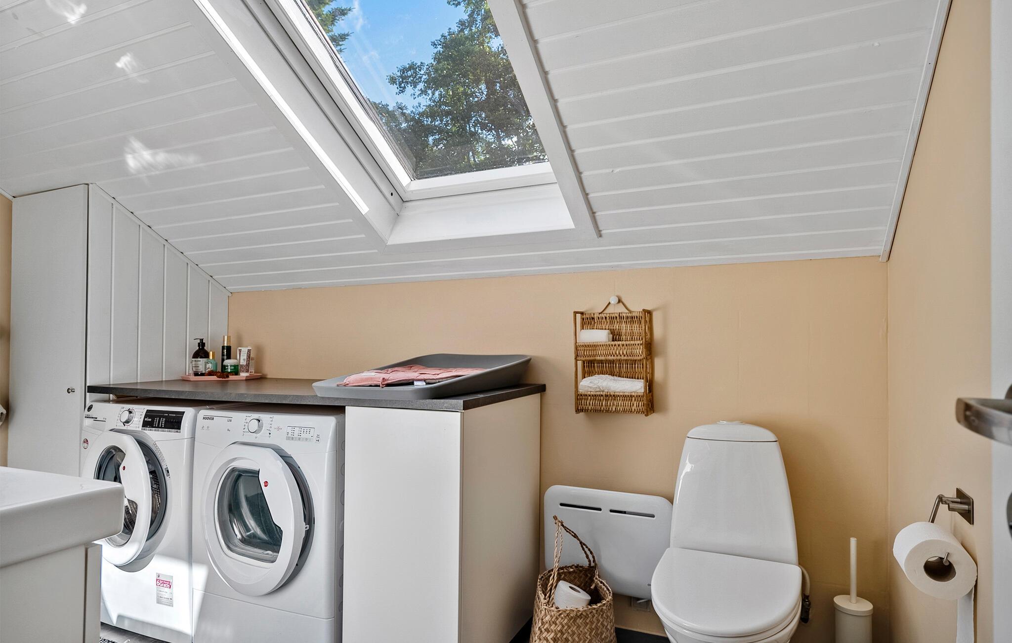 Dieses großzügige Haus empfängt Sie mit einer offenen Raumaufteilung und viel Tageslicht. Der Wohnbereich ist hell und einladend gestaltet. Nutzen Sie die Sofaecken zum Ausruhen, Spielen oder Lesen. Die hohen Decken und Dachfenster schaffen ein luftiges Wohngefühl, das sich schön mit dem natürlichen Holzkonzept ergänzt. Kochen Sie gemeinsam in der modernen, offenen Küche, die mit hochwertiger Ausstattung und direktem Zugang zur Terrasse punktet. Nehmen Sie Ihre Mahlzeiten am Esstisch ein oder genießen Sie sie draußen unter dem Vordach.