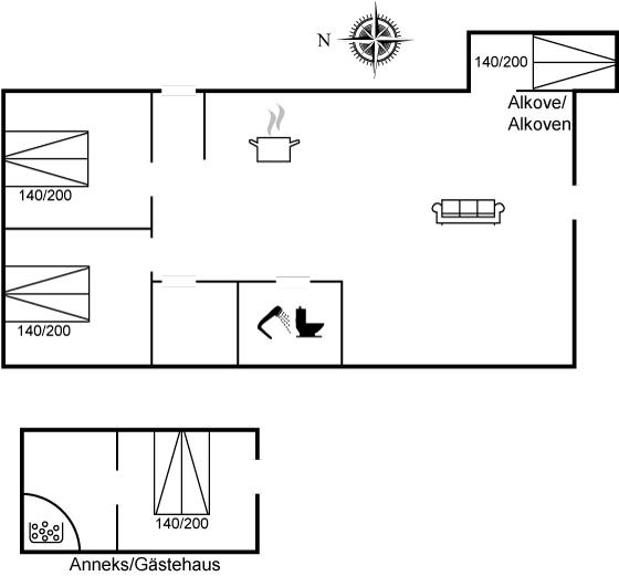 Die Schlafplätze verteilen sich auf 2 Schlafräume. 6 Schlafplätze in Doppelbetten.2 Schlafplätze im Alkoven. 2 von diesen Schlafplätzen befinden sich im Gästehaus. Fußbodenheizung im Gästehaus.