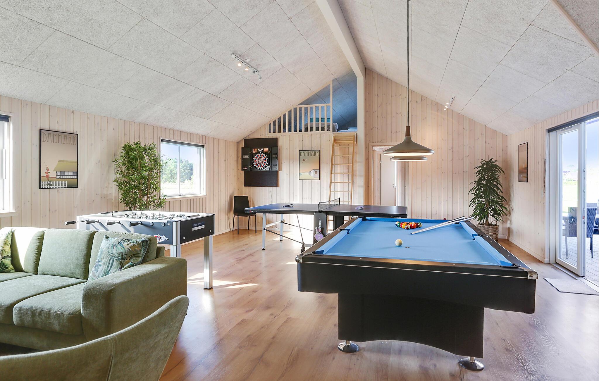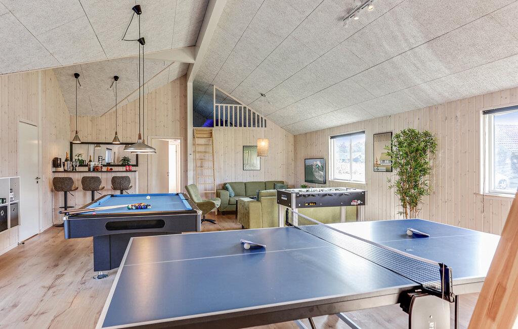 Großes und gut ausgestattetes Ferienhaus am Råbylille Strand, mit vielen aufregenden Details und Aktivitäten. Der Poolbereich verfügt über einen großen Pool, einen eingebauten Whirlpool für vier Personen und eine Sauna. Der Pool ist 20 m² groß und verfügt über eine Rutsche für die Kinder. Es gibt auch einen Schwimmtrainer, mit dem Sie Ihre Fitness verbessern können. Im Aktivitätsraum gibt es genug Unterhaltung für den ganzen Urlaub, Sie finden hier Kicker, Billard, elektrisches Darts und Tischtennis.