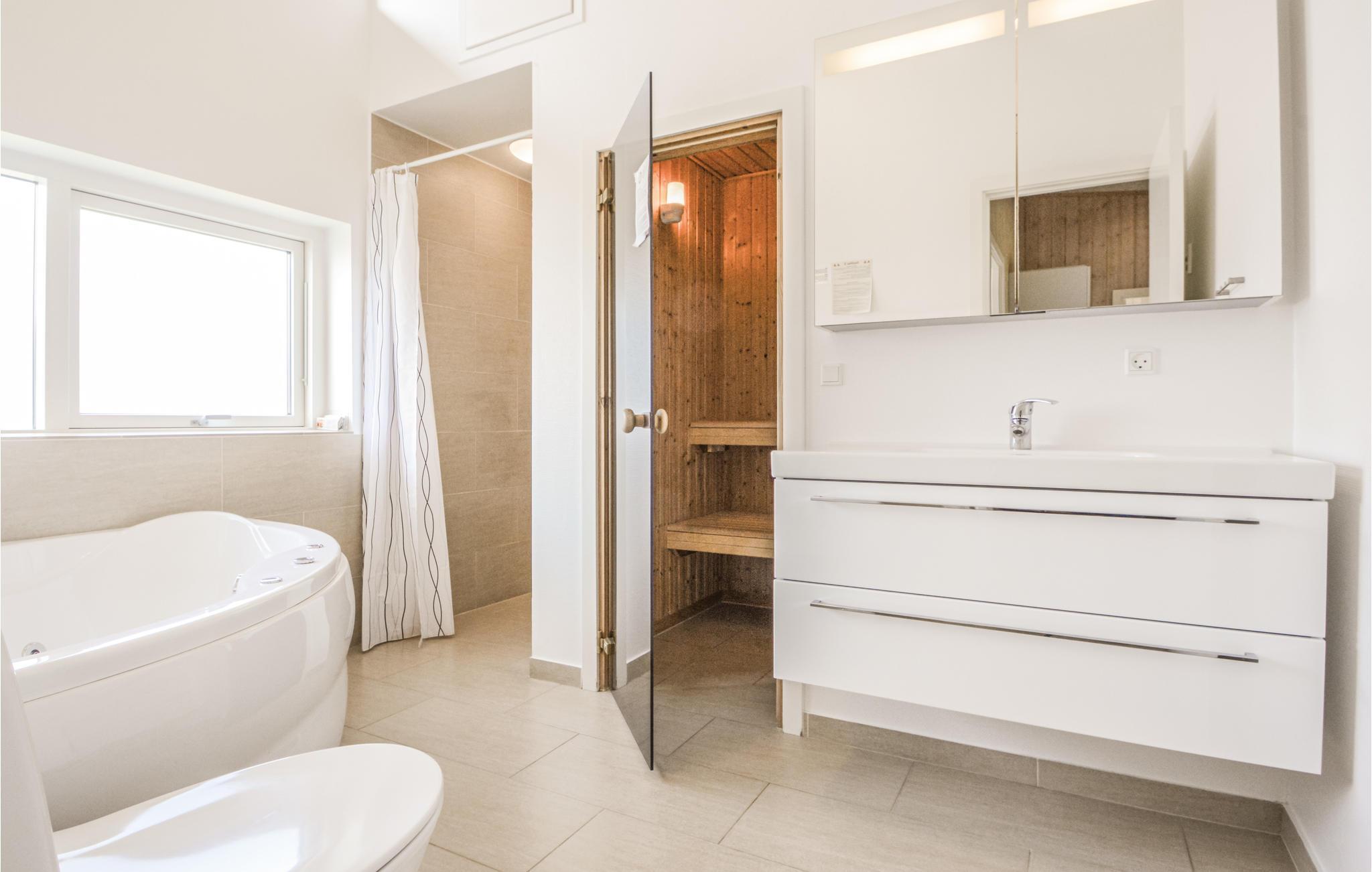Es gibt vier Schlafzimmer, ein großes Badezimmer mit Dusche und Whirlpool und ein weiteres, kleines Bad mit Dusche. Vom großen Bad haben Sie direkten Zugang zur Sauna.