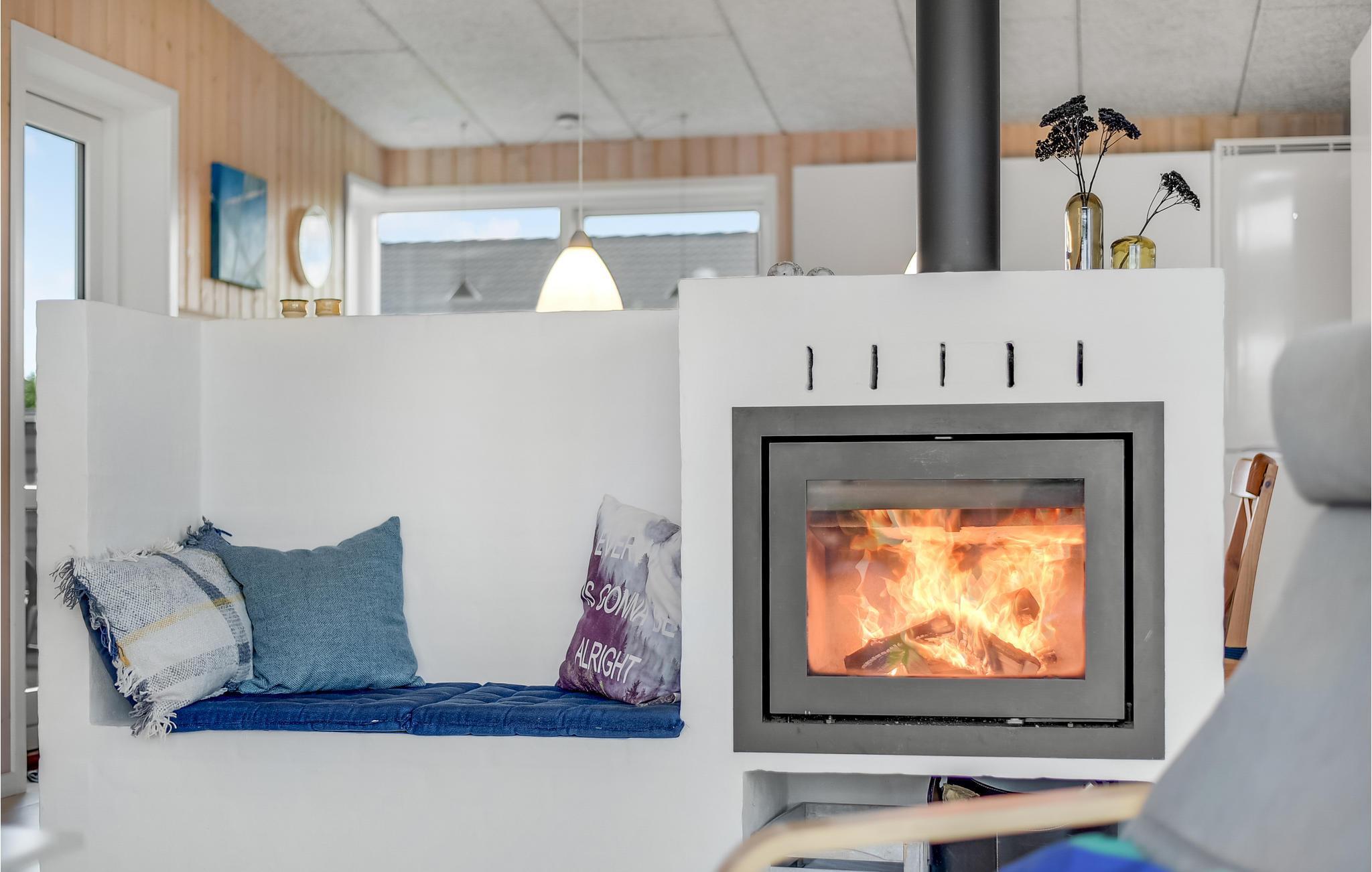 Im Inneren des Hauses vereinen sich die große Wohnküche, die vom Wohnbereich und seinem Kaminofen durch eine halbhohe Mauer getrennt ist und das Wohnzimmer. Schön, wenn Sie beim Kochen mit der Familie kommunizieren möchten.