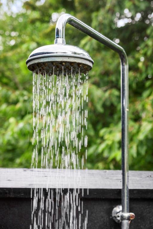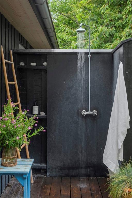 Die Terrasse ist mit guten Sitzgelegenheiten und einer erfrischenden Außendusche ausgestattet, ideal für heiße Sommertage, nach dem Strandausflug.