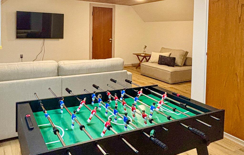 Dieses geräumige Haus bietet Ihnen alles, was Sie für eine entspannte Auszeit vom Alltag benötigen. Durch große Fenster fällt viel warmes Tageslicht ins Innere, während Sie gemütlich bei einer Tasse Kaffee plaudern. Kommen Sie hier zur Ruhe, tanken Sie neue Energie bei einem vergnügten Filmabend oder beim gemeinsamen Kochen. Wenn Sie Lust auf Spiel und Spaß haben, spielen Sie eine Runde Tischfußball.