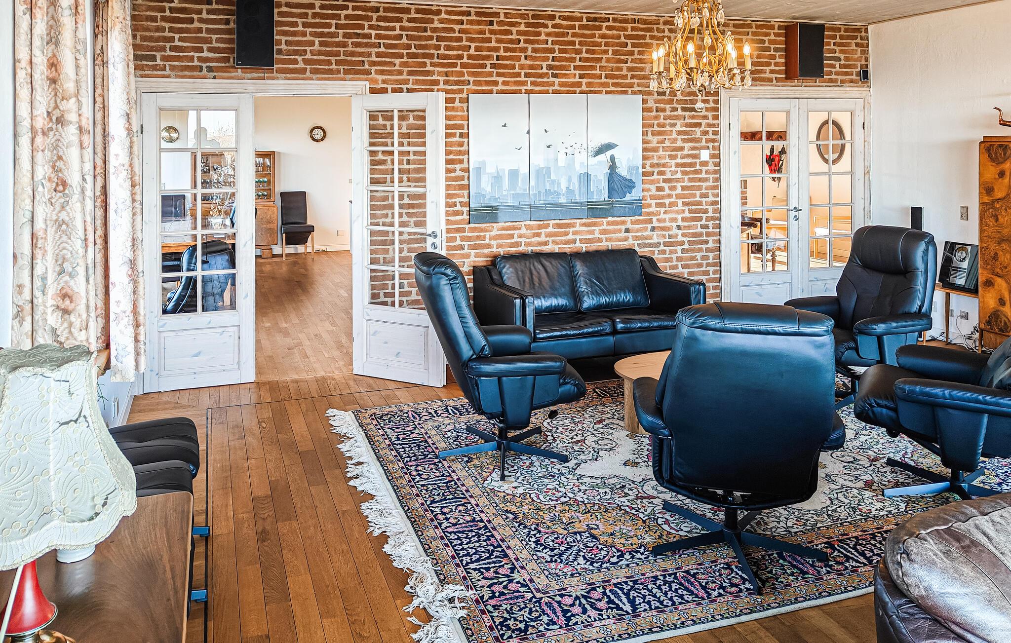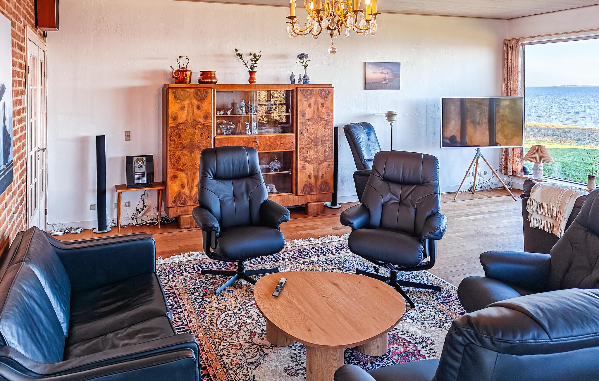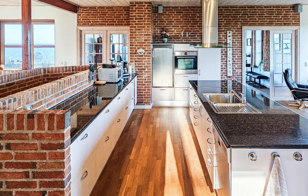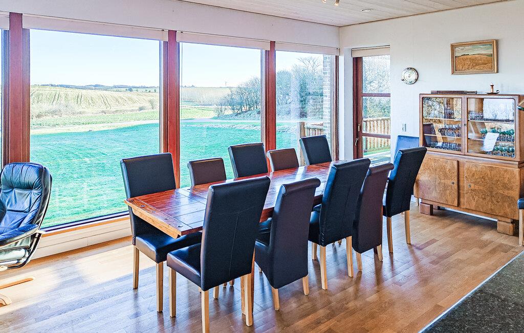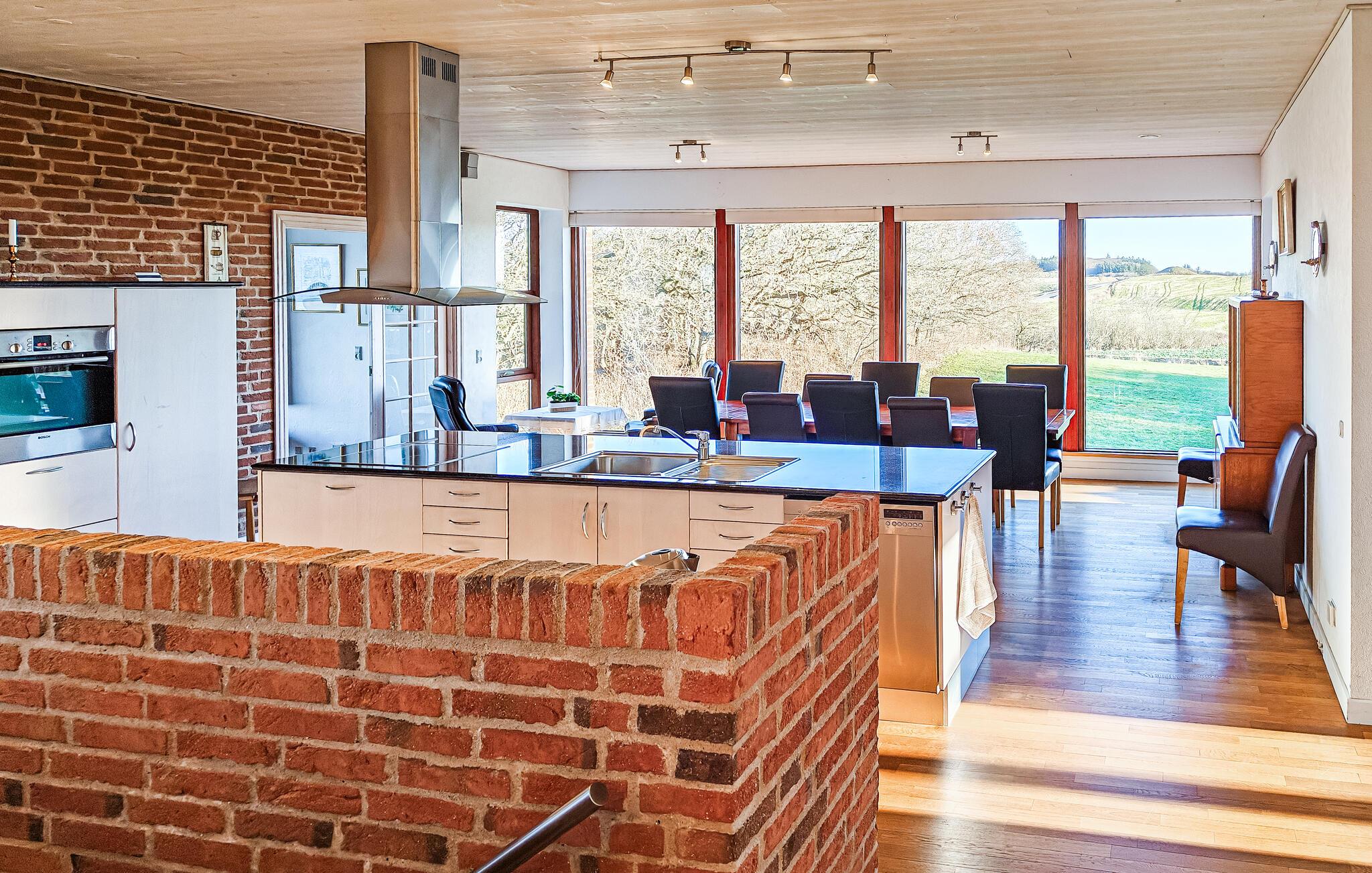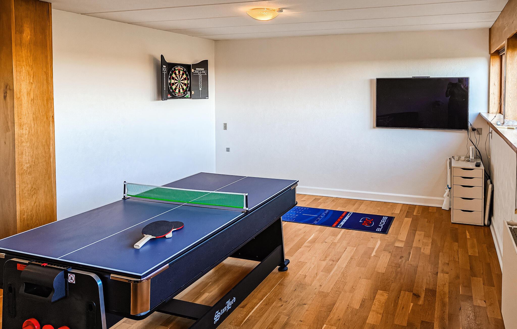 Der Innenbereich Ihres Hauses wirkt offen und einladend. Nutzen Sie den lichtdurchfluteten Wohnraum mit seinen gemütlichen Sitzgruppen, um entspannte Stunden zu verbringen. Die beiden großen Essbereiche bieten ausreichend Platz für gemeinsame Mahlzeiten mit Blick auf den Limfjorden. Bereiten Sie Ihre Speisen in der schön eingerichteten Küche mit Platz für große und kleine Familienköche zu. Spielen Sie anschließend eine Runde Tischtennis oder Dart.
