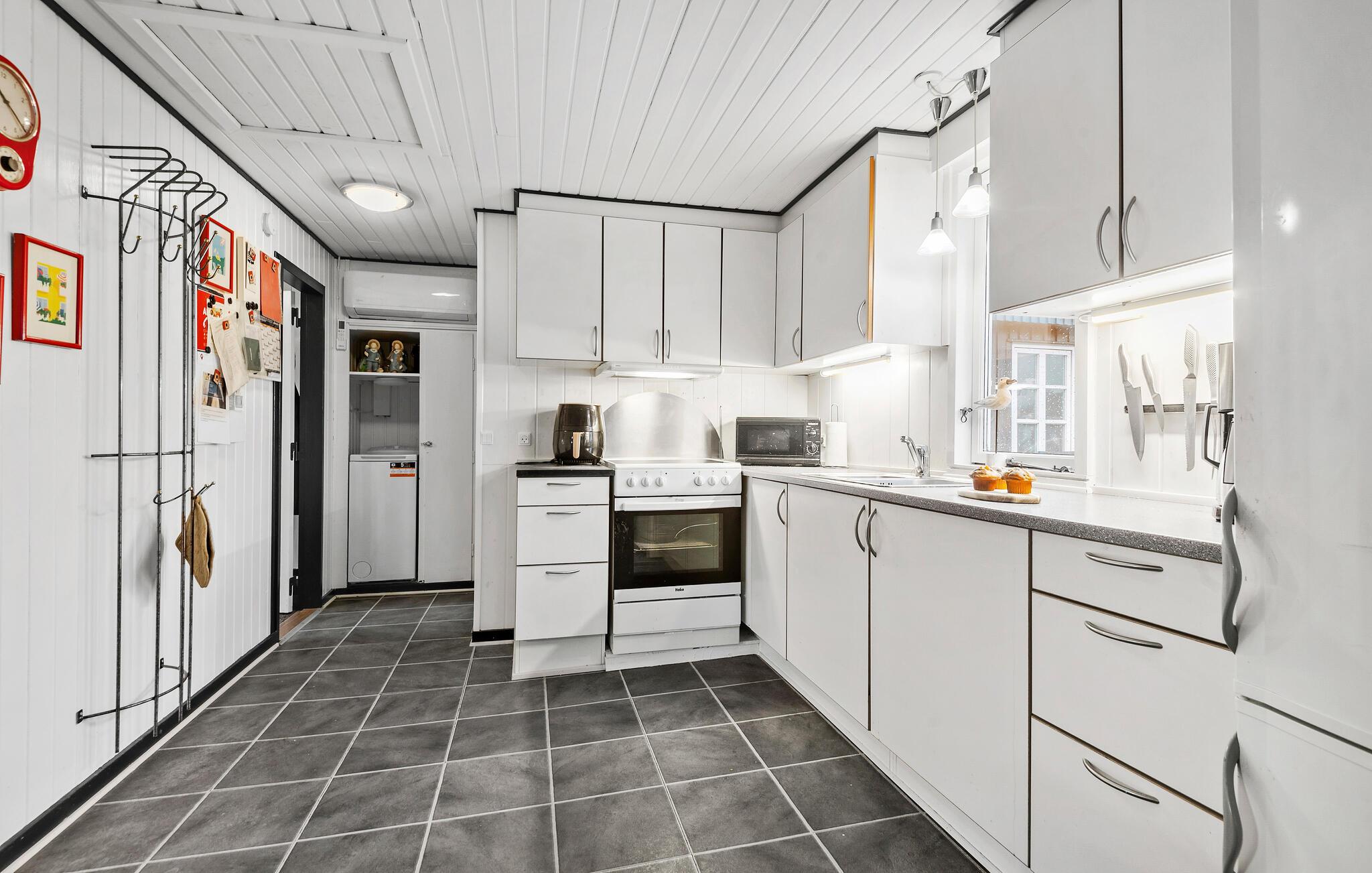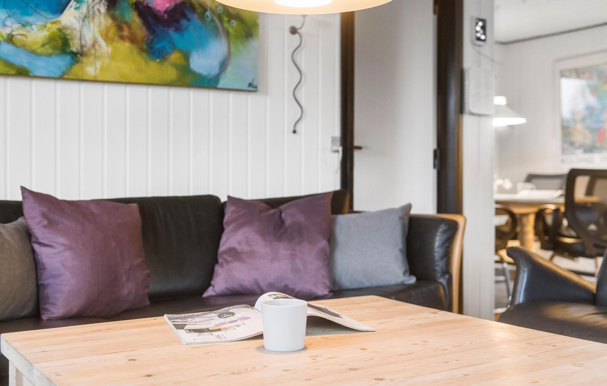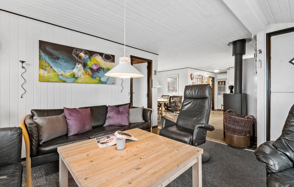 Ihr Ferienhaus liegt am Ende einer ruhigen Stichstraße in der Ferienhaussiedlung von Rindby. Eingebettet in ein hügeliges Gelände bietet es eine geschützte Lage, ideal für einen entspannten Urlaub. Die Einrichtung des Hauses ist funktional, mit einer offenen Küche, die in den Wohn- und Essbereich übergeht. Der Kaminofen im Wohnzimmer sorgt an kühleren Tagen für eine angenehme Atmosphäre.
