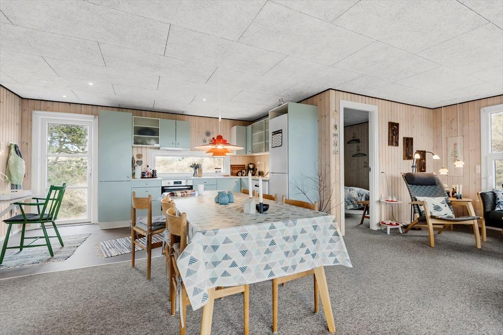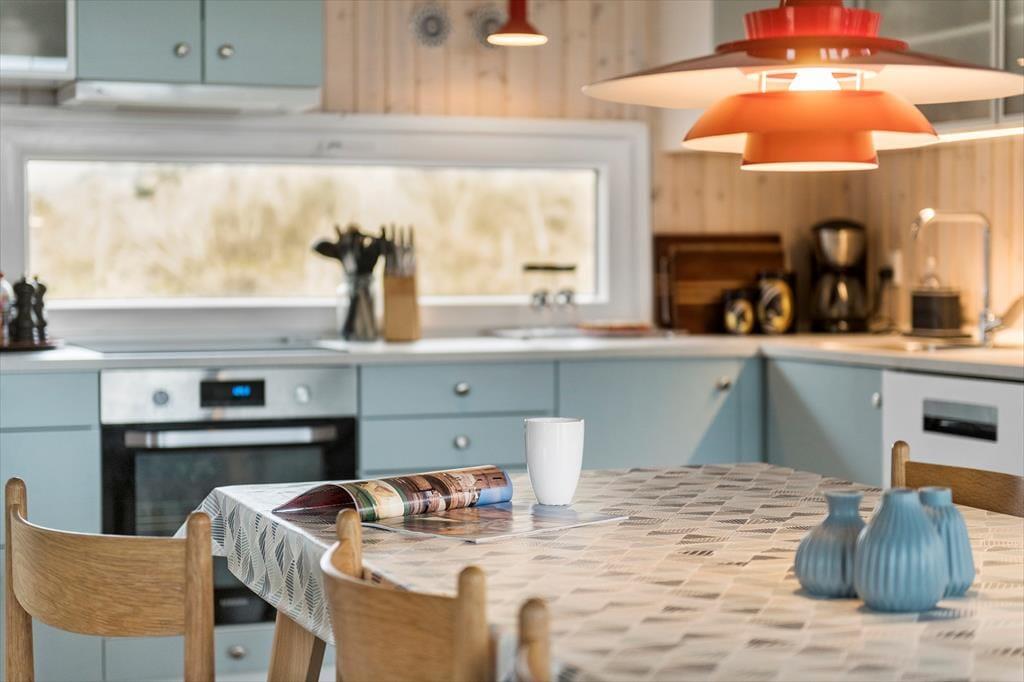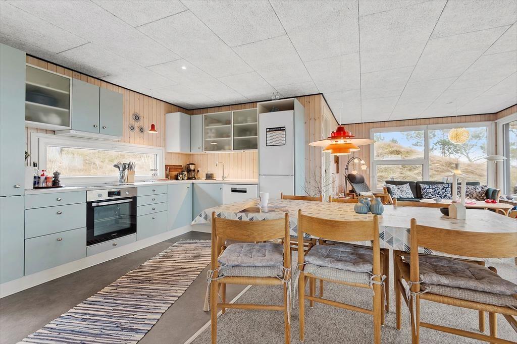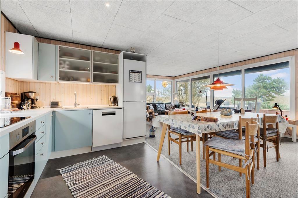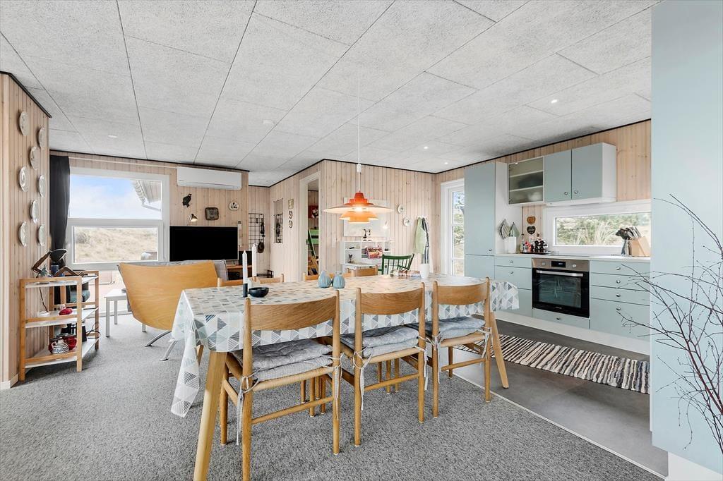 Das Ferienhaus hat eine schöne Lage in den Dünen, so dass du direkt auf die sanften Gräser und die gewundenen Kiefern blicken kannst, aber auch über die Umgebung hinaus. Besonders im Wohnzimmer sorgen die großen Fenster dafür, dass Licht und Natur hereinströmen, und auch wenn du drinnen entspannst, wirst du daran erinnert, dass du weit weg vom Alltag bist. Sowohl die Sofaecke als auch der Esstisch sind gemütliche Treffpunkte, und wenn ihr in der Familie gerne kocht, könnt ihr problemlos mehrere Personen in der offenen Küche unterbringen, um knackigen Salat zu schneiden oder duftende Eintöpfe zuzubereiten.